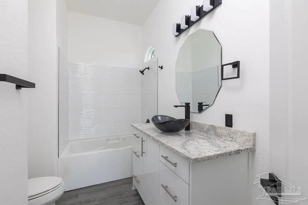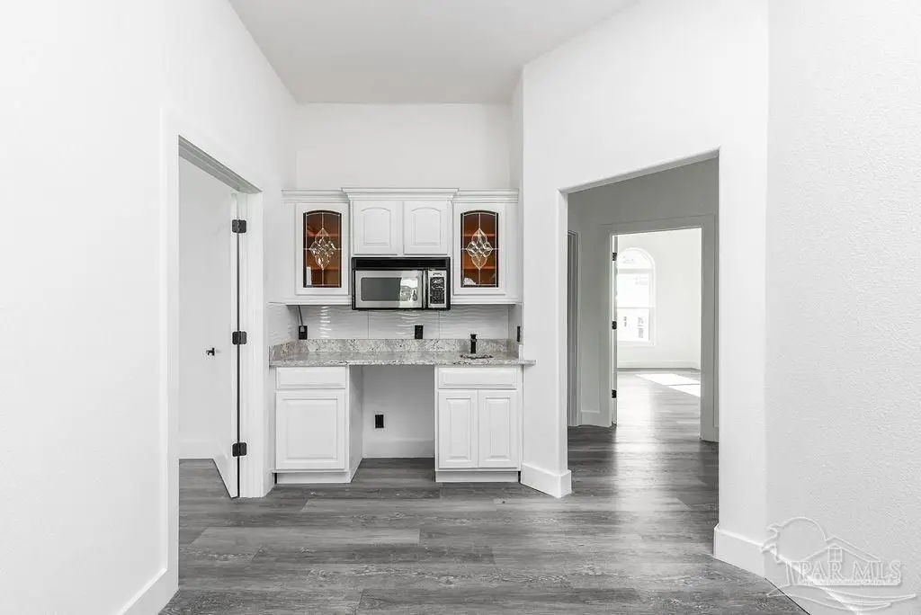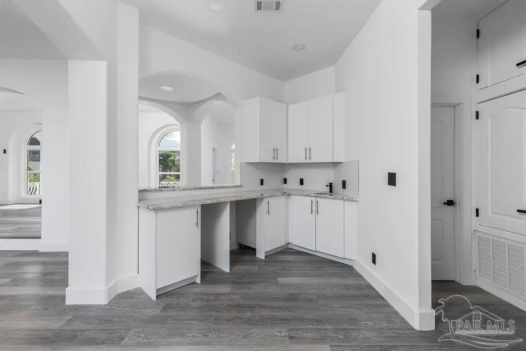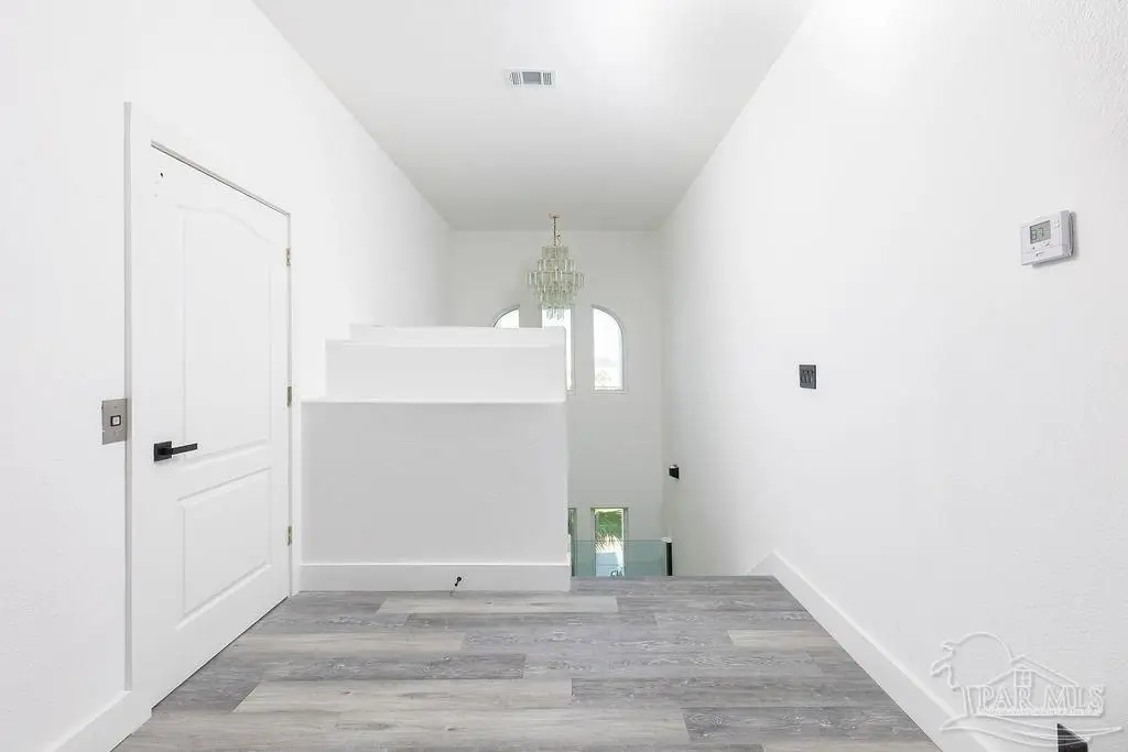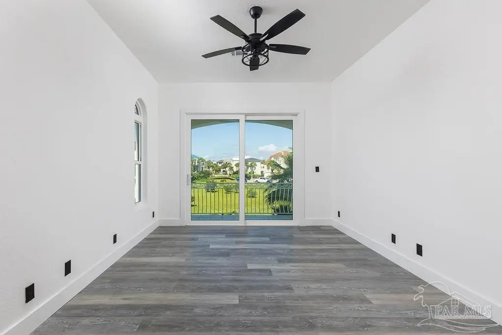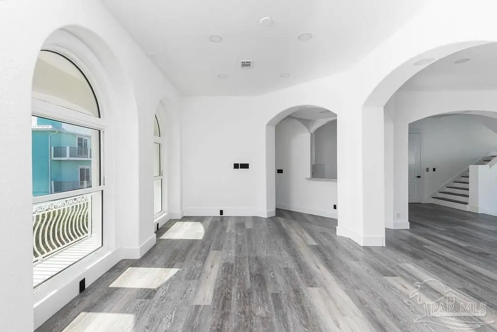 Newly renovated and over 5,000 square feet of total living space in the desired residential gated community of Deluna Point on Pensacola Beach. Direct access to Pensacola Bay and the Gulf of Mexico at the edge of preserved nature, the Gulf Islands National Seashore, make this a coveted location for those seeking the stillness life on an island brings. You've got 3,800 square feet, 6 balconies, 4 bedrooms, and 4.5 bathrooms above grade- plus a finished bottom floor giving you over 5,000 square feet of total living space, 2 extra bedrooms, and the possibility of 2 extra bathrooms. The 8 foot ornate French doors and the height of the entrance gives this home a stately posture. The formal entrance opens on a split level where there are two avenues of entering the main floor - the stairways, or the residential elevator that services all three floors. The main floor consists of the great room, formal dining room, the kitchen with eat-in-kitchen and breakfast bar utility, one bedroom with it's own full bathroom, a half bath for guests, three balconies, and a full service wet bar that holds the whole space together in the center. The kitchen features a large center island with granite counter tops perfect for meal preparation with its own basin sink, double ovens, an oversized sink for cleaning, and a stone finished backsplash for added texture. The full-size wet bar is meant to service the kitchen, the formal dining room, and the great room- wherever you find yourself entertaining family and friends. The bedroom on the main floor features its own balcony making it a great use for an in-home office. On the third floor you'll find 3 additional bedrooms and bathrooms, including that of the master suite and ensuite. Just off the kitchenette on the landing of the third floor, the mast suite is exquisite with a built in entertainment space, fireplace, and six piece ensuite. Armani marble props the jacuzzi tub up in the spotlight and builds out the features of the entire ensuite.