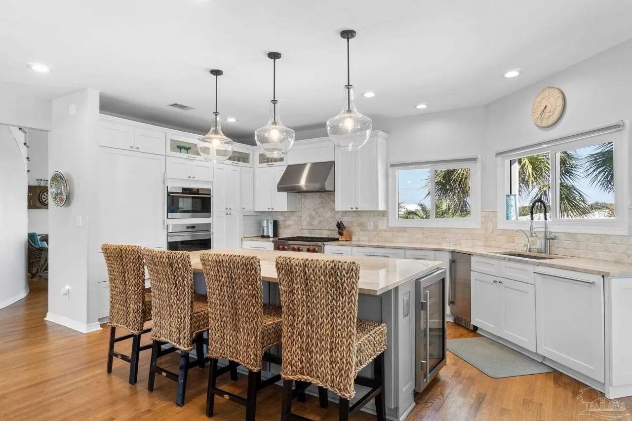 Experience the pinnacle of coastal living at 25 Calle Hermosa, a stunning stucco residence perfectly situated on Pensacola Beach. Inside, rich hardwood floors flow throughout the meticulously renovated interiors, creating a warm and sophisticated ambiance. The gourmet kitchen is a culinary masterpiece, featuring top-of-the-line Sub-Zero and Wolf appliances, custom-crafted cabinetry, and expansive countertops designed for both everyday meals and entertaining. The primary bedroom is a serene retreat, complete with a private balcony offering Gulf views, ideal for savoring morning sunrises or tranquil sunsets over the sparkling waters. The fully updated bathrooms exude spa-inspired elegance with contemporary fixtures and premium materials. A graceful winding staircase leads to an inviting upstairs sitting area with balcony, perfect for relaxation, and three additional well-appointed bedrooms. Outside, the backyard is a private paradise, centered around a shimmering gunite pool and spa, surrounded by pavers that guide you to a charming fire pit area-perfect for hosting gatherings or enjoying tranquil evenings under the stars. This exquisite home boasts an oversized garage, ideal for vehicles, beach gear, or a workshop for seaside hobbies. With exclusive neighborhood Gulf access just steps away and the vibrant Pensacola Beach restaurants just minutes away, this home seamlessly blends modern luxury with coastal serenity, making it a rare gem for discerning buyers.