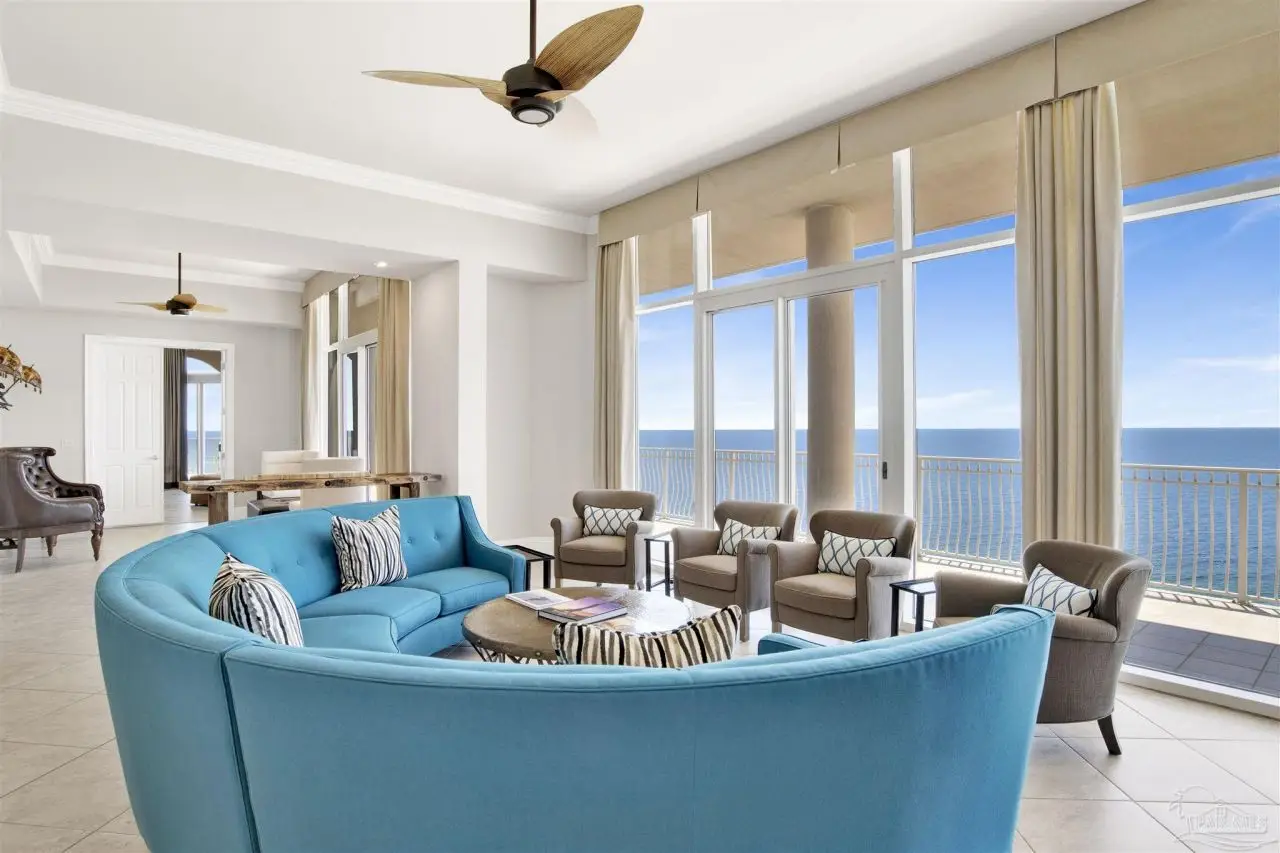 EXPERIENCE THE PINNACLE OF LUXURY IN THIS STUNNING PENTHOUSE OCCUPYING THE ENTIRE 14TH FLOOR OF LA RIVA EAST. BOASTING 4,868 SQ FT OF EXQUISITE LIVING SPACE AND AN EXPANSIVE 2,982 SQ FT BALCONY, THIS RESIDENCE OFFERS BREATHTAKING PANORAMIC VIEWS OF THE GULF AND PERDIDO KEY. This exceptional home features 5 spacious bedrooms, including both Primary and Secondary Gulf-front suites, situated at opposite ends of the residence to ensure ultimate privacy. Enjoy the convenience of a private elevator lobby, abundant storage space, and PREMIUM DEEDED GARAGE PARKING DIRECTLY IN FRON TOF THE BUILDING AND UNDER THE PORTICO. A double garage with storage is also available for purchase across the street (ask for details). Inside, discover a gourmet chef's kitchen with island and large breakfast bar, a fabulous separate wet bar, a large utility room, and spacious living and dining areas with floor-to-ceiling glass with motorized window coverings. Retreat to the Primary Bedroom Suite with its stunning sunrise views, dual walk-in closets, and a spa-like bathroom featuring a luxurious jetted tub and separate tiled shower. All three additional guest bedrooms are spacious with two enjoying lovely panoramic island views, one with private balcony, and the third with two sets of custom bunk beds. La Riva owners enjoy privacy & uncrowded beaches with only 66 rent-restricted units (1-year minimum lease) and 520' of sugar white sands. La Riva EAST is the only La Riva building with a theater room! La Riva owners and guests enjoy the best of amenities including a gulf-front heated indoor pool, outdoor pool and hot tub, and well-equipped fitness center with steam and sauna overlooking the beach. THE VIEWS FROM THIS PENTHOUSE RESIDENCE ARE TRULY A MUST SEE!