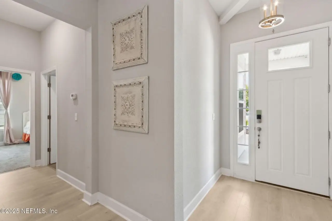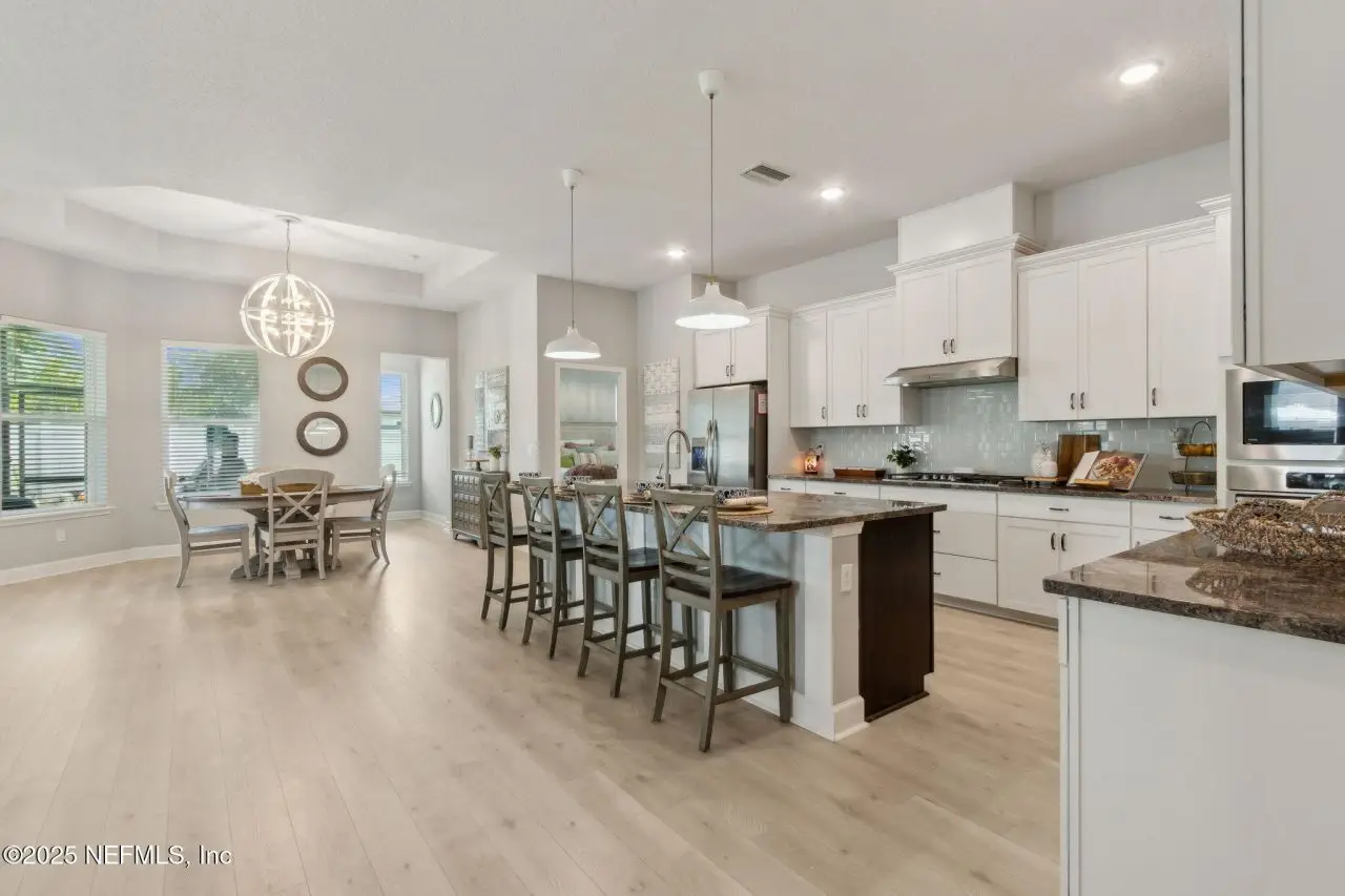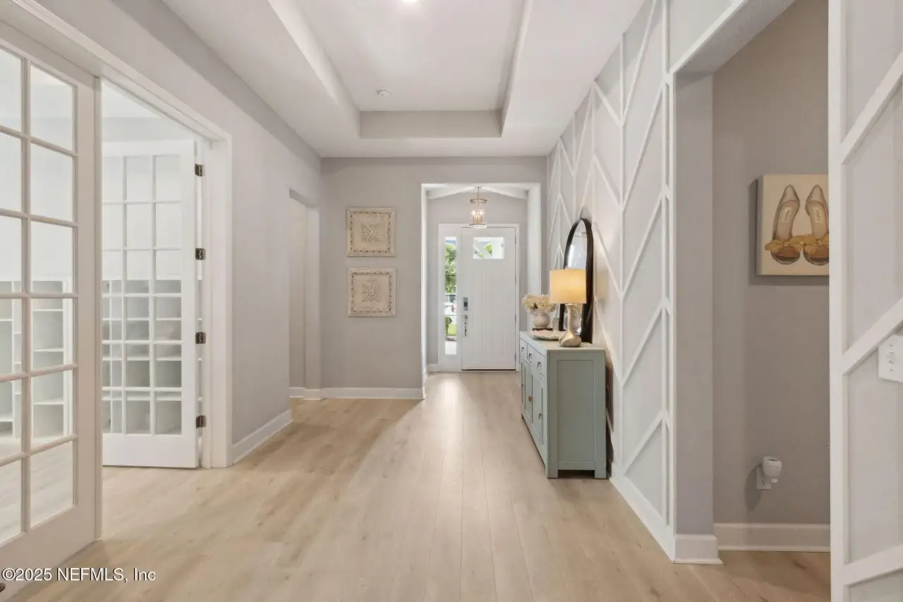 Welcome to 101 Bucktail Avenue - A Stunning Providence Home in Nocatee. This beautifully designed Ellaville model by Providence Homes offers the perfect blend of luxury, comfort, and energy efficiency - all nestled in the highly sought-after Outlook at Twenty Mile neighborhood in Nocatee. With 4 bedrooms, 3 full baths, and a 2-car garage plus a separate 1-car garage, this 100% Energy Star Certified one-story home is as functional as it is stylish. From the manicured landscaping to the elegant exterior, this home impresses from the start. Step inside to a warm and welcoming foyer with a custom chevron wood accent wall, setting the tone for the quality and craftsmanship throughout. At the heart of the home is a chef-inspired kitchen featuring white shaker cabinetry, granite countertops, stainless steel appliances, gas range, oversized island, and walk-in pantry. Opening seamlessly to a bright cafe dining area and spacious family room filled with natural light - perfect for everyday living and entertaining. Just off the cafe is a pocket office - an ideal tucked-away workspace for remote work, homework, or household planning. Nearby, the formal dining/living room with French doors offers flexibility for hosting or additional living space. The private primary suite is a serene retreat, complete with space for a seating area, a large walk-in closet, and a spa-inspired bath with soaking tub, walk-in shower with custom tile and rainhead, and split vanities with a dedicated makeup counter. The laundry room connects directly to the primary closet and also has hallway access for added ease. Three additional bedrooms are located on the opposite side of the home. Two share a Jack-and-Jill bath, while the third is near a full guest bath - ideal for visitors, teens, or versatile use. Additional features include a built-in drop zone with storage near the garage entry, a spacious laundry room with folding space, and a 2-car garage plus a separate 1-car garage bay - perfect for a golf cart, workshop, or extra storage. Enjoy the incredible lifestyle that Nocatee offers - top-rated St. Johns County schools, resort-style amenities, miles of trails, splash parks, community events, and a close-knit neighborhood vibe. All just minutes from beaches, shopping, dining, and major roadways. LOVE WHERE YOU LIVE!