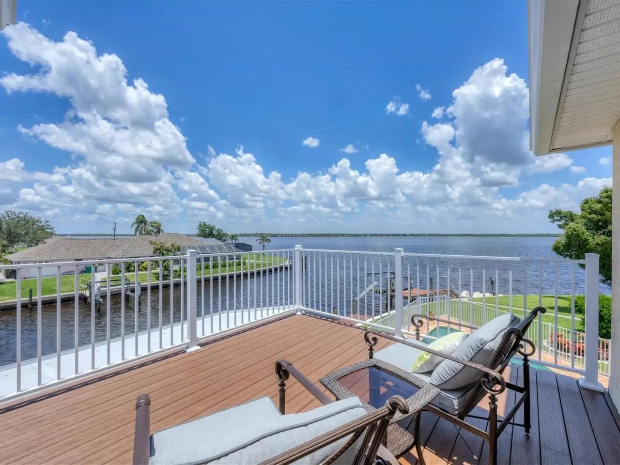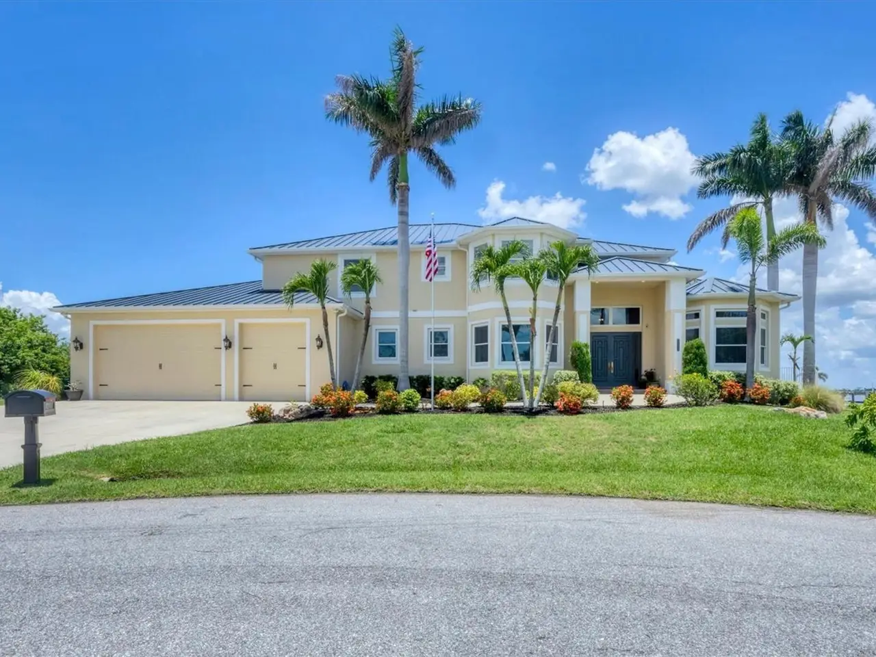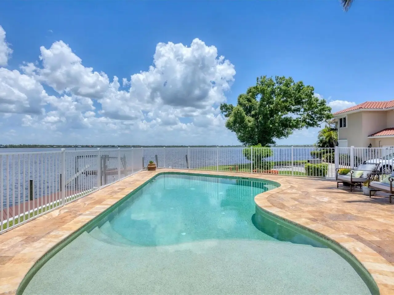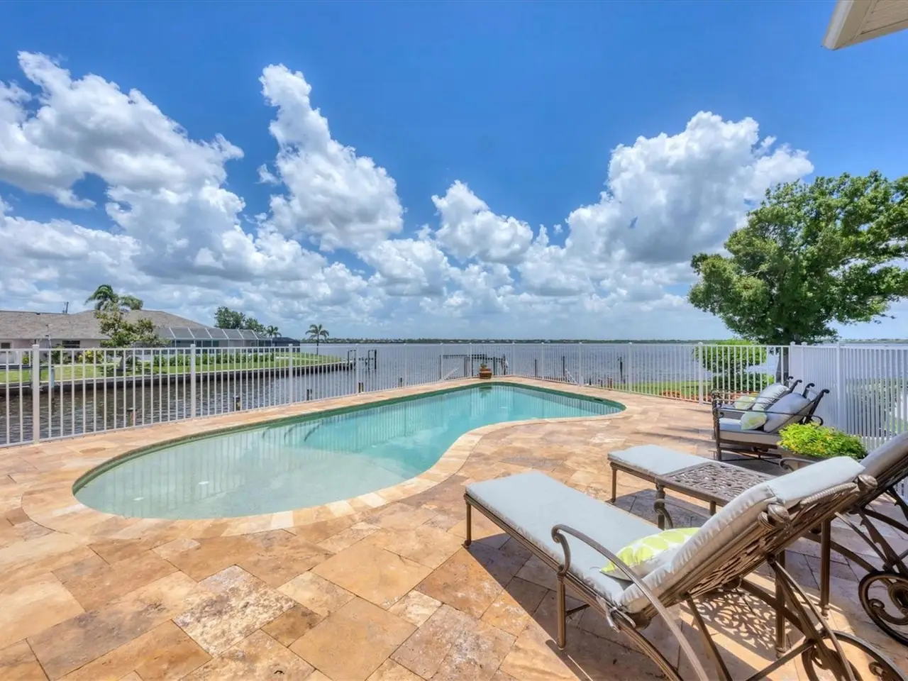 Introducing "River Breeze at Paradise Point" the whimsical name of this breathtaking property, affectionately bestowed by the current owners. This stunning waterfront estate, stretching across 0.39 acres, is perched along the Myakka River with quick access to Charlotte Harbor and a 30-minute boat ride to the Gulf. It's every boater's dream to the best fishing in Southwest Florida, featuring 185 feet of concrete seawall, a 167-foot captain's walk, and a 2023 metal-roofed boathouse with a 16,000 lb remote-controlled boat lift. Enjoy dolphin, manatee, and bald eagle sightings, or cast a line for record snook, world-renown tarpon, and redfish all from your backyard. The home offers 3,825 sq ft of living space and a spacious, well-organized 1,327 sq ft 4+ car garage with 10.5-foot ceilings. Inside, the soaring 20-foot foyer with a sweeping staircase leads into a bright music room with 12-foot bamboo tray ceiling, and an entertainer's dream kitchen featuring a massive quartz island, updated cabinetry, stainless appliances, and three built-in dishwashers. The kitchen flows seamlessly into the dining and bar areas and out to a 56-foot screened patio and extended lanai perfect for year-round indoor-outdoor living. Step out to the heated saltwater pool, surrounded by open-air lounge space ideal for relaxing in the Florida sunshine. The primary suite is a private retreat with a sitting area, two walk-in closets, a luxurious 14x14 bathroom with a 5x7 glass shower, and direct access to a private waterfront balcony. The primary guest suite also features a private balcony and river views. Every bedroom is en suite, ensuring comfort and privacy for guests. Throughout the home, enjoy travertine and engineered wood flooring with porcelain tile in 2nd level bathrooms, detailed crown molding, and abundant storage including multiple custom closets. Additional recent upgrades include a new standing seam metal roof (house and boathouse), two new A/C units with whole-home UV filtration, spray foam insulation, PECS plumbing system, impact-resistant windows and doors throughout, and fresh interior/exterior paint. The pool features a new heat pump, chlorine generator, and variable-speed pump, while rebuilt decks and upgraded kitchen and baths further elevate the home's quality and style. Tucked away in Gulf Cove, a hidden gem community known for its quiet streets, friendly neighbors, and walkable, bike-friendly atmosphere, this exceptional home offers luxury, comfort, and breathtaking water views delivering unmatched waterfront living in a peaceful coastal setting.
