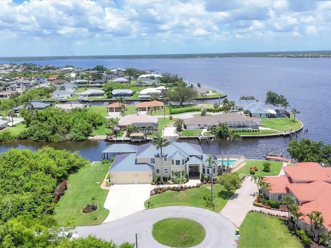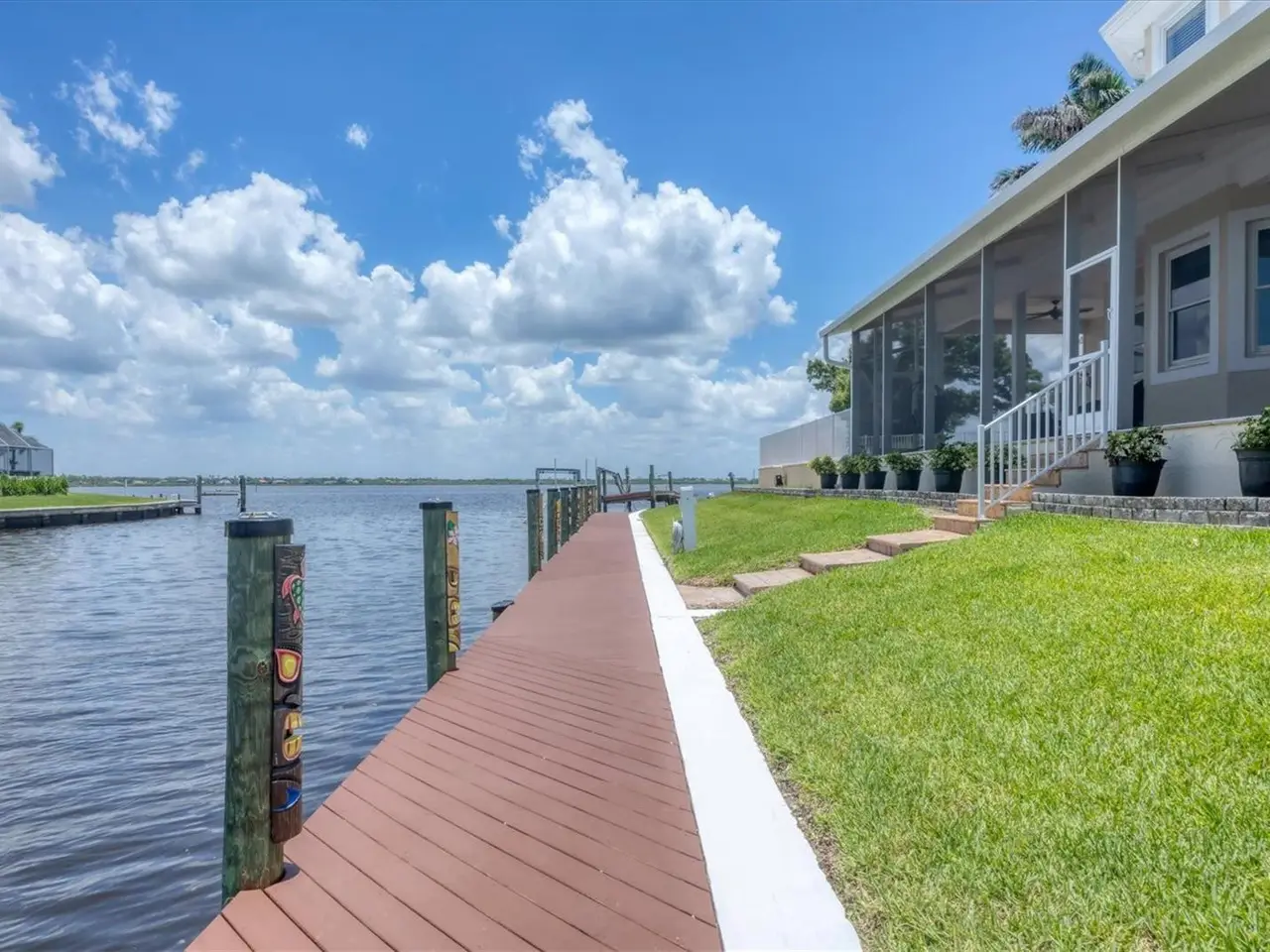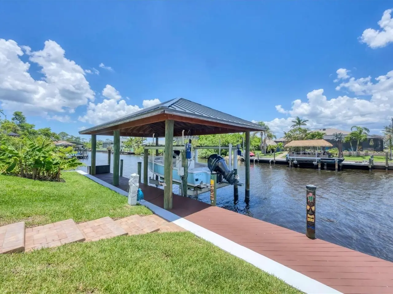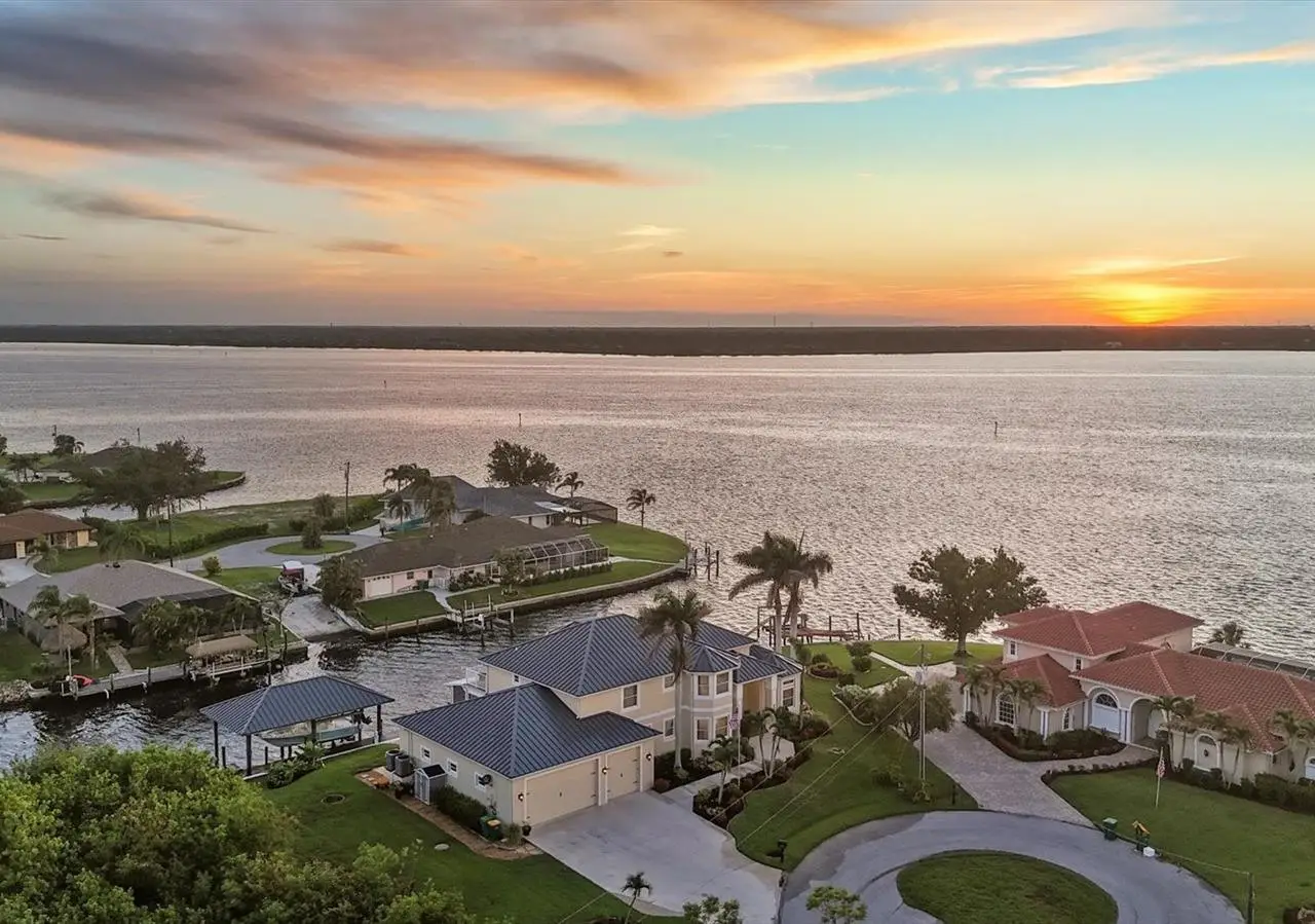 Introducing "River Breeze at Paradise Point" the whimsical name of this breathtaking property, affectionately bestowed by the current owners. This stunning waterfront estate, stretching across 0.39 acres, is perched along the Myakka River with quick access to Charlotte Harbor and a 30-minute boat ride to the Gulf. It's every boater's dream to the best fishing in Southwest Florida, featuring 185 feet of concrete seawall, a 167-foot captain's walk, and a 2023 metal-roofed boathouse with a 16,000 lb remote-controlled boat lift. Enjoy dolphin, manatee, and bald eagle sightings, or cast a line for record snook, world-renown tarpon, and redfish all from your backyard. The home offers 3,825 sq ft of living space and a spacious, well-organized 1,327 sq ft 4+ car garage with 10.5-foot ceilings. Inside, the soaring 20-foot foyer with a sweeping staircase leads into a bright music room with 12-foot bamboo tray ceiling, and an entertainer's dream kitchen featuring a massive quartz island, updated cabinetry, stainless appliances, and three built-in dishwashers. The kitchen flows seamlessly into the dining and bar areas and out to a 56-foot screened patio and extended lanai perfect for year-round indoor-outdoor living. Step out to the heated saltwater pool, surrounded by open-air lounge space ideal for relaxing in the Florida sunshine. The primary suite is a private retreat with a sitting area, two walk-in closets, a luxurious 14x14 bathroom with a 5x7 glass shower, and direct access to a private waterfront balcony. The primary guest suite also features a private balcony and river views. Every bedroom is en suite, ensuring comfort and privacy for guests. Throughout the home, enjoy travertine and engineered wood flooring with porcelain tile in 2nd level bathrooms, detailed crown molding, and abundant storage including multiple custom closets. Additional recent upgrades include a new standing seam metal roof (house and boathouse), two new A/C units with whole-home UV filtration, spray foam insulation, PECS plumbing system, impact-resistant windows and doors throughout, and fresh interior/exterior paint. The pool features a new heat pump, chlorine generator, and variable-speed pump, while rebuilt decks and upgraded kitchen and baths further elevate the home's quality and style. Tucked away in Gulf Cove, a hidden gem community known for its quiet streets, friendly neighbors, and walkable, bike-friendly atmosphere, this exceptional home offers luxury, comfort, and breathtaking water views delivering unmatched waterfront living in a peaceful coastal setting.