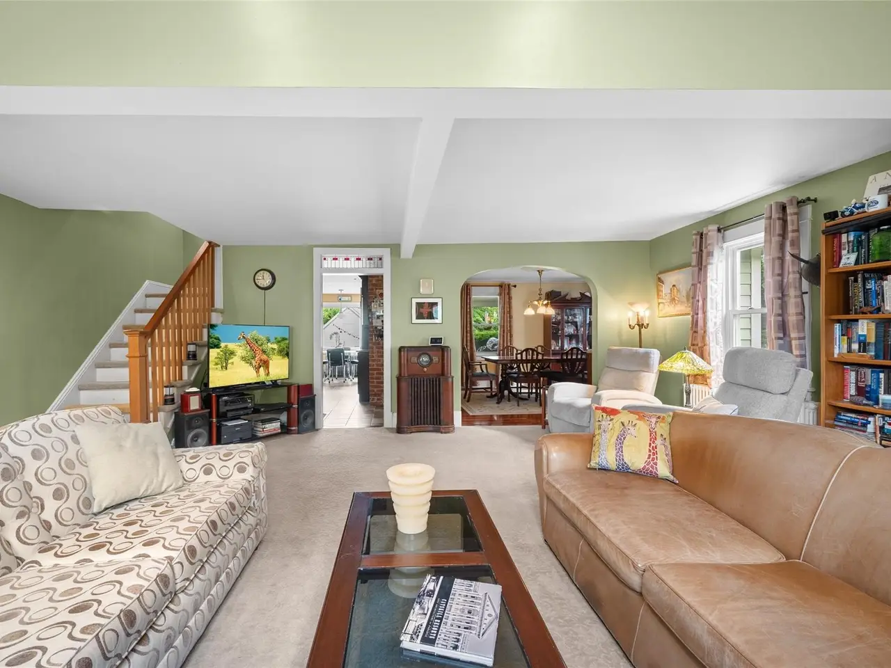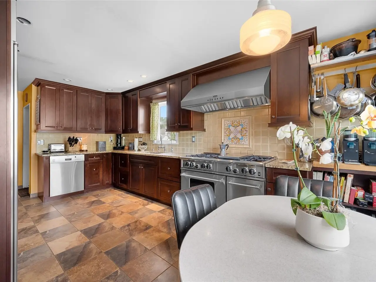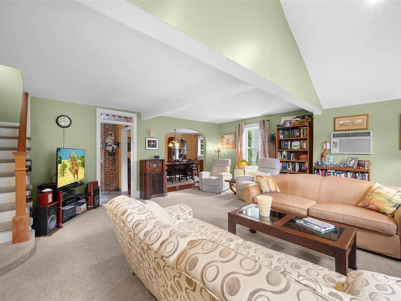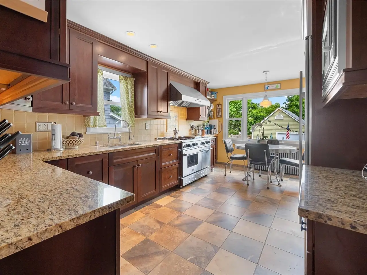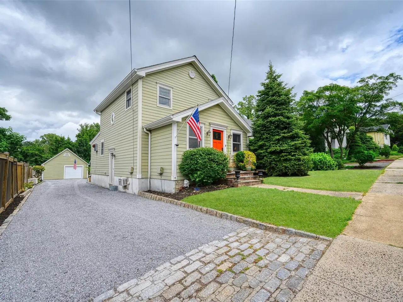 Welcome to 27 Neulist Avenue—an exceptional Colonial home on a quiet dead-end street in Port Washington. Set on an expansive 8000 sqft. lot, this property features a deep, private yard that backs onto town-owned green space for added privacy. A charming covered porch leads into a well-designed interior boasting 3 bedrooms, 2 full baths, and a powder room. The large living room includes vaulted ceilings with architectural steel beams, custom stained glass, and seamless flow to the dining room and kitchen. The eat-in kitchen is a chef’s dream, outfitted with a 48” Blue Star gas range with dual ovens, 1200 CFM Thermador range hood, 48” Sub-Zero fridge/freezer, Bosch dishwasher, and Kitchenaid microwave. The kitchen opens to a large covered porch, ideal for entertaining. Upstairs, the primary bedroom features a WiFi-enabled Friedrich A/C unit, ample closet space, and hardwood floors. Two additional bedrooms offer flexibility, and the full bath includes radiant heated floors, and Kohler cast iron soaking tub. The finished lower level includes a full bath with shower and a home theater ready area complete with an 85” Sony Wega 4K TV, theater curtains, wiring, and specialty lighting—all included in the sale. The professional sound equipment and theater seating are not included but are negotiable. Additional spaces include abundant storage, dual washer/dryers, a utility closet, and separate walk-out access to the driveway. The detached 2-car garage is approx. 400 sq ft. Don’t miss this opportunity to own a one-of-a-kind home in Port Washington.