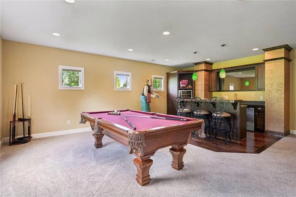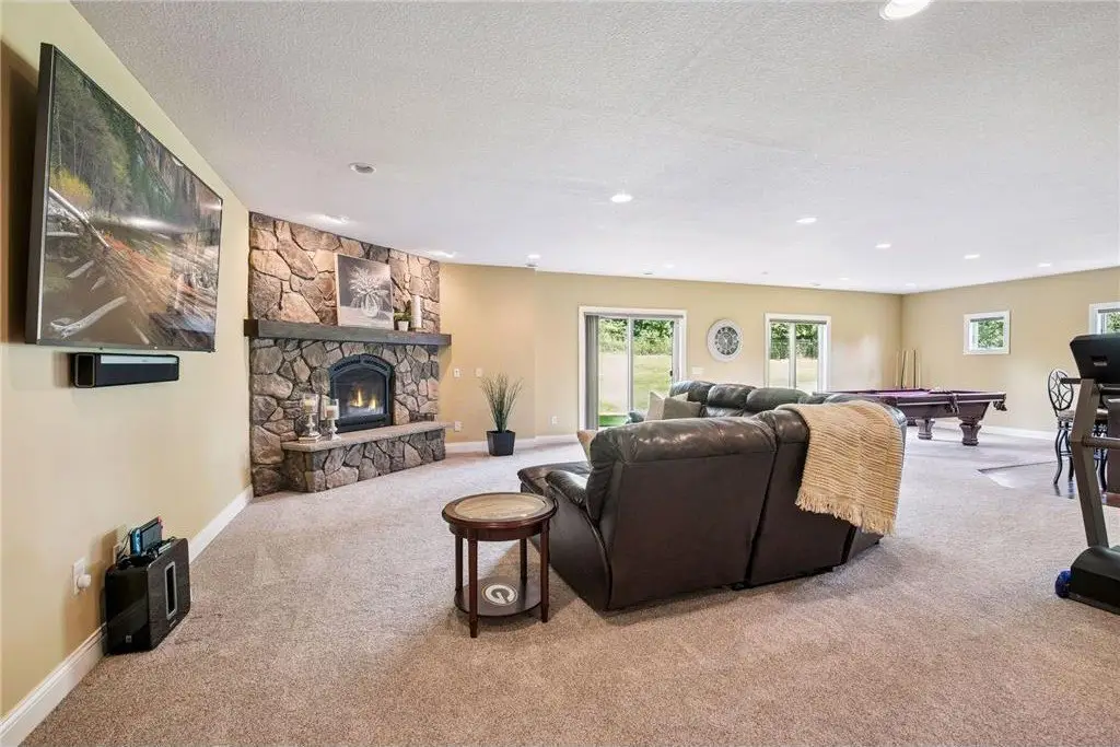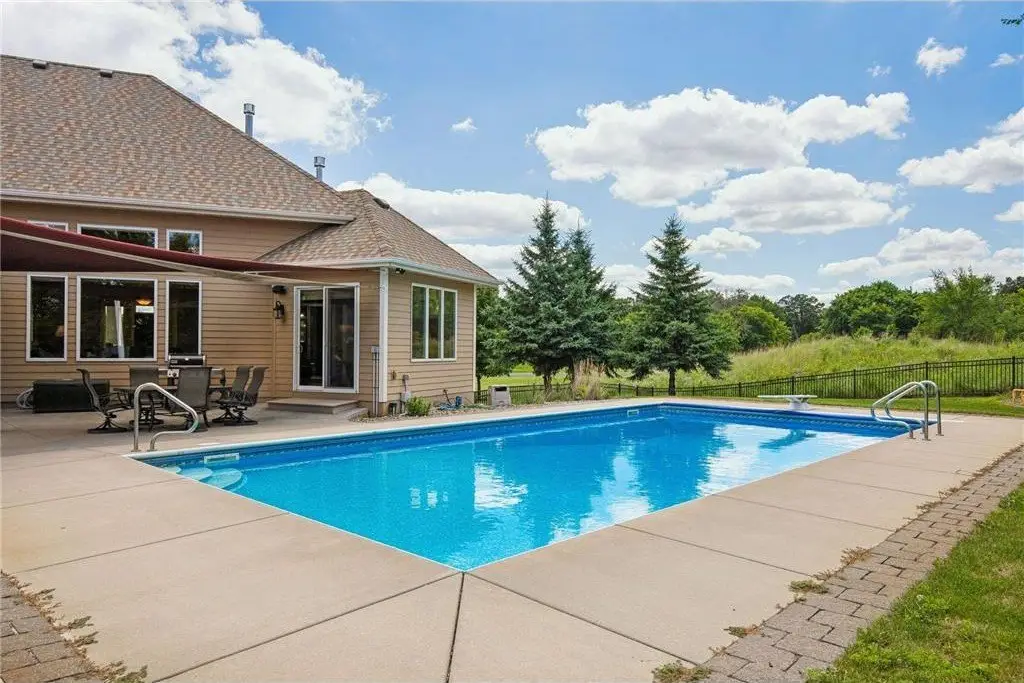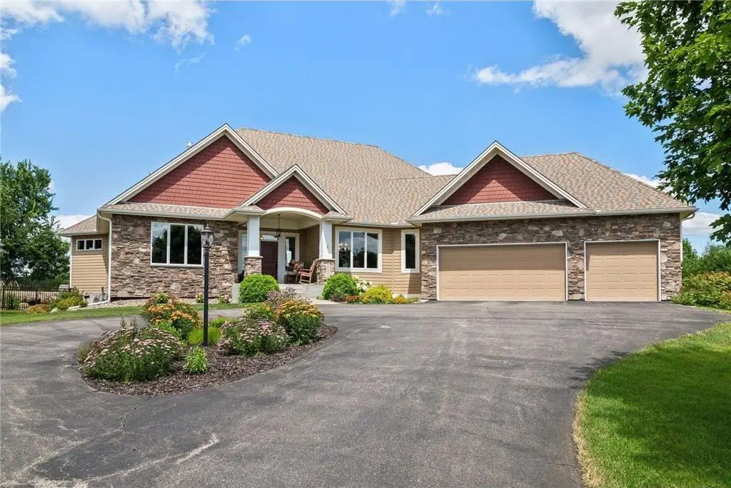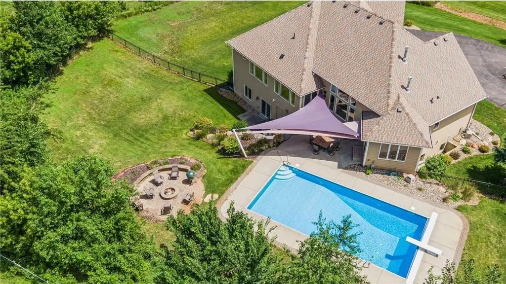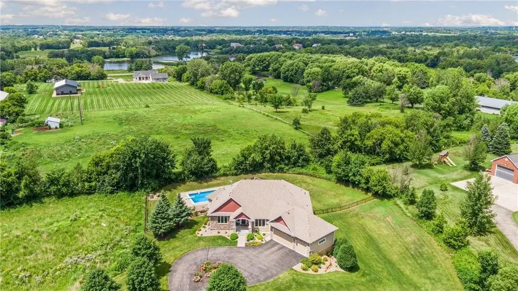 Experience refined luxury in this custom walkout rambler designed and built by JB Woodfitter in 2012, set on 2.51 acres of manicured grounds and prairie beauty. This 4BR/5BA masterpiece offers soaring ceilings, dramatic windows, and high-quality finishes throughout. Enjoy a gourmet kitchen with abundant Knotty Alder cabinetry, oversized island with bar seating, solid surface counter tops, tile backsplash, stainless steel appliances, double wall ovens, and a walk-in pantry. A grand two-story great room with a floor-to-ceiling fireplace with accent down lighting presents an impressive focal point. Gorgeous and inviting hearth room with a heated tile floor, cosmopolitan fireplace, and wet bar designed to offer a seamless indoor-outdoor entertaining space. A convenient 3/4 bath located near the hearth room was designed for a quick rinse after a dip in the pool. Walkout from the hearth room to a heated in-ground pool, sprawling patio, and firepit to unwind and entertain in style. A spacious main level office with French doors and full wall of built-ins welcomes a private work from home space. This lovely home welcomes both formal and in-formal dining spaces, perfect for large gatherings. The main-level primary suite connects to a spa-like bath, complete with a steam shower, that adjoins the laundry for your added convenience. Enter from the garage into a fabulous mud room with a tile floor, built-in lockers and closet for everyday storage. A wide staircase leads you to this homes equally impressive lower level that boasts a spacious family room with a dramatic corner fireplace, billiard area, stunning wet bar, craft/flex room, three bedrooms (one Jack-n-Jill style that share a 3/4 bath) and a separate third bedroom that walks through to a sparkling full bath, plus a lower 2+ garage for all your toys. The upper level three car garage is angled, with an epoxy floor and floor drains, built-in storage cabinetry, (2) 220-volt electric charging stations and a convenient side service door. Surrounded by estate homes and tranquil views, this home blends country serenity with city convenience. Nearby Legends Golf Course offers a challenging game, and a fabulous dining and social experience. This highly sought after neighborhood attends highly sought after Lakeville schools and is not part of the Scottview Estates homeowner's association. Go ahead and fall in love with this spectacular home - its easy to do here.