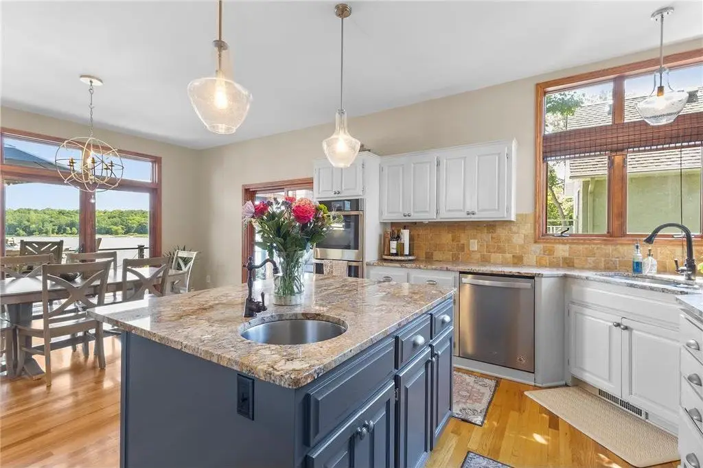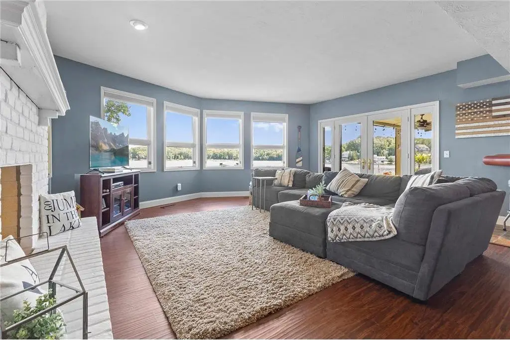 Spectacular lakeshore retreat with 99 feet of sandy shoreline and panoramic sunrise views! Nestled in a premier location on the lake, this walkout two-story home offers an incredible vantage point for 4th of July fireworks, big water views, and peaceful privacy. The heart of the home features a dramatic two-story great room with expansive windows that frame the lake and fill the space with natural light. Multiple levels provide versatile entertaining spaces, including a three-season porch, perfect for morning coffee or evening gatherings. Whether you're lounging by the shore, taking in the sunrise, or hosting family and friends, this property is designed for year-round enjoyment of lake life. Don't miss this rare opportunity to own one of the most desirable lots on the lake!