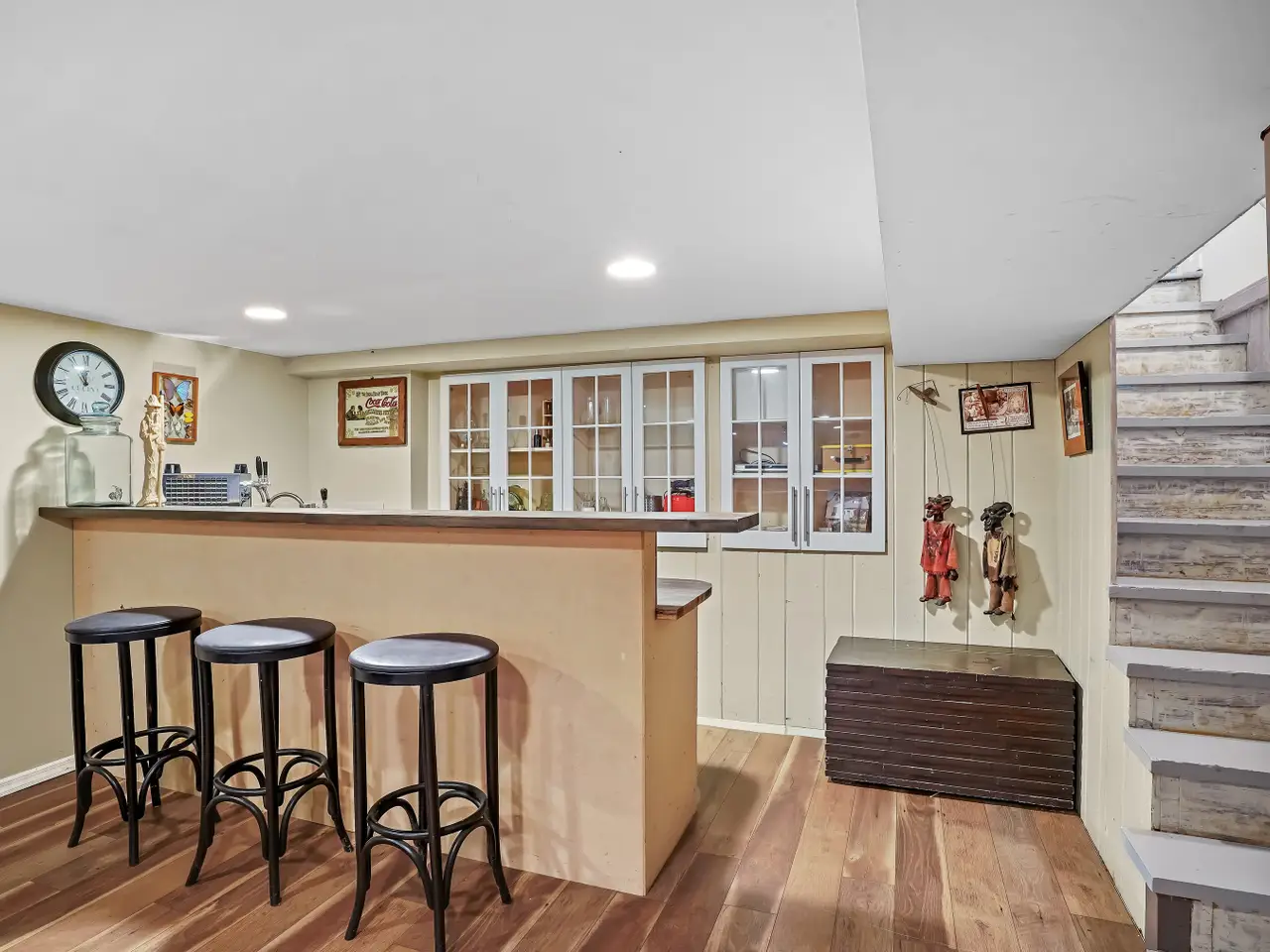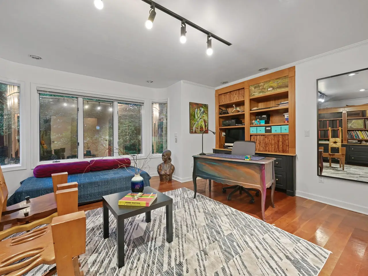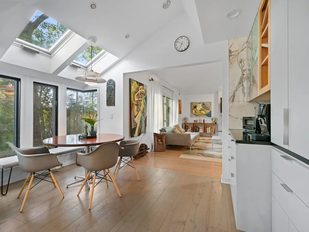 A celebrated artist's estate, this extraordinary mid-century modern residence is a statement of design and lifestyle. Gated and private on nearly four acres, the home opens with a dramatic foyer of soaring glass and a sweeping wrought-iron stair. Light cascades across gleaming hardwood floors and cathedral ceilings, where striking architectural lines create a gallery-like backdrop for living and entertaining. The vaulted living room, anchored by a sculptural fireplace, flows to a sleek chef's kitchen with lacquered maple cabinetry, bold granite counters, and professional Wolf, Bosch, and Sub-Zero appliances. A breakfast area and elegant dining room-complete with its own fireplace-offer refined spaces for gatherings of any scale. The main level also includes a rare guest or second primary suite with kitchenette and glamorous bath, plus a versatile office/bedroom with custom built-ins. Upstairs, the primary retreat impresses with vaulted ceilings, a walk-in closet, and spa bath, joined by an additional en-suite bedroom. The lower level surprises with a pub and recreation room. Beyond the interiors, manicured grounds feature curated gardens, meandering stone paths, and multiple destinations for leisure: an enclosed porch with sauna and Endless Pool, hot tub and firepit patio, greenhouse, vegetable garden, and chicken coop. A property of uncommon artistry and vision-seamlessly balancing luxury, sustainability, and serenity. Close to all commute routes to NYC and down county.