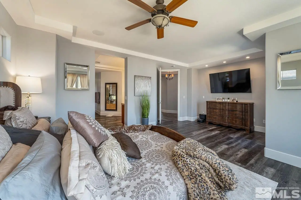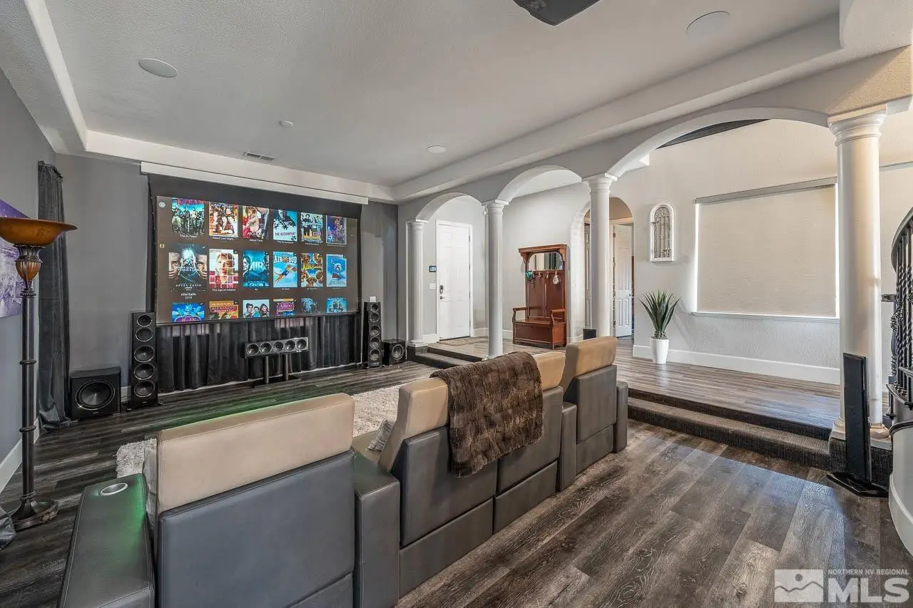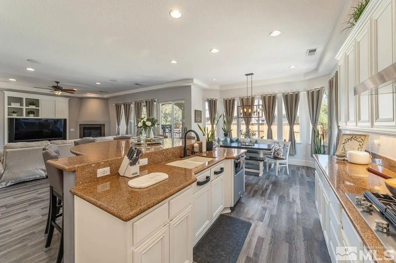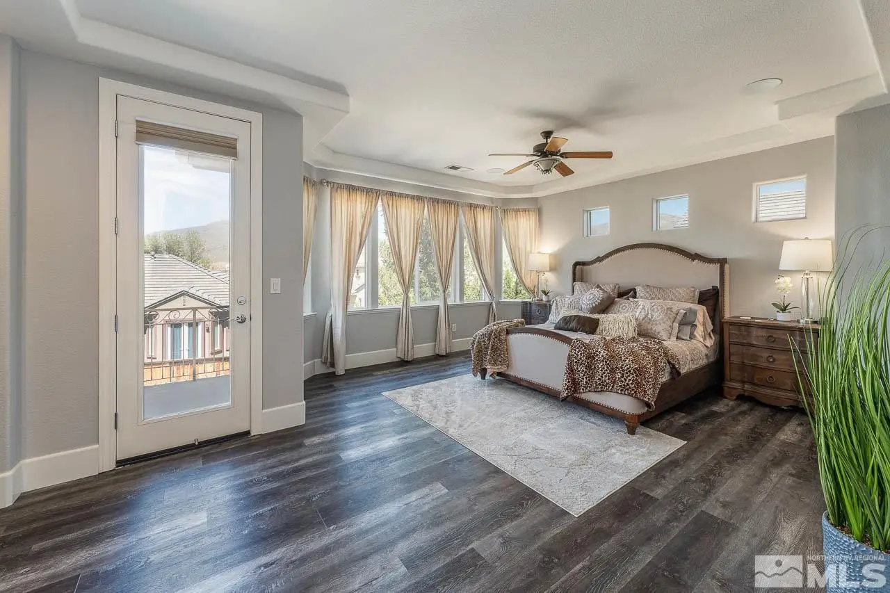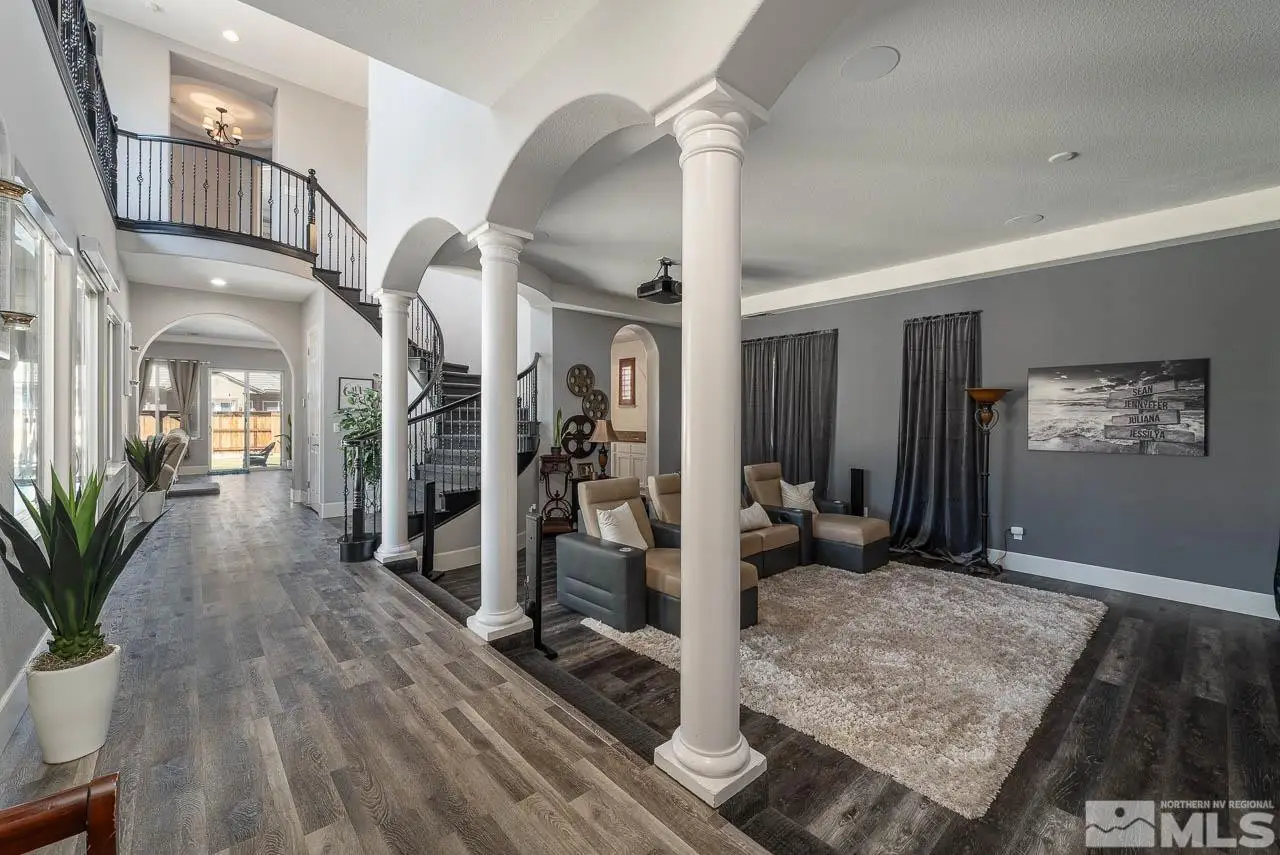 The entry foyer has all the WOW factor leading to this Elegantly designed 4 bed/4 bath home in the gated Damonte Ranch! A must see state-of-the-art entertainment system! One bedroom conveniently located downstairs, also suitable for an office/Den. Iron spindle staircase paves the way to the Primary Suite. The additional 2 bedrooms are mini-suites with their own bathrooms. The colossal bonus room is ideal for a playroom/gym. The LVP floor has a modern grey accent and the granite slab kitchen island is impressive!