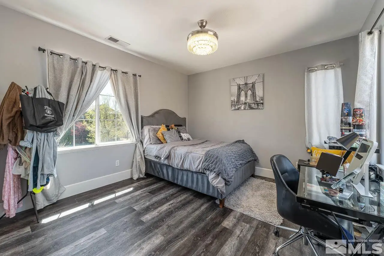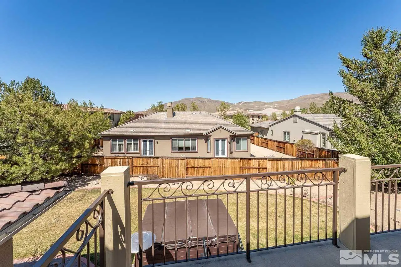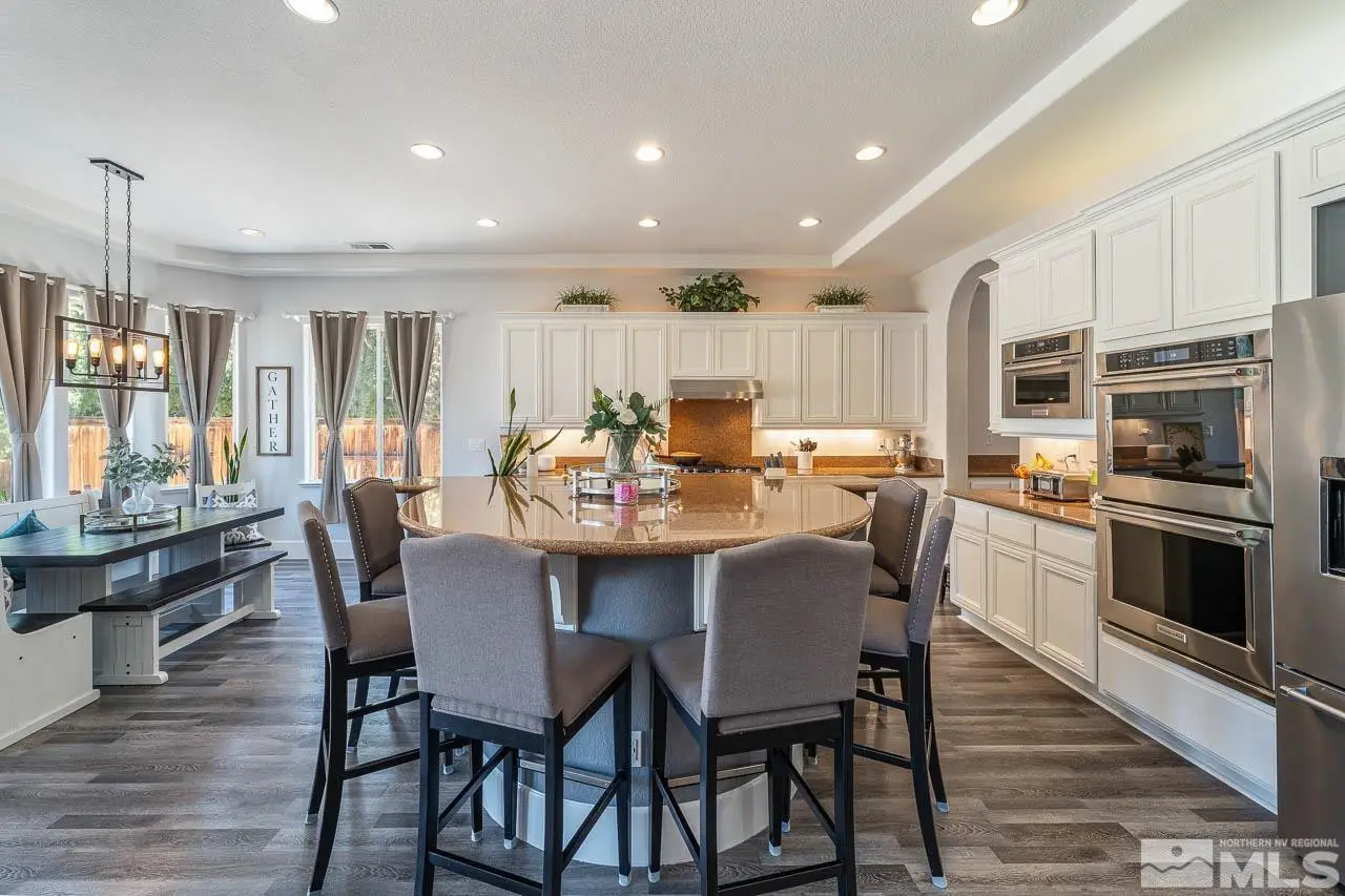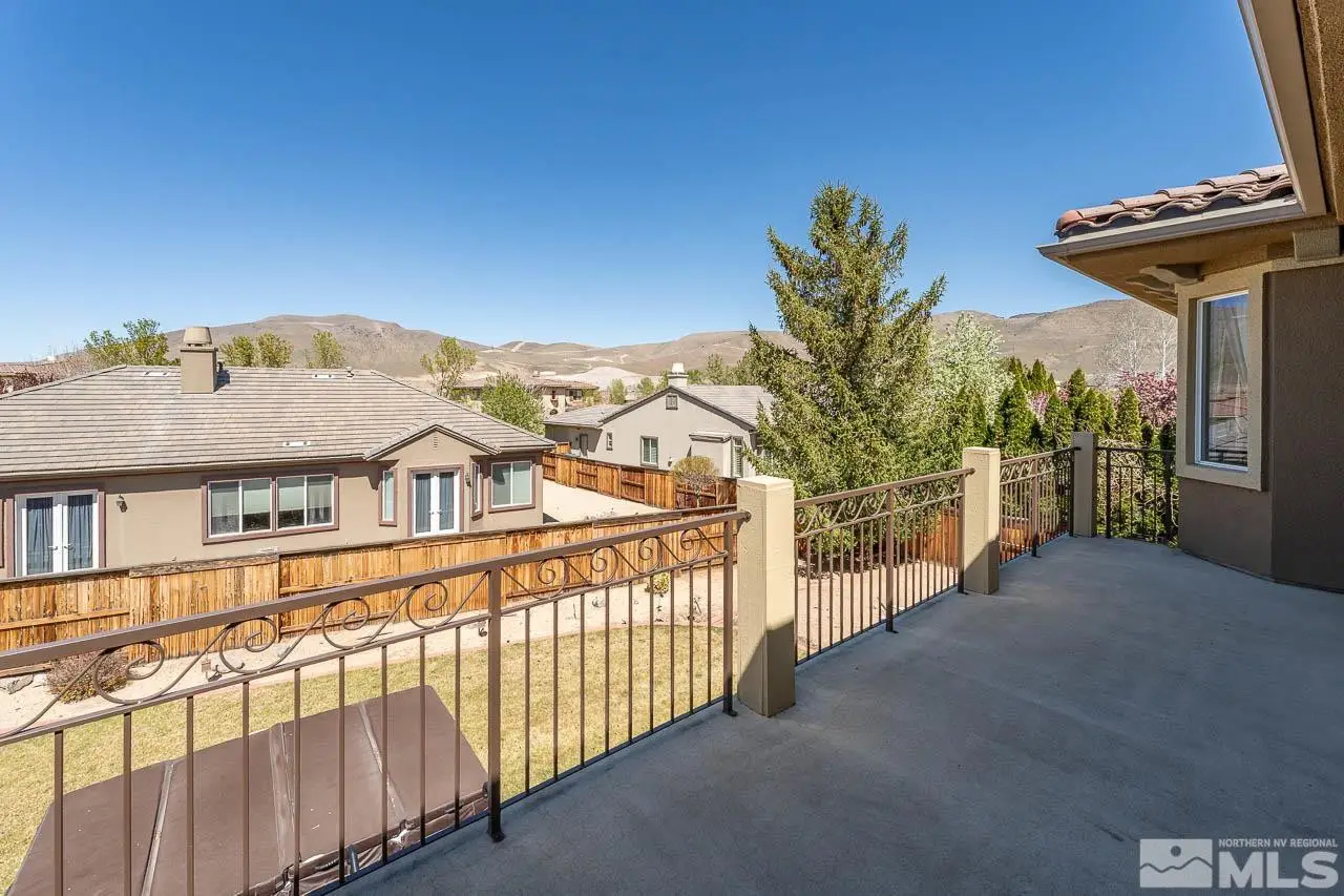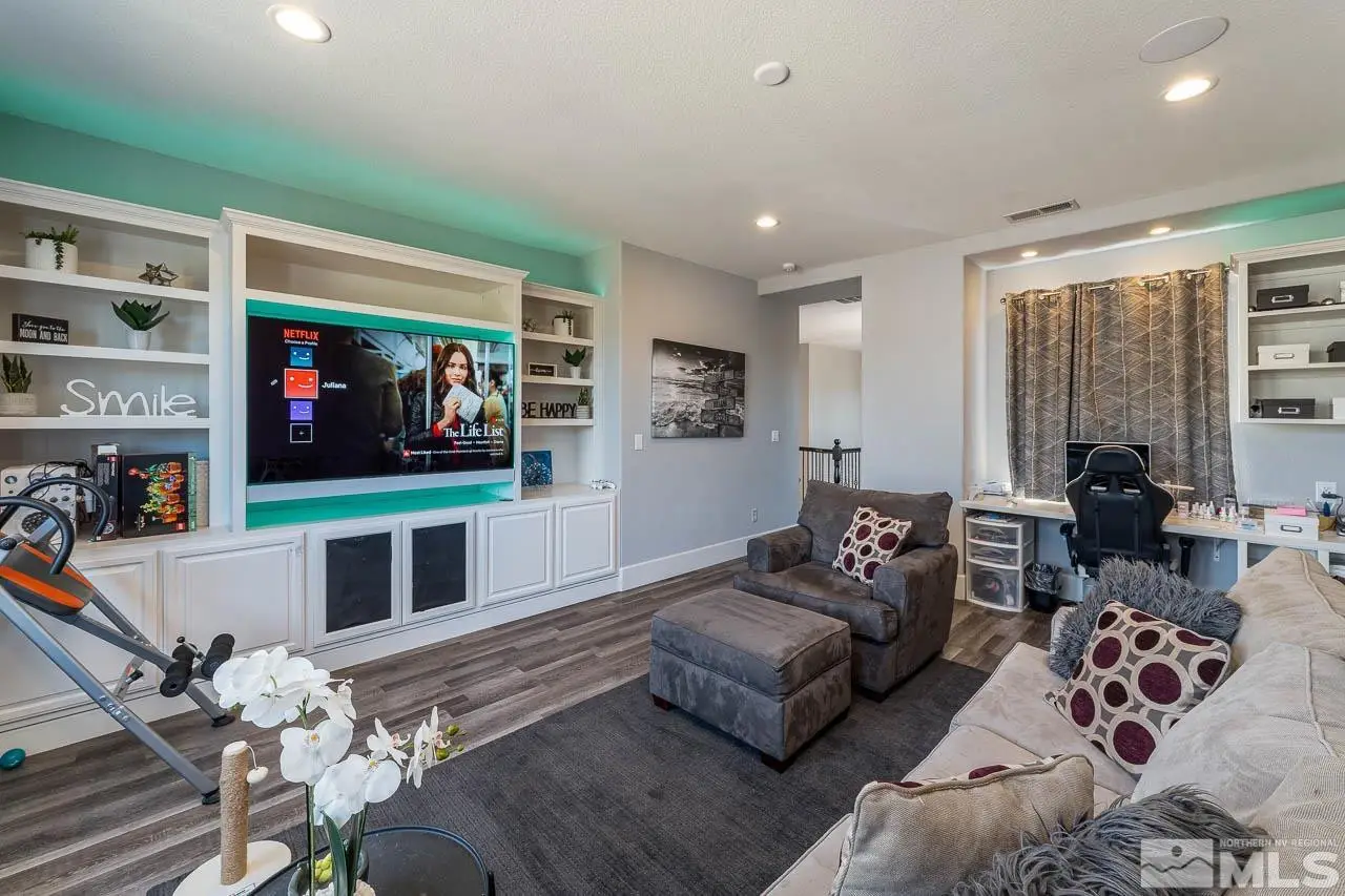 The entry foyer has all the WOW factor leading to this Elegantly designed 4 bed/4 bath home in the gated Damonte Ranch! A must see state-of-the-art entertainment system! One bedroom conveniently located downstairs, also suitable for an office/Den. Iron spindle staircase paves the way to the Primary Suite. The additional 2 bedrooms are mini-suites with their own bathrooms. The colossal bonus room is ideal for a playroom/gym. The LVP floor has a modern grey accent and the granite slab kitchen island is impressive!