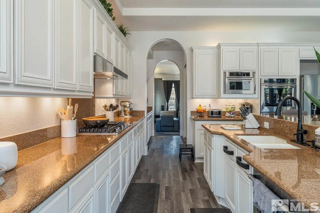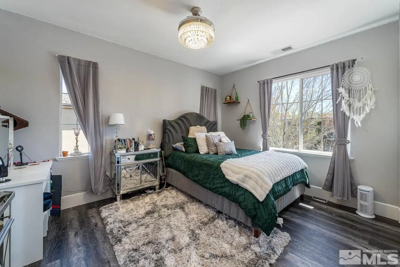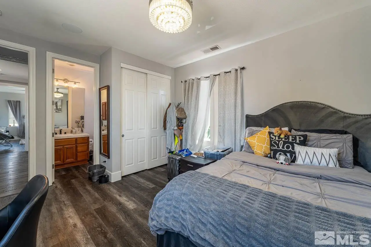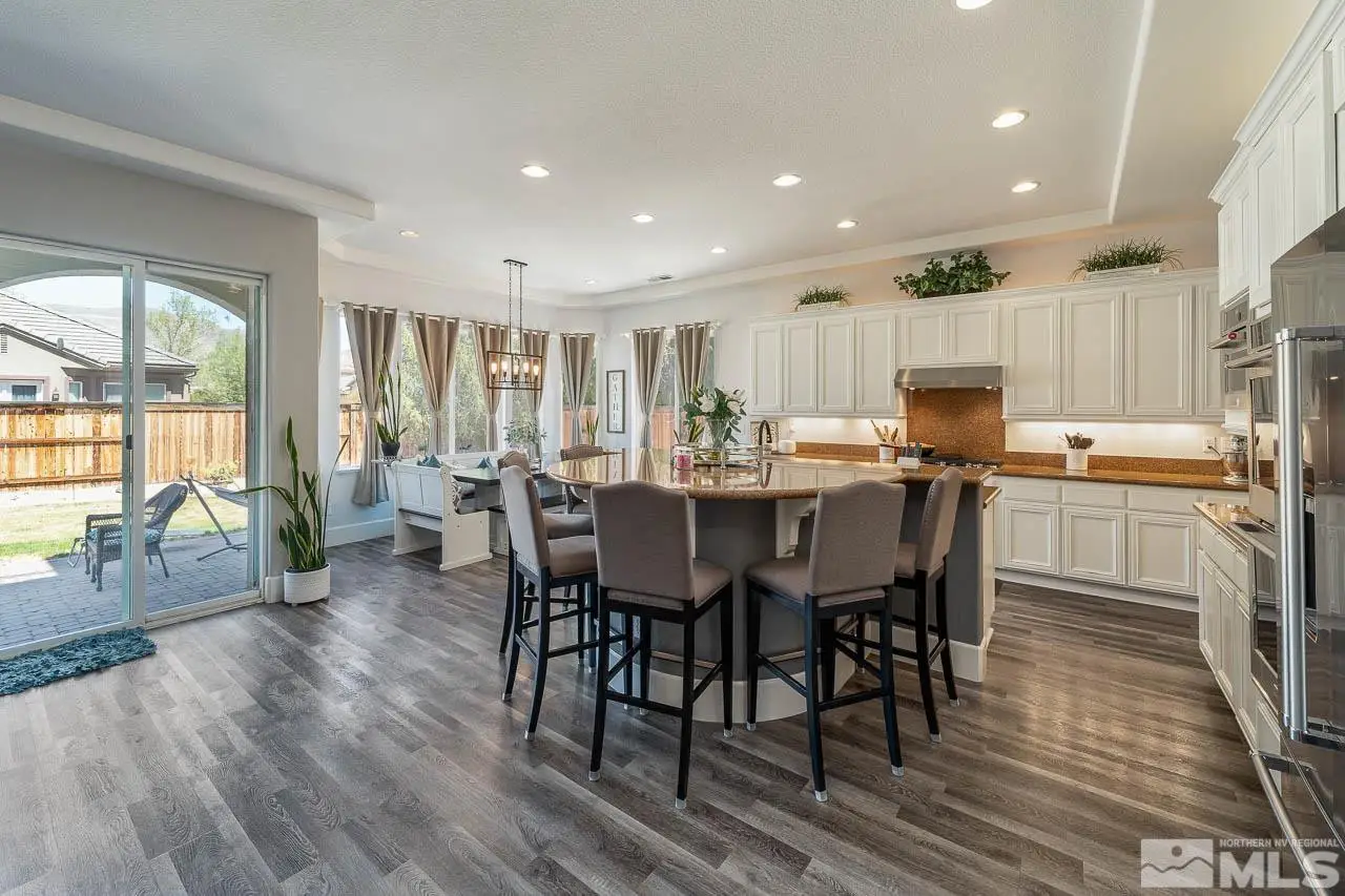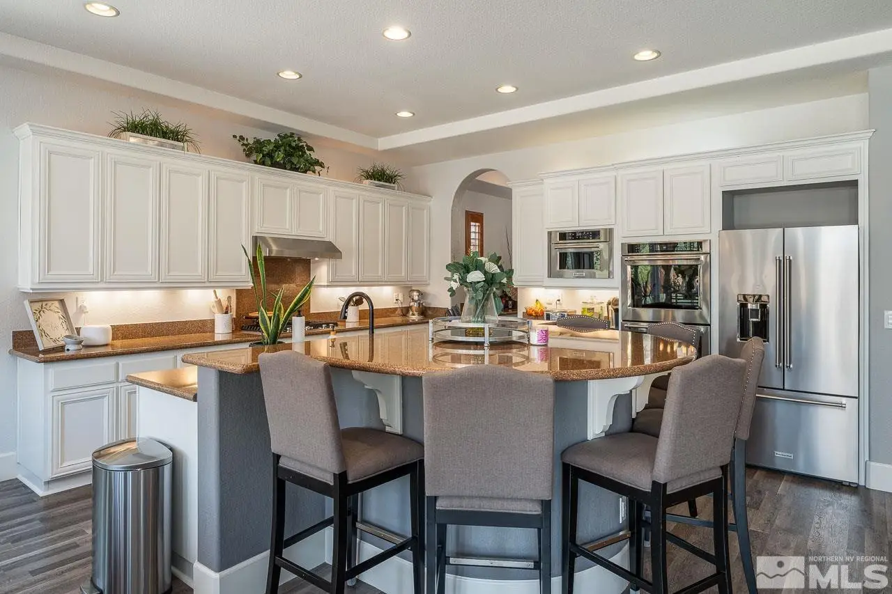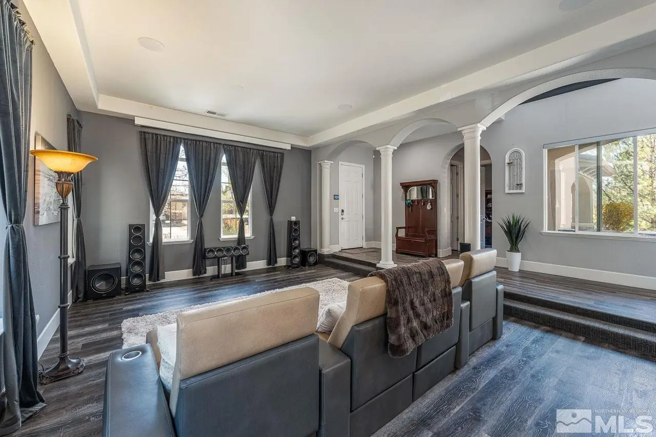 The entry foyer has all the WOW factor leading to this Elegantly designed 4 bed/4 bath home in the gated Damonte Ranch! A must see state-of-the-art entertainment system! One bedroom conveniently located downstairs, also suitable for an office/Den. Iron spindle staircase paves the way to the Primary Suite. The additional 2 bedrooms are mini-suites with their own bathrooms. The colossal bonus room is ideal for a playroom/gym. The LVP floor has a modern grey accent and the granite slab kitchen island is impressive!