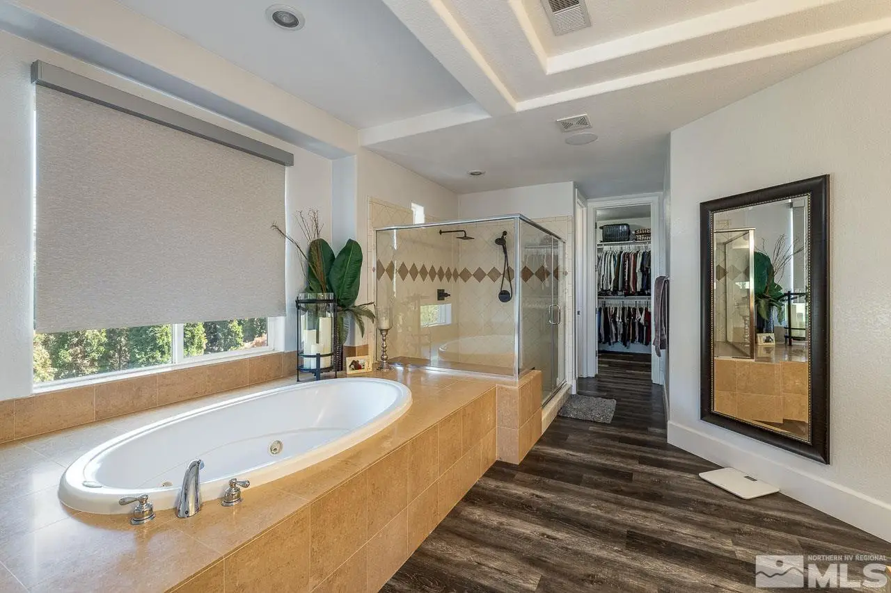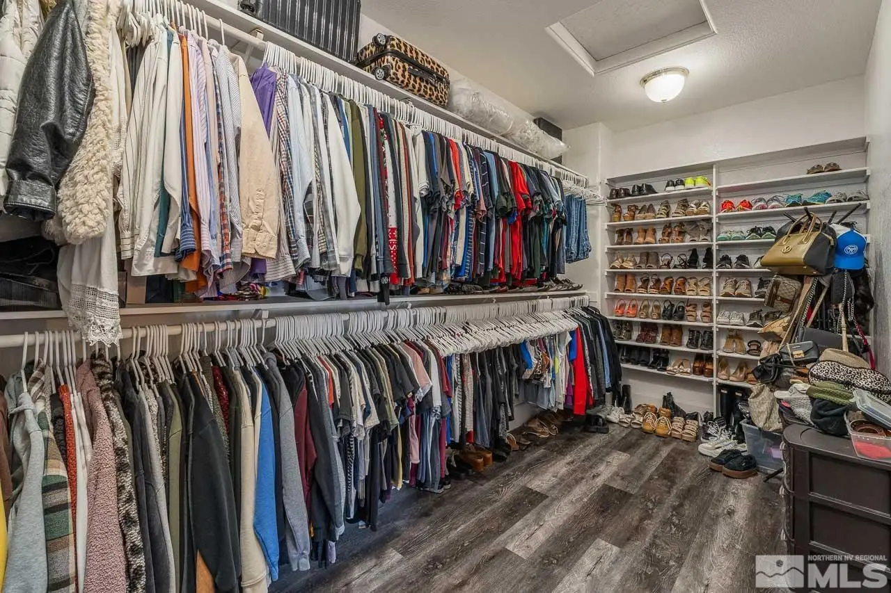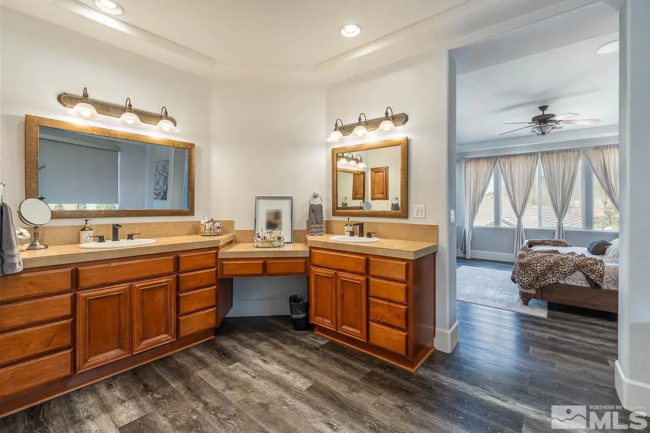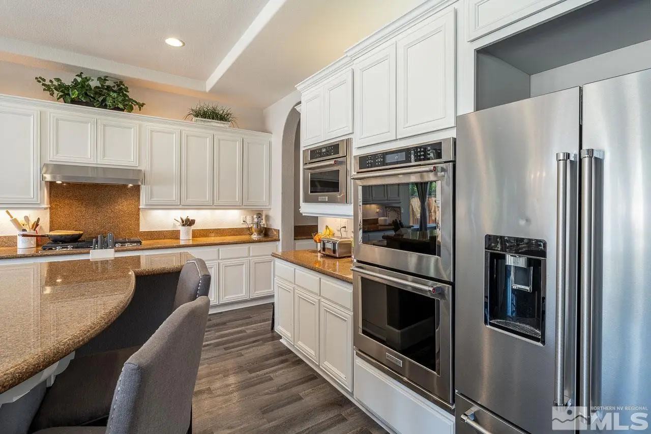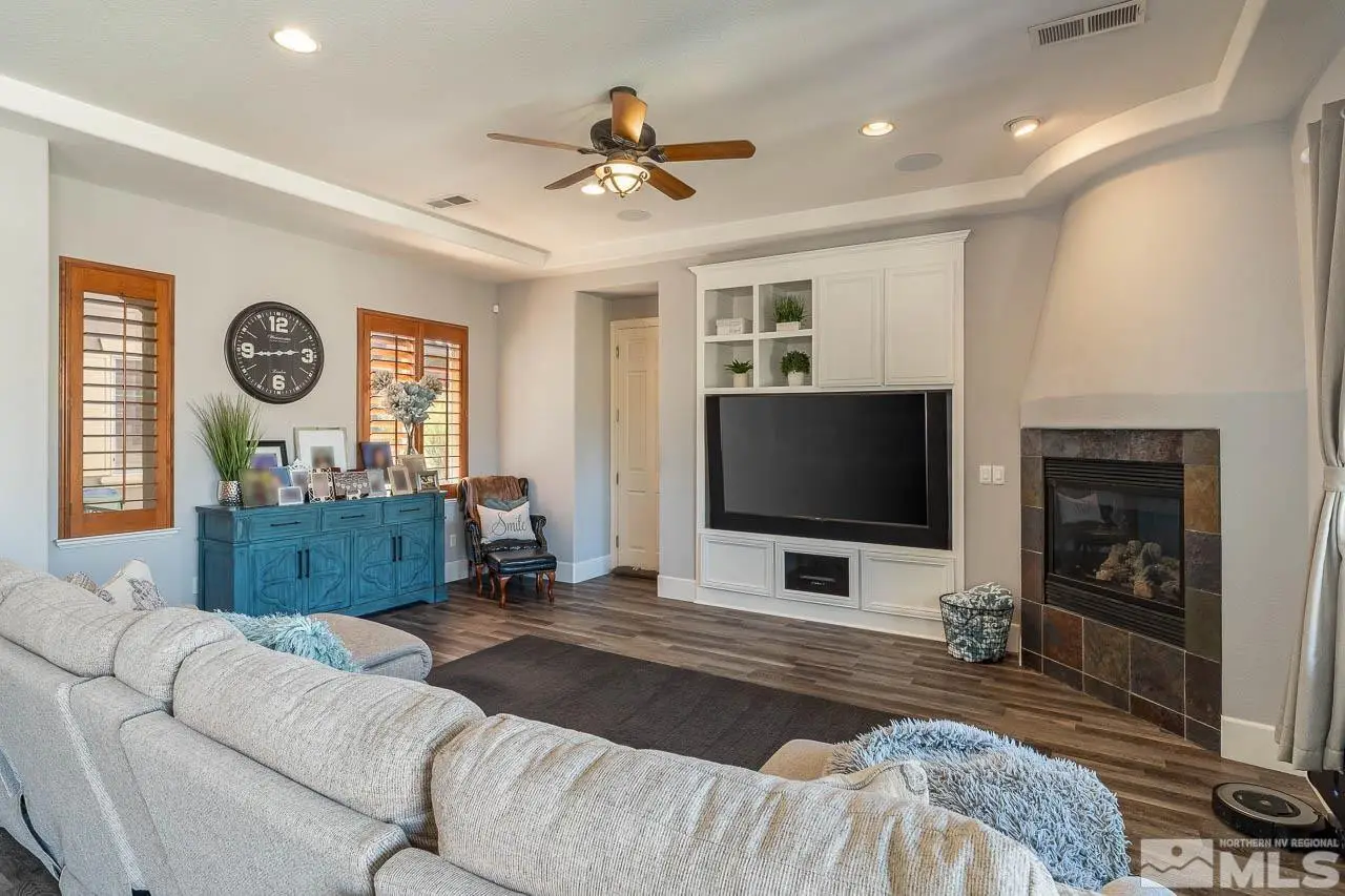 The entry foyer has all the WOW factor leading to this Elegantly designed 4 bed/4 bath home in the gated Damonte Ranch! A must see state-of-the-art entertainment system! One bedroom conveniently located downstairs, also suitable for an office/Den. Iron spindle staircase paves the way to the Primary Suite. The additional 2 bedrooms are mini-suites with their own bathrooms. The colossal bonus room is ideal for a playroom/gym. The LVP floor has a modern grey accent and the granite slab kitchen island is impressive!