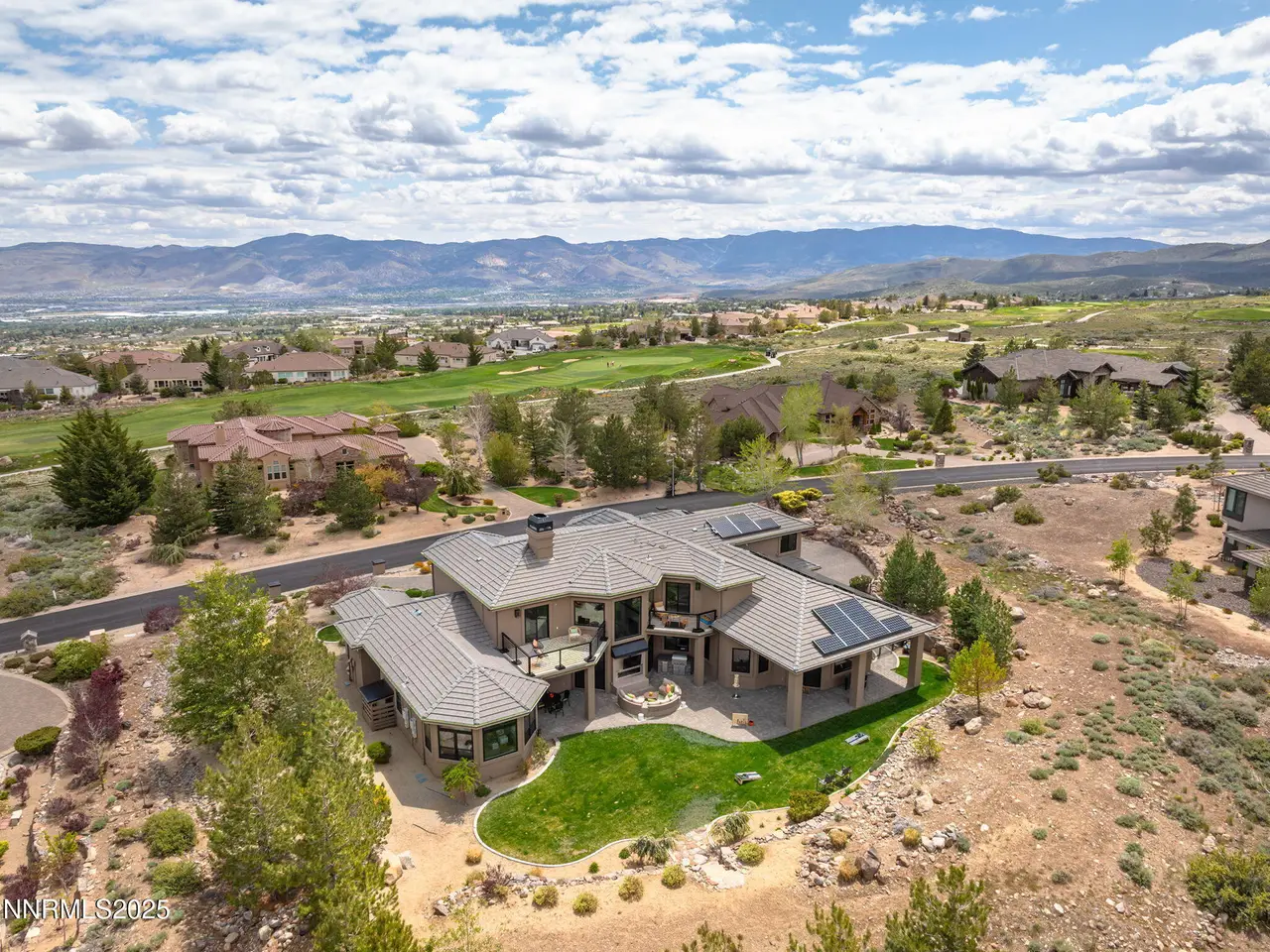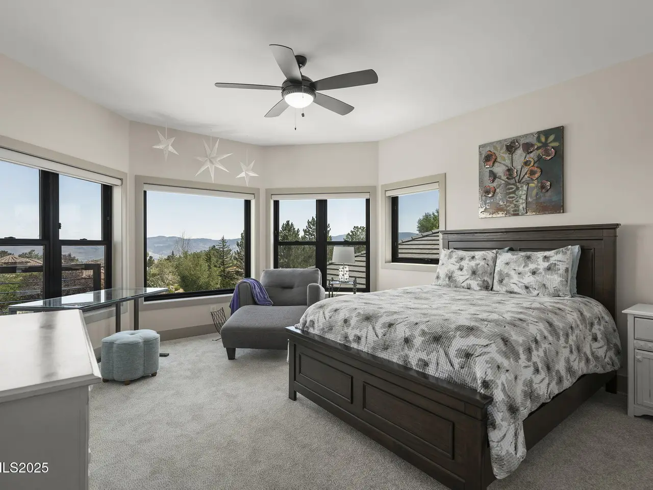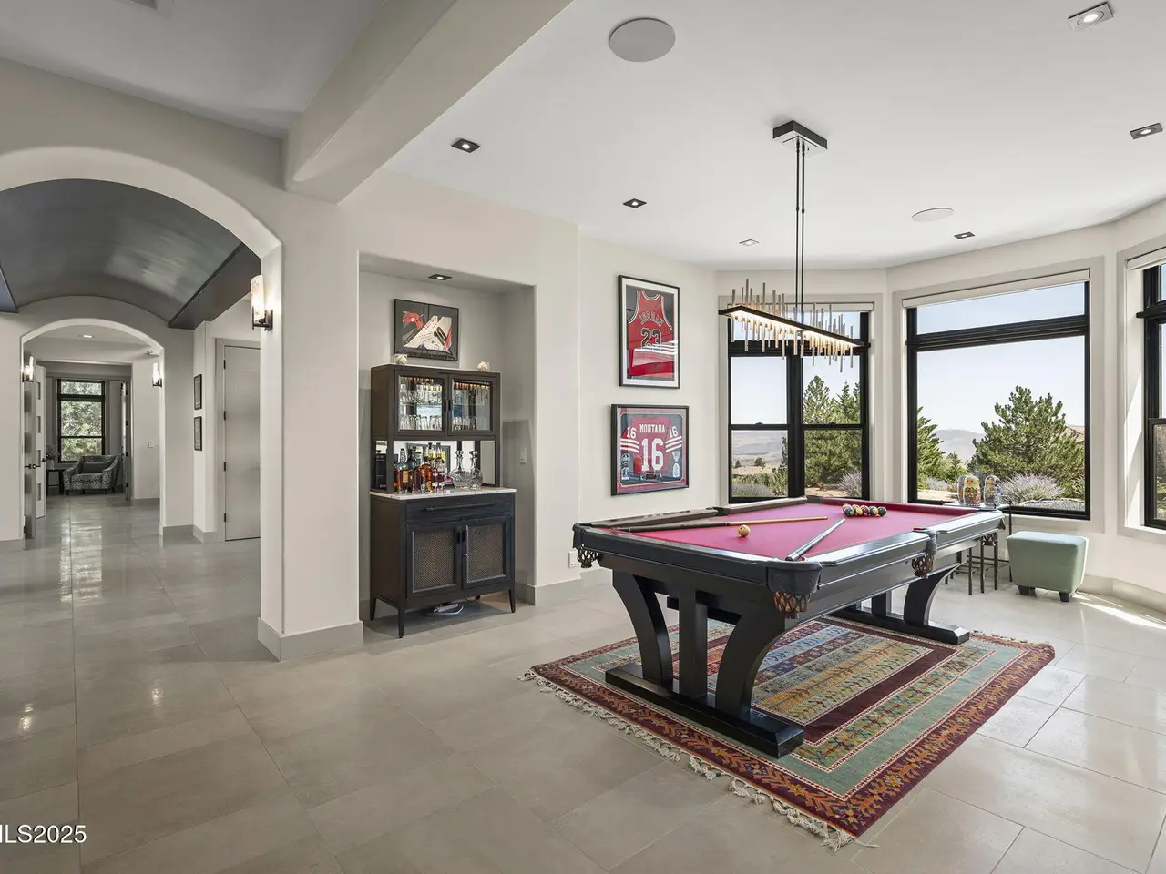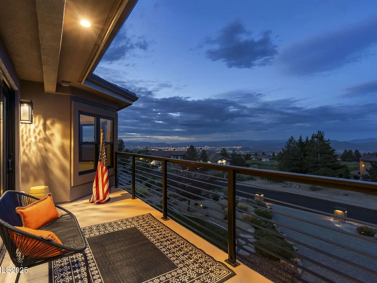 Step into 6177 North Featherstone, a residence reimagined from the ground up to embody the sophistication of design and the effortless grace of High Desert living. Nestled within the prestigious ArrowCreek community, this fully remodeled estate offers 5,586 square feet of inspired living on a full acre. With sweeping views across the Sierra Nevada and Mt. Rose mountains, lush golf fairways, and sparkling city lights, every angle of this home tells a story of elegance and connection to its surroundings. The owners began their remodel with purpose: to create a seamless flow, where form meets function and every detail enhances life, leisure, and entertaining. Walls were softened, pillars removed, and spaces reimagined to capture natural light and open sightlines. Modern finishes and thoughtful design balance grandeur with comfort. A finished basement and upstairs library added 312 square feet, expanding versatility without sacrificing intimacy. Arrival makes an unforgettable impression with a custom 9x6 steel pivot door by Modern Steel Doors of Arizona. Inside, a light-filled foyer leads to an expanded balcony, where sweeping golf course and city views set the stage for sunrise coffee or starlit evenings. At the heart of the home, the Dining Room has been elevated into a dramatic entertaining space with soaring two-story ceilings and a two-sided fireplace connecting indoors and outdoors. Andersen sliding doors open to patios and gardens, while striking Sonneman fixtures and art lighting create ambiance. Whether hosting holidays or intimate dinners, the space adapts with ease. The Main En Suite is a private retreat, complete with custom California Closets, cove lighting, and remote-controlled Hunter Douglas shades. The spa-inspired bath showcases a freestanding soaking tub beneath chandeliers, a dual-entry steam shower with rain head and sprayers, natural stone floors, shimmering glass tile, and custom cabinetry with quartz counters and lighted mirrors. The Great Room centers on a custom travertine fireplace with black quartz mantel, complemented by wood-grain tile floors, a Minka Aire fan, and integrated Sonos audio. The Kitchen and Nook feature a Wolf 48" range, Sub-Zero refrigerator, and a central island with seating. The Games Room delights with Hubbardton Forge lighting, speakers, and motorized shades. A dramatic staircase of black-stained oak and iron railings rises beneath a cascading Sonneman chandelier. Upstairs, the new Library offers custom bookcases, club seating, and a 12-foot Andersen glass wall opening to a balcony with panoramic views. Four additional en suite bedrooms provide privacy, storage, and character. Outdoors, multiple patios, a two-sided fireplace, and landscaped grounds enhanced with solar lighting create serene gathering spaces. Modern systems include central HVAC with three units, radiant heated floors, Tesla solar panels, Cat-6 wiring, Sonos audio, and a four-car garage with EV charger. This estate is more than a home—it is a lifestyle. From morning coffee on the balcony to wine in the library at dusk, from quiet family nights to grand celebrations, this residence harmonizes elegance, comfort, and versatility. Every space has been thoughtfully crafted, every view a reminder of Reno's beauty. This is a rare opportunity to own a fully realized vision of home, where luxury and ease coexist seamlessly.
