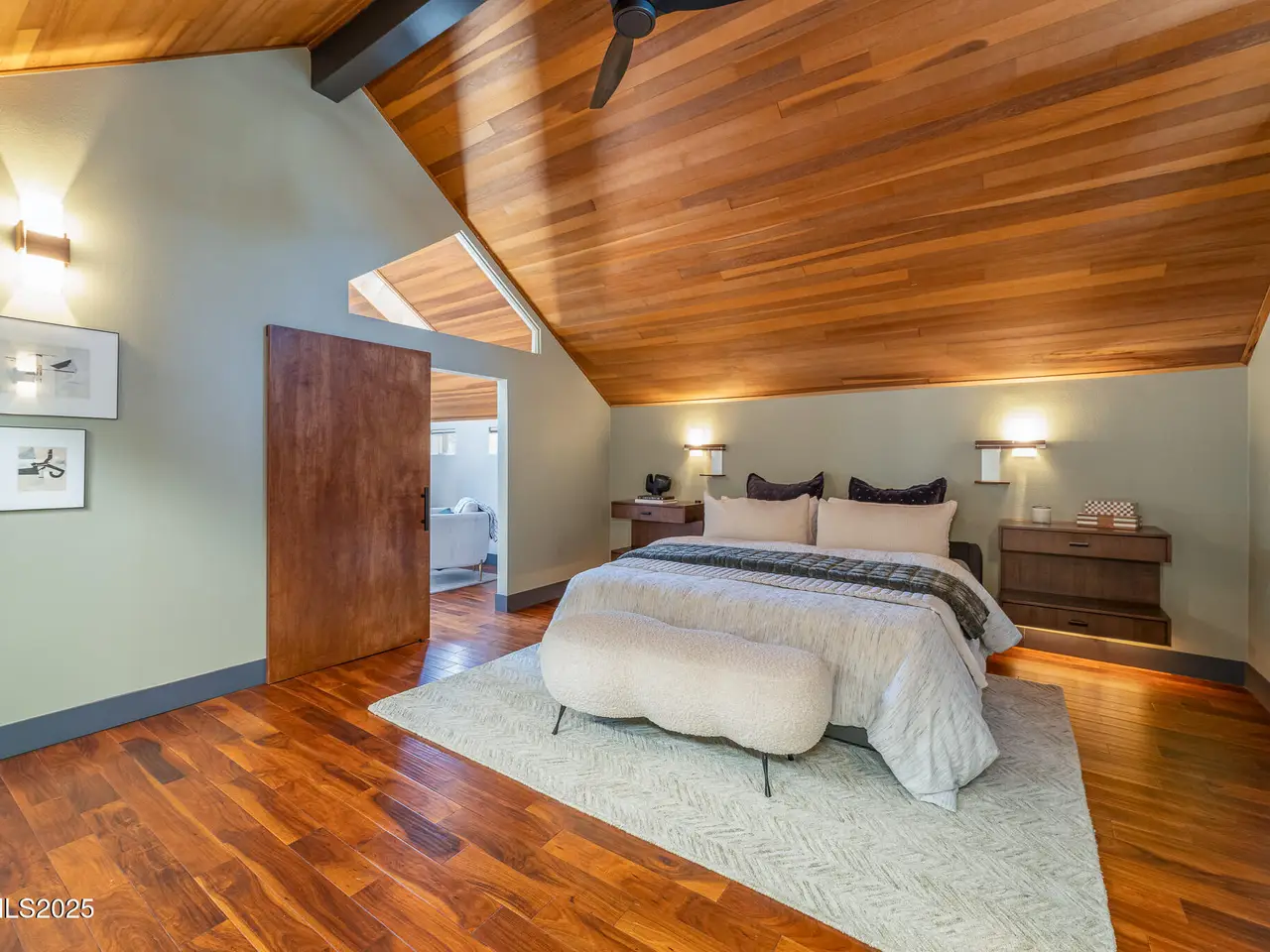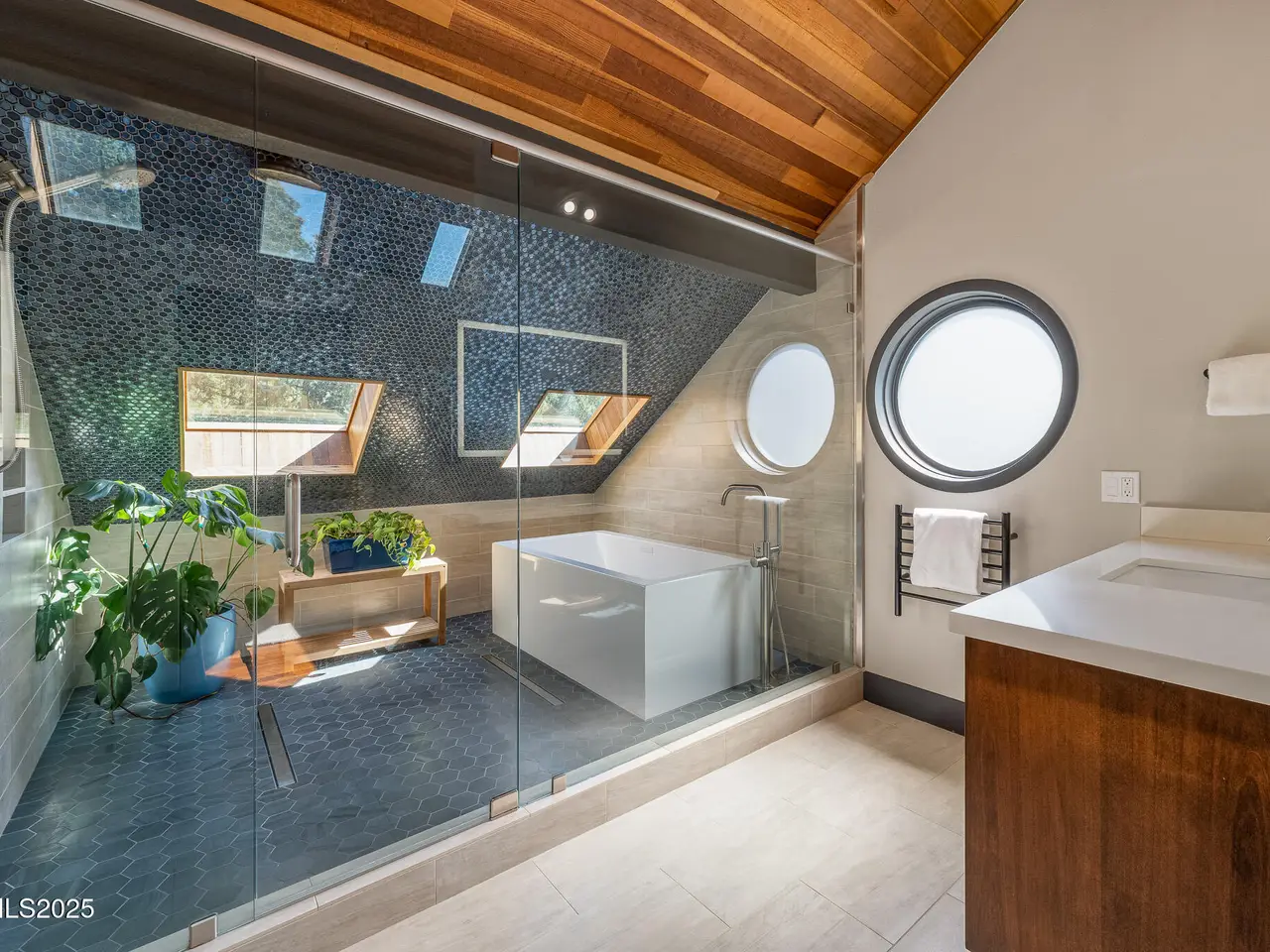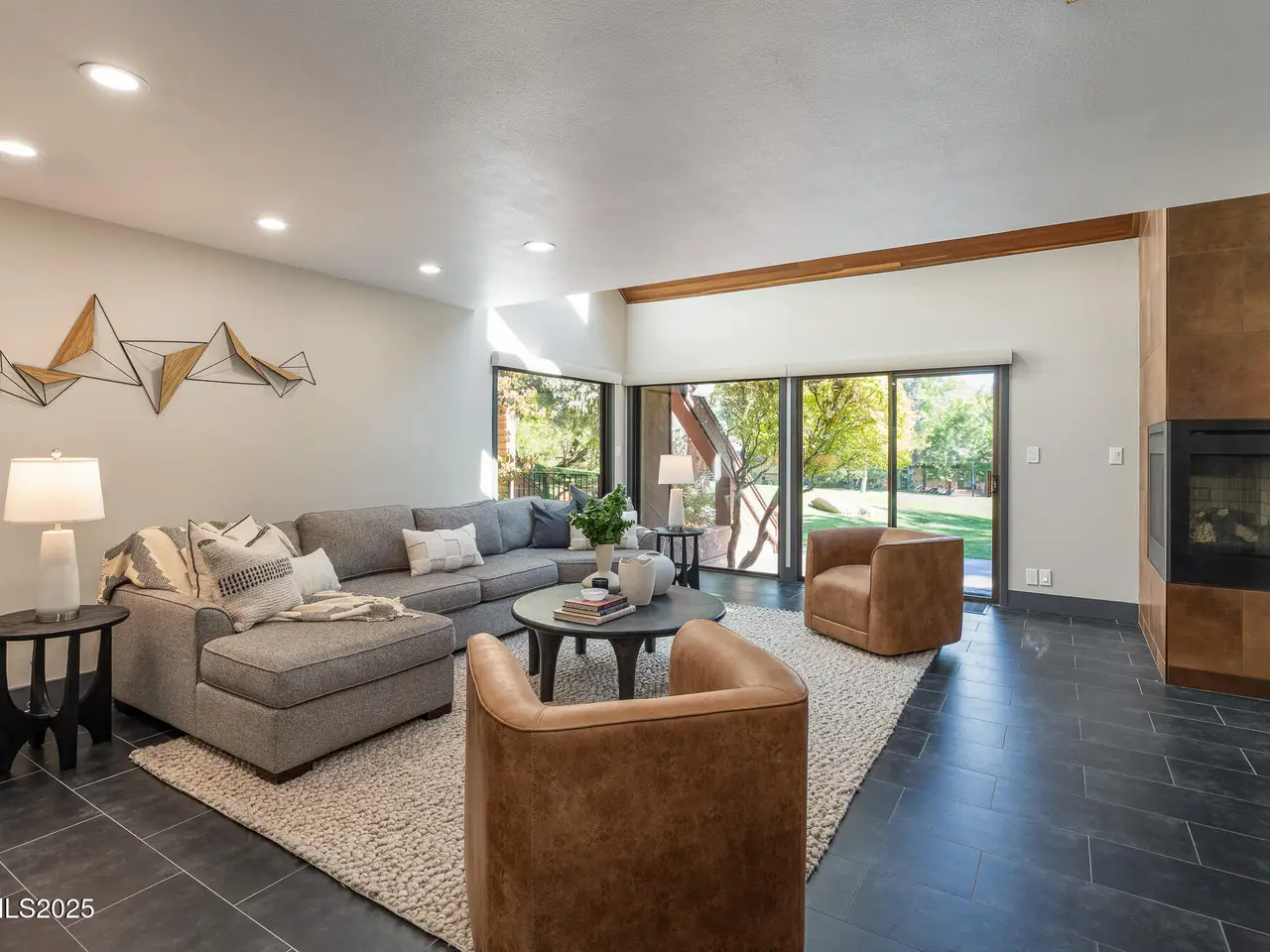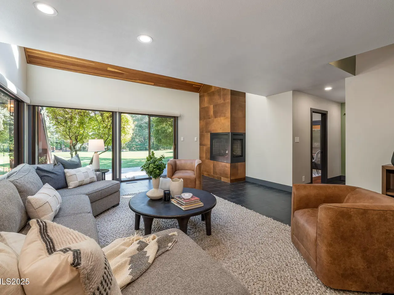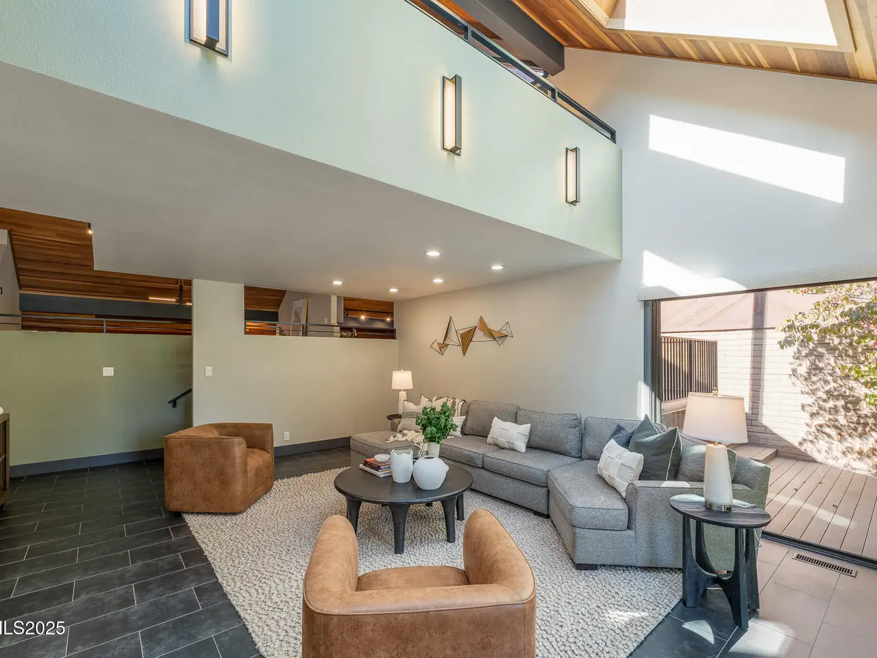 I present to you a true architectural masterpiece in coveted Lake Ridge Shores. Discover a rare opportunity to own a Maurice Nespor-designed work of art in the highly sought-after Lake Ridge Shores community of southwest Reno. This split-level residence is more than a home - it's an experience - where every angle, finish, and feature has been intentionally designed to delight. Step inside to find a balance of hardwood and ceramic tile flooring, anchored by soaring redwood-finished ceilings that highlight striking architectural lines and flood the space with natural light. A remarkable live green planter with a fountain feature runs the full length of the home, bringing the outdoors in and creating a sense of calm and connection. At the center of it all, the custom kitchen is equal parts functional and striking, with rich wood-finished cabinetry, a coffee or cocktail bar with open shelving, and design accents that invite both creativity and conversation. One of the home's most delightful details—a circular window—adds a sense of whimsy and fun, making this space as unique as it is inviting. The primary suite redefines relaxation. Expansive in scale yet intimate in feel, it is designed as a true spa retreat, where comfort meets artistry. The bathroom's bold architecture and thoughtful finishes are elevated with heated tile floors and towel racks, offering a daily indulgence in warmth and luxury. Every detail—down to the angles, lighting, and textures—was carefully curated for both beauty and function. Additional features include a bonus loft for flexible living, and an attached bedroom or office space perfectly suited to today's lifestyle. The home's smart technology, with integrated Lutron and Hue lighting systems managed at the touch of an iPad, allows for effortless ambiance and personalization. Throughout the residence, multiple sitting areas invite connection and reflection, while expansive windows frame the tranquil greenbelt backdrop—offering ultimate privacy within this prestigious gated community. Here, architecture, nature, and modern living converge into a home that is as rare as it is remarkable.