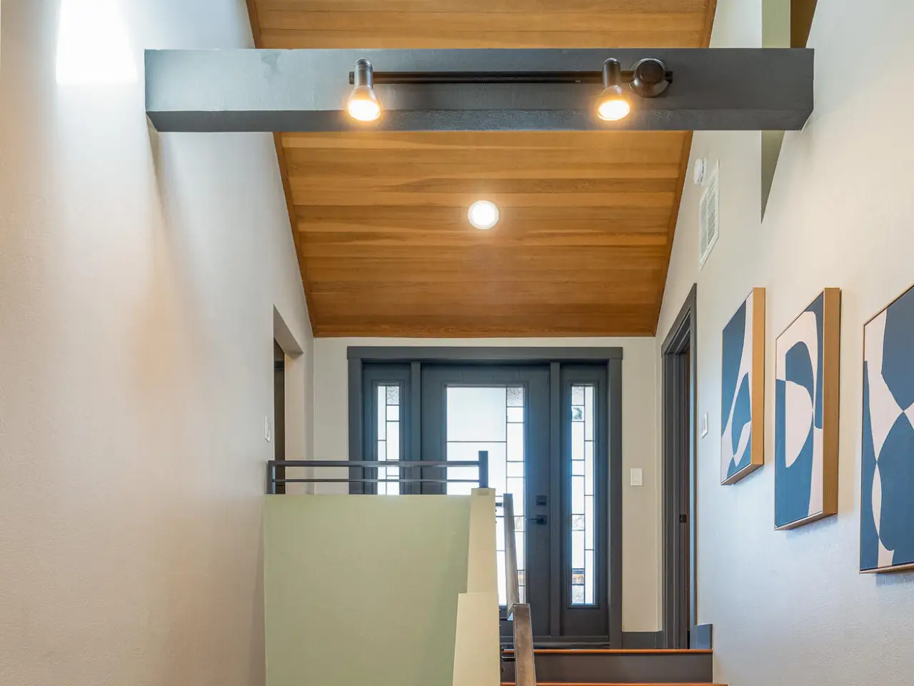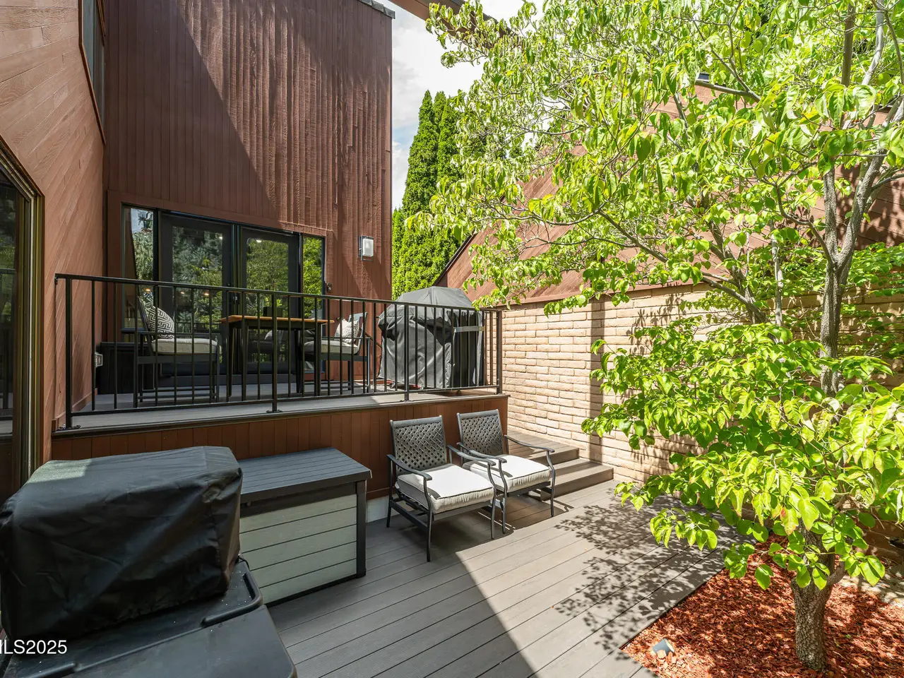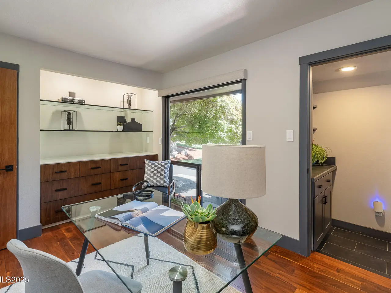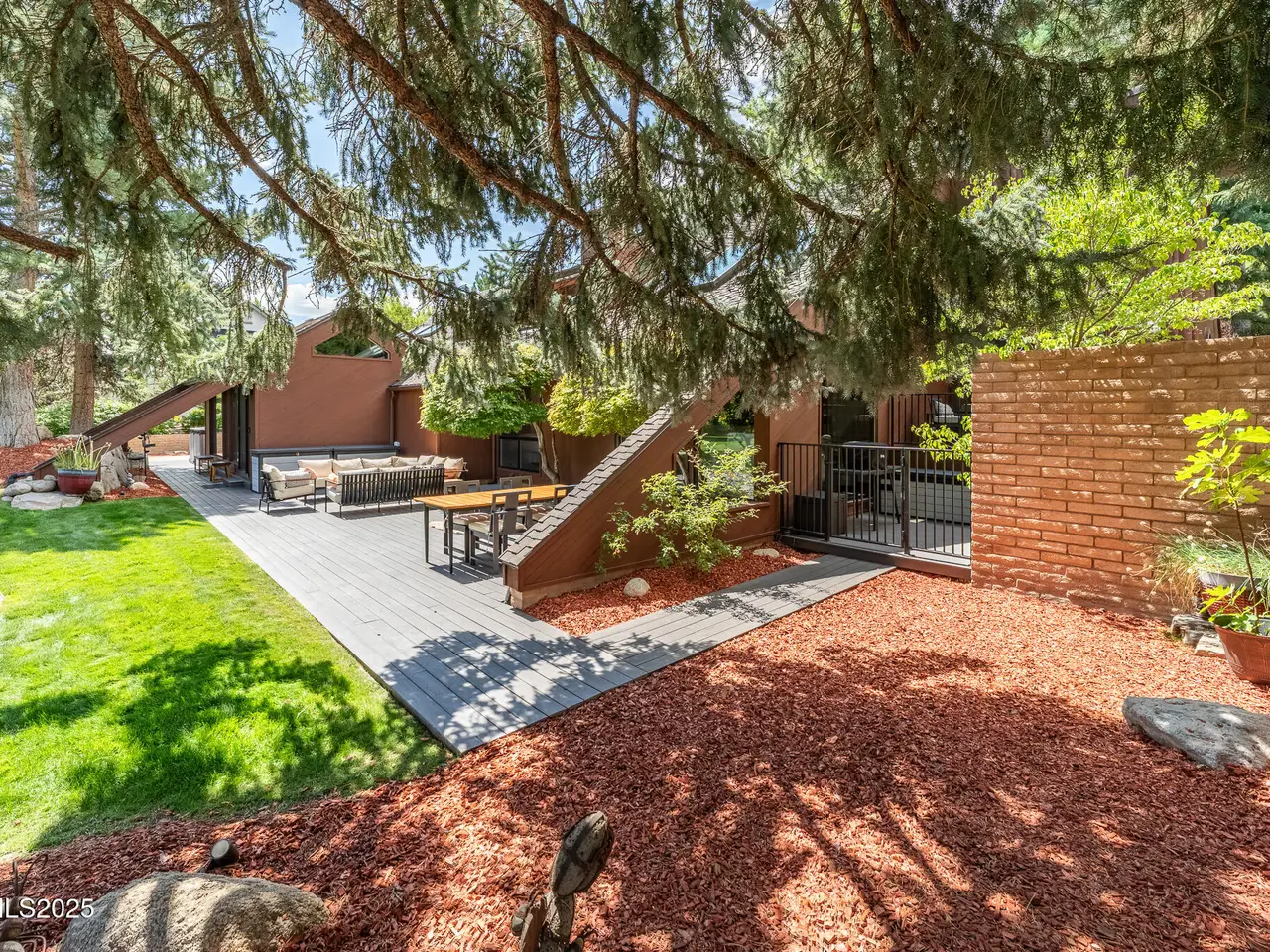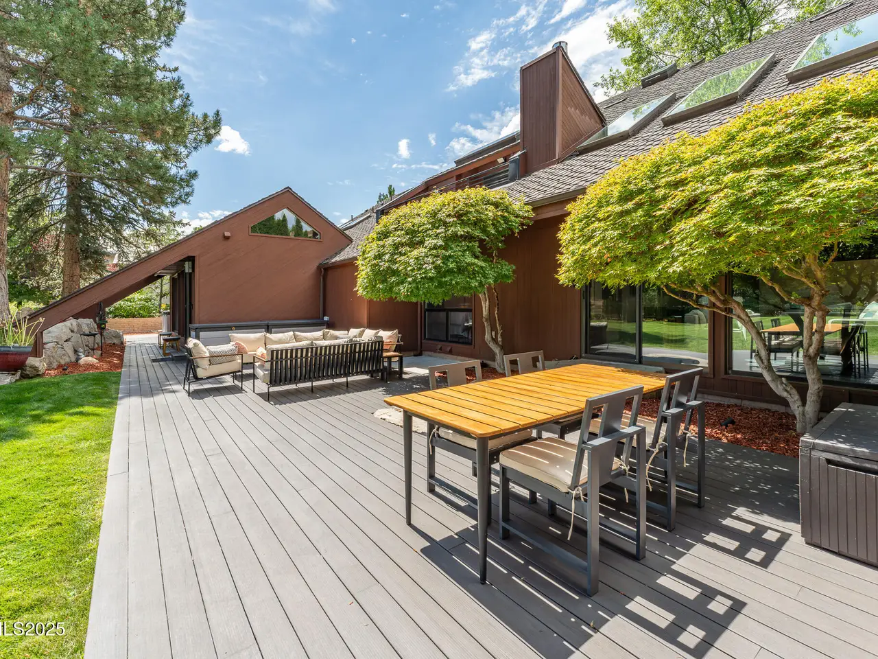 I present to you a true architectural masterpiece in coveted Lake Ridge Shores. Discover a rare opportunity to own a Maurice Nespor-designed work of art in the highly sought-after Lake Ridge Shores community of southwest Reno. This split-level residence is more than a home - it's an experience - where every angle, finish, and feature has been intentionally designed to delight. Step inside to find a balance of hardwood and ceramic tile flooring, anchored by soaring redwood-finished ceilings that highlight striking architectural lines and flood the space with natural light. A remarkable live green planter with a fountain feature runs the full length of the home, bringing the outdoors in and creating a sense of calm and connection. At the center of it all, the custom kitchen is equal parts functional and striking, with rich wood-finished cabinetry, a coffee or cocktail bar with open shelving, and design accents that invite both creativity and conversation. One of the home's most delightful details—a circular window—adds a sense of whimsy and fun, making this space as unique as it is inviting. The primary suite redefines relaxation. Expansive in scale yet intimate in feel, it is designed as a true spa retreat, where comfort meets artistry. The bathroom's bold architecture and thoughtful finishes are elevated with heated tile floors and towel racks, offering a daily indulgence in warmth and luxury. Every detail—down to the angles, lighting, and textures—was carefully curated for both beauty and function. Additional features include a bonus loft for flexible living, and an attached bedroom or office space perfectly suited to today's lifestyle. The home's smart technology, with integrated Lutron and Hue lighting systems managed at the touch of an iPad, allows for effortless ambiance and personalization. Throughout the residence, multiple sitting areas invite connection and reflection, while expansive windows frame the tranquil greenbelt backdrop—offering ultimate privacy within this prestigious gated community. Here, architecture, nature, and modern living converge into a home that is as rare as it is remarkable.