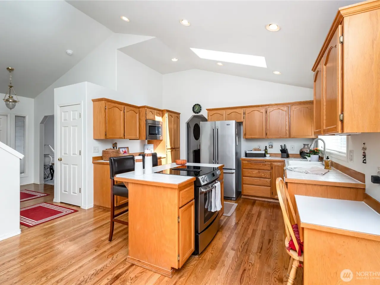 Great tri-level home located on a cul-de-sac in the desirable neighborhood of Kennydale! Step into a welcoming entryway w/ vaulted ceilings that set the tone for the thoughtful floor plan throughout. This home showcases soaring ceilings, skylights & inviting living spaces filled w/ natural light. The spacious kitchen has warm-toned cabinetry, SS appliances & bar seating--perfect for everyday living & entertaining. Upstairs, the primary suite boasts a double-door entry, vaulted ceiling, walk-in closet & 5-piece bath w/ soaking tub. Two additional bedrooms & full guest bath complete the upper level. The serene, fully fenced backyard offers two patios & beautifully designed spaces. Just minutes to 405, The Landing & May Creek Trail!