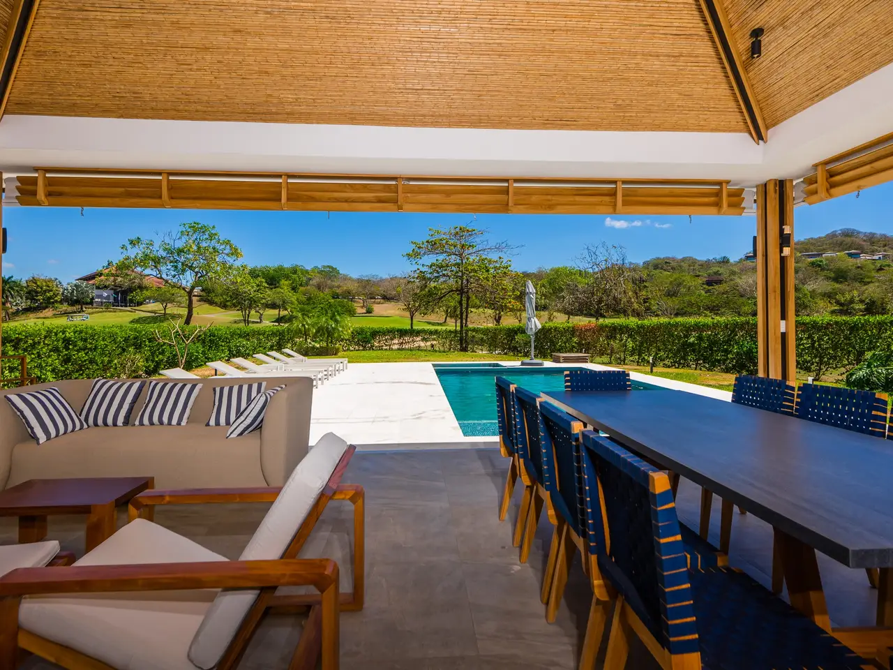 Located within the exclusive Llama del Bosque homes in Reserva Conchal, this single-story masterpiece epitomizes modern architectural elegance. Its strategic positioning alongside the enchanting golf course seamlessly integrates the residence with the vibrant natural surroundings, offering a privileged connection to Playa Conchal—one of the world's most renowned beaches. The interior unfolds to reveal four generously appointed bedrooms, including two luxurious master suites and two comfortable double bedrooms, all featuring private bathrooms and air conditioning. The open design of the social areas creates a harmonious, sunlit environment, blending the kitchen, living room, and dining area. High ceilings amplify the sense of spaciousness, offering breathtaking views of mountains, terraces, gardens, and the inviting pool. Beyond aesthetics, the residence is thoughtfully designed for convenience and luxury. Highlights include a covered terrace with a BBQ, TV, and outdoor furniture set, a swimming pool, jacuzzi, and well-maintained gardens with picturesque views. Practical features such as a laundry area, spacious pantry, storage room, covered garage for three cars, and parking for four vehicles enhance the overall functionality of the home. Situated on the pristine white sands of Playa Conchal, Reserva Conchal spans 2,300 acres and is a premier luxury gated community in Guanacaste, Costa Rica. Its A+ amenities cater to diverse interests, offering a PGA-level golf course, tennis courts, a modern fitness center, hiking and biking trails, and a Beach Club with multiple pools, paddleboards, kayaks, and bikes. Access to 13 bars, restaurants, and two spas at discounted rates, along with proximity to expat schools and the Liberia international airport, make Reserva Conchal a haven for families, retirees, and vacation rentals. Embark on the journey to tropical paradise and embrace the dream lifestyle that Reserva Conchal offers!
