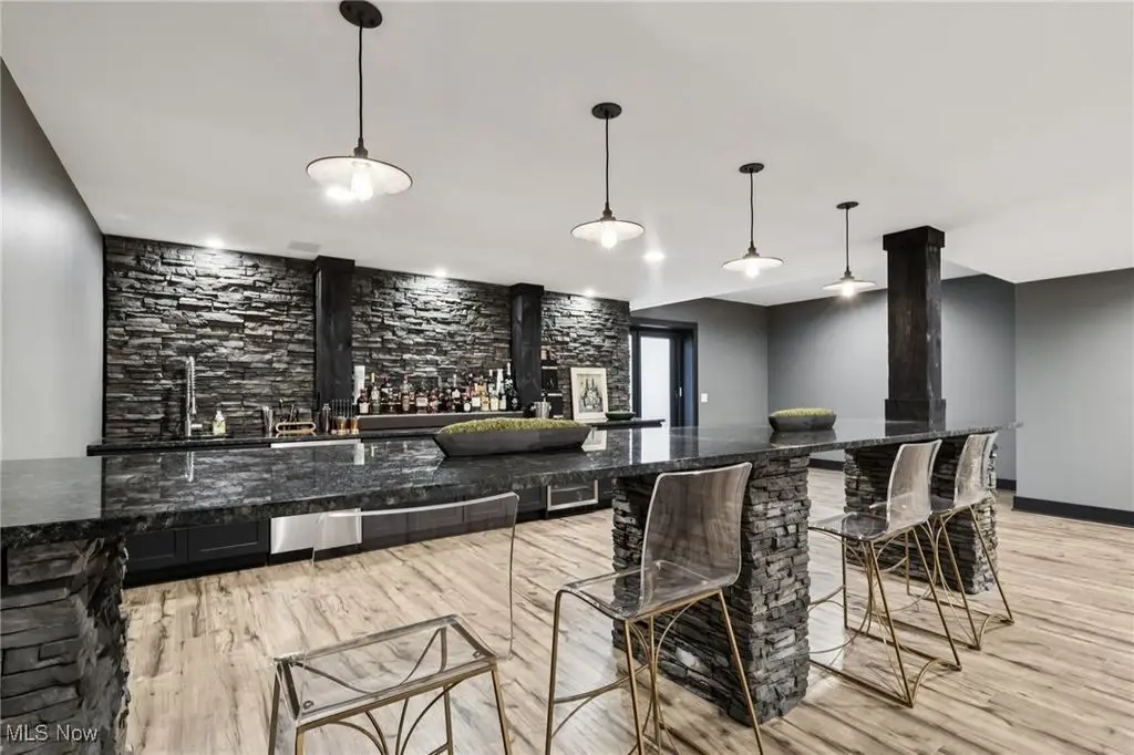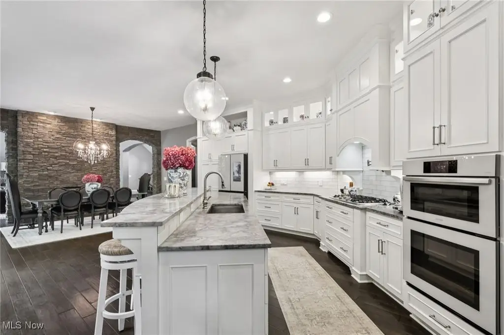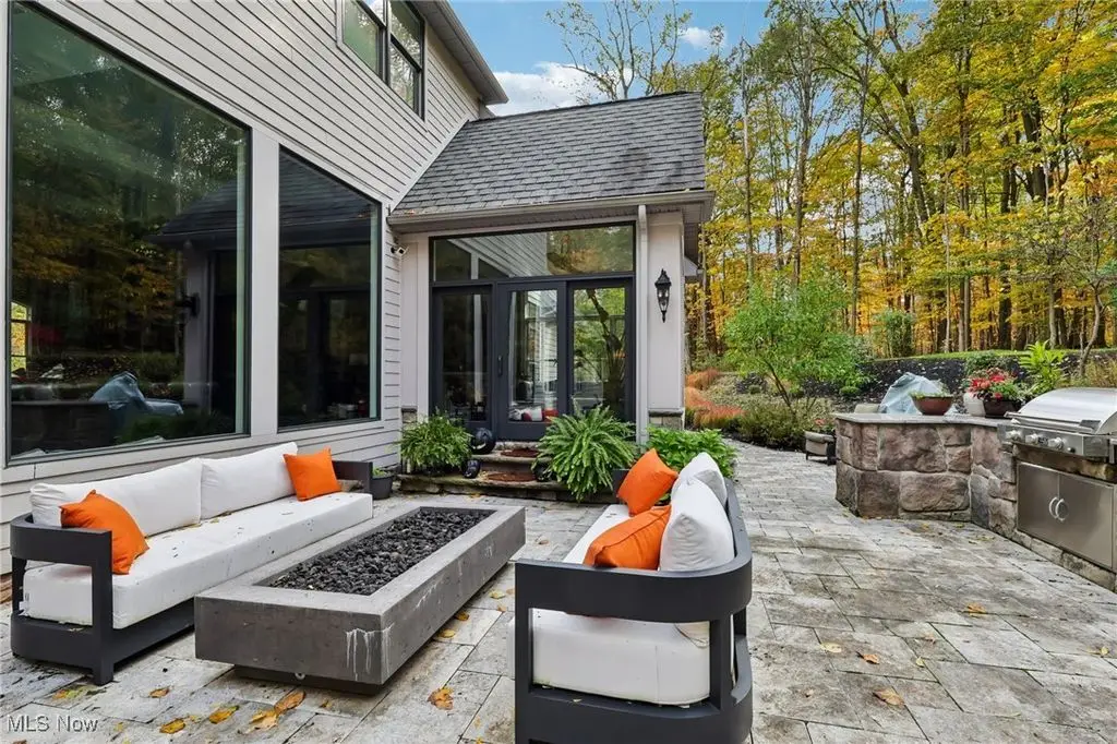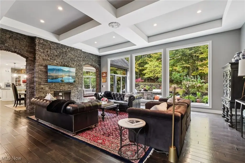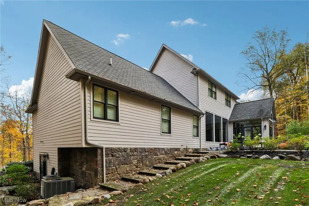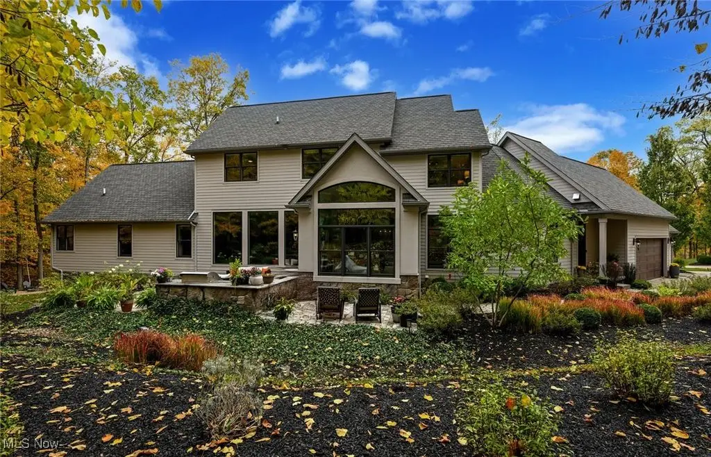 An oasis of luxury & tranquility by Ruggiero Builders. Nestled on 2 wooded acres w/ a gentle creek & sweeping natural views, this extraordinary custom built home combines elegance, comfort & superior craftsmanship. From the moment you step inside, the home's warmth & architectural detail unfold accented with spectacular Restoration Hardware lighting. As you enter, a grand great room is anchored by 2-sided stone fireplace, coffered ceilings & a wall off windows framing the scenic landscape. State-of-the-art kitchen boasts a generous granite island w/ breakfast bar, custom wood cabinetry & high-end appliances. This exceptional kitchen showcases an open floor plan that effortlessly connects the dining area/hearth room where a 2-sided fireplace adds warmth & character. Inviting sunroom w/dramatic vaulted ceiling & 3 walls of windows frame picturesque views of the outdoors. Designed for comfort, this layout creates a welcoming atmosphere. Retreat to the first floor primary suite, a serene haven w/ spa inspired glam bath, soaking tub, granite vanities, & walk-in glass shower. Oversized, custom walk-in closet, w/ his/her areas & built-ins. Adjacent library w/ rich millwork & double entry doors provides a perfect setting for work/relaxation. Upstairs, 3 large bedrooms offer privacy & comfort, incl. one ensuite & a well-appointed jack/jill bath. Walk-out lower level is designed for enjoyment/entertaining. Full wet bar w/ granite counters, wine coolers, & high-top seating for 12 boasts a game room, rec room, & gym designed for fun & relaxation. Half bath & wine storage complete this level. Take the fun outdoors & walk out to the yard & fire pit for cozy evenings. Outdoor living rivals the interior w/ a beautiful silver travertine patio for dining w/ built in grill, granite bar & gas fireplace table. The property is enhanced with integrated security & exterior cameras. This is more than a place to live-it's a place to create memories, unwind in style & live your best life!