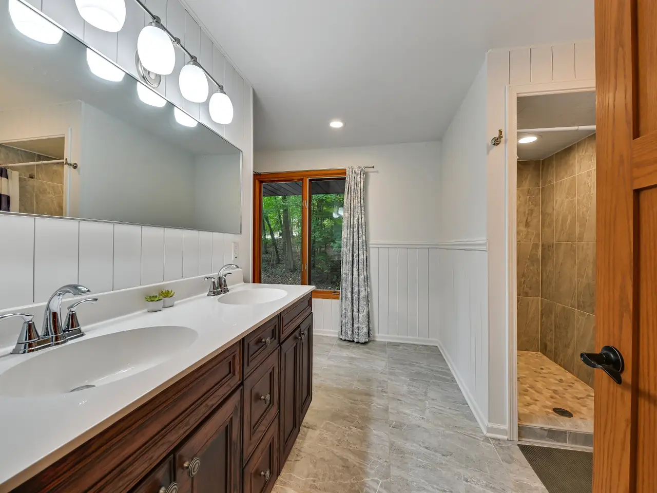 Tucked away in a serene setting in the Kettle Moraine, this Prairie-Style home blends natural beauty with modern comfort. Expansive windows and a skylight fill the home with light. The large kitchen features SS appliances and a wall of windows overlooking the 3-season room and deck. The bright living room offers HWFs and a sleek FP. Upstairs, 2 bedrooms with window seats share a pristine bath. The walkout LL is built for entertaining with FR, wet bar, bonus space, and 3rd full bath. Outside, enjoy the spacious deck nestled among trees. Enjoy the shared lake access for kayaking and fishing. Bring your UTV and enjoy the Kettle Moraine roads directly from your garage. Updates: New roof, interior/closet doors, hot tub, epoxy garage floor, refinished HWF and more. Don't miss this gem!
