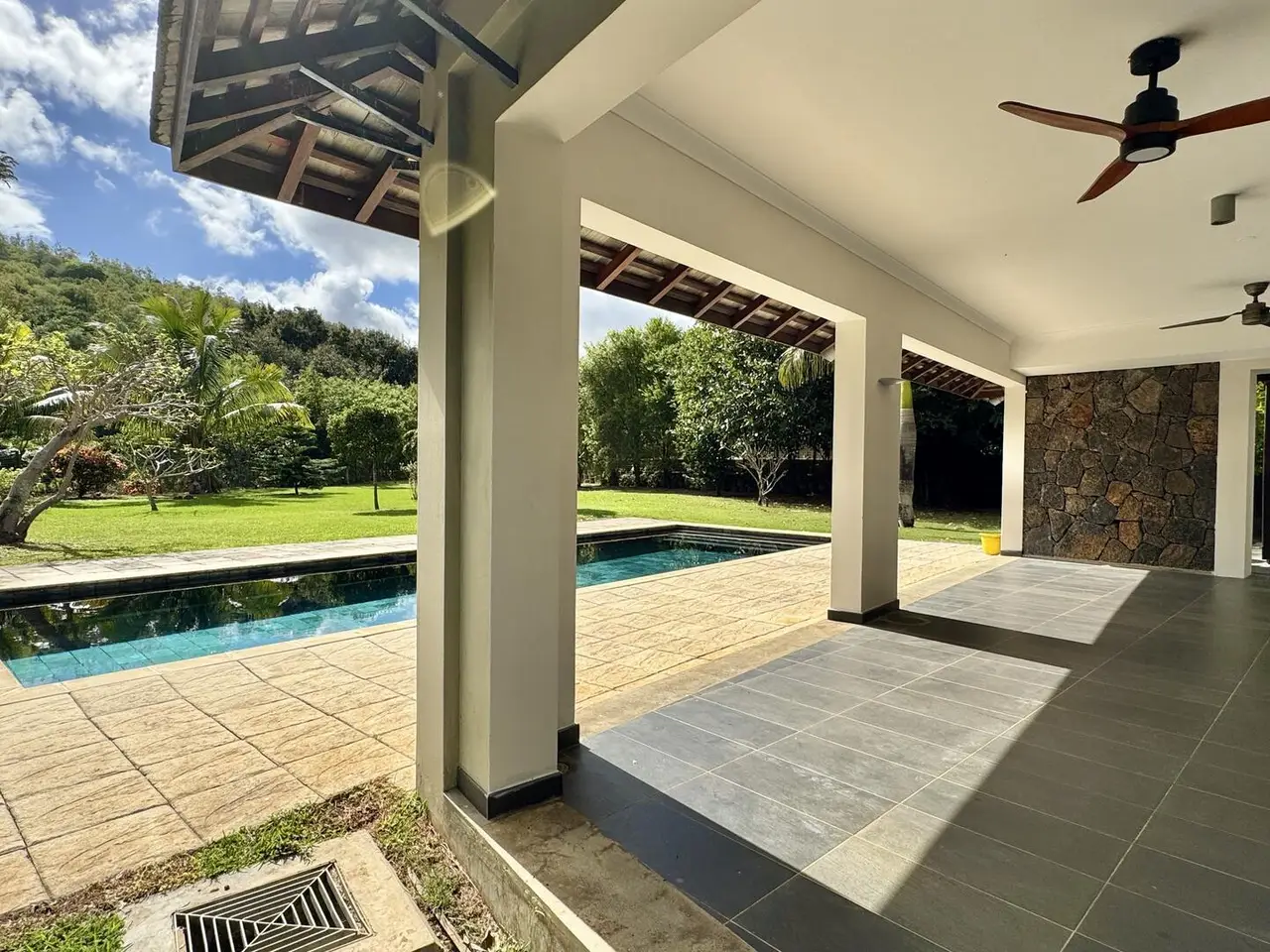 Surrounded by mature gardens and framed by mountain views, this 4-bedroom villa in Rivière Noire presents a refined lifestyle opportunity under the IRS scheme — ideal for foreign buyers seeking a luxury property in Mauritius. Set on 2086 m² of land with 497 m² of built area, the home combines contemporary comfort with fluid indoor-outdoor living. A covered veranda extends beside a private stone-edged pool, creating a natural flow from the spacious lounge and dining zones. Inside, soft light enhances the clean finishes and feature stonework, while the kitchen invites easy, sociable cooking. The villa offers four generously sized bedrooms and three well-appointed bathrooms, ensuring space and privacy for family or guests. One of the bedrooms opens onto a panoramic terrace with sweeping views — perfect for relaxing moments from sunrise to sunset. Built in 2015 and located in a secure residential estate, the property includes three parking bays and electric water heaters. A peaceful yet connected address for those seeking a long-term investment in Mauritius' west coast lifestyle. Contact DIANE WATKINS – Property Consult for a private viewing!