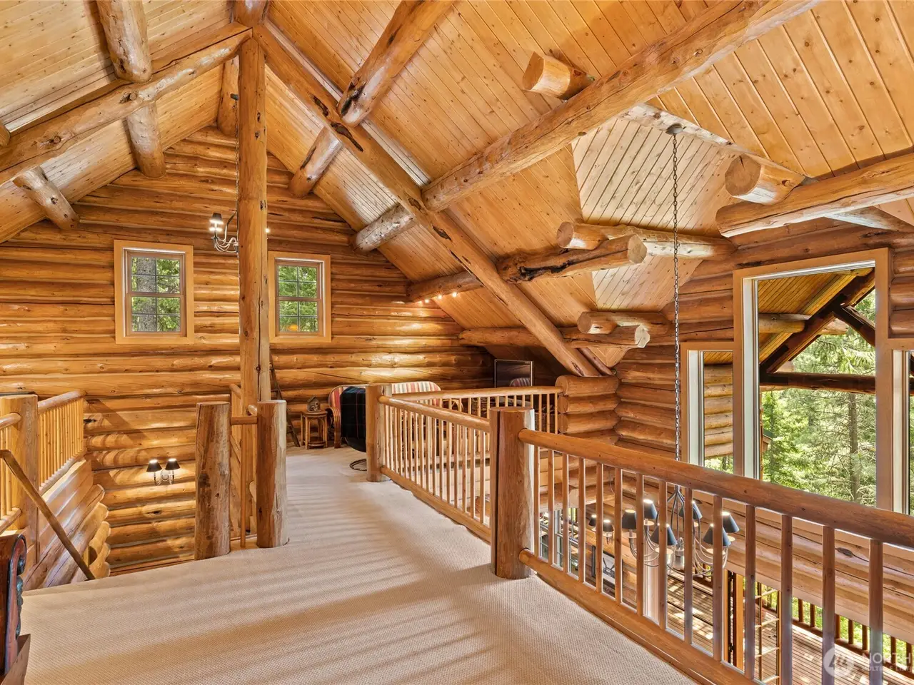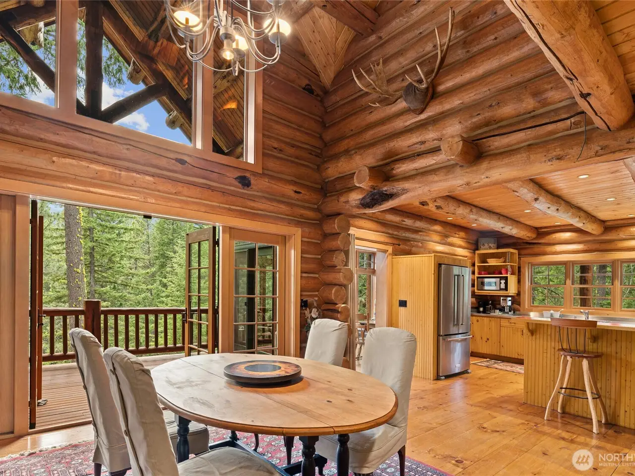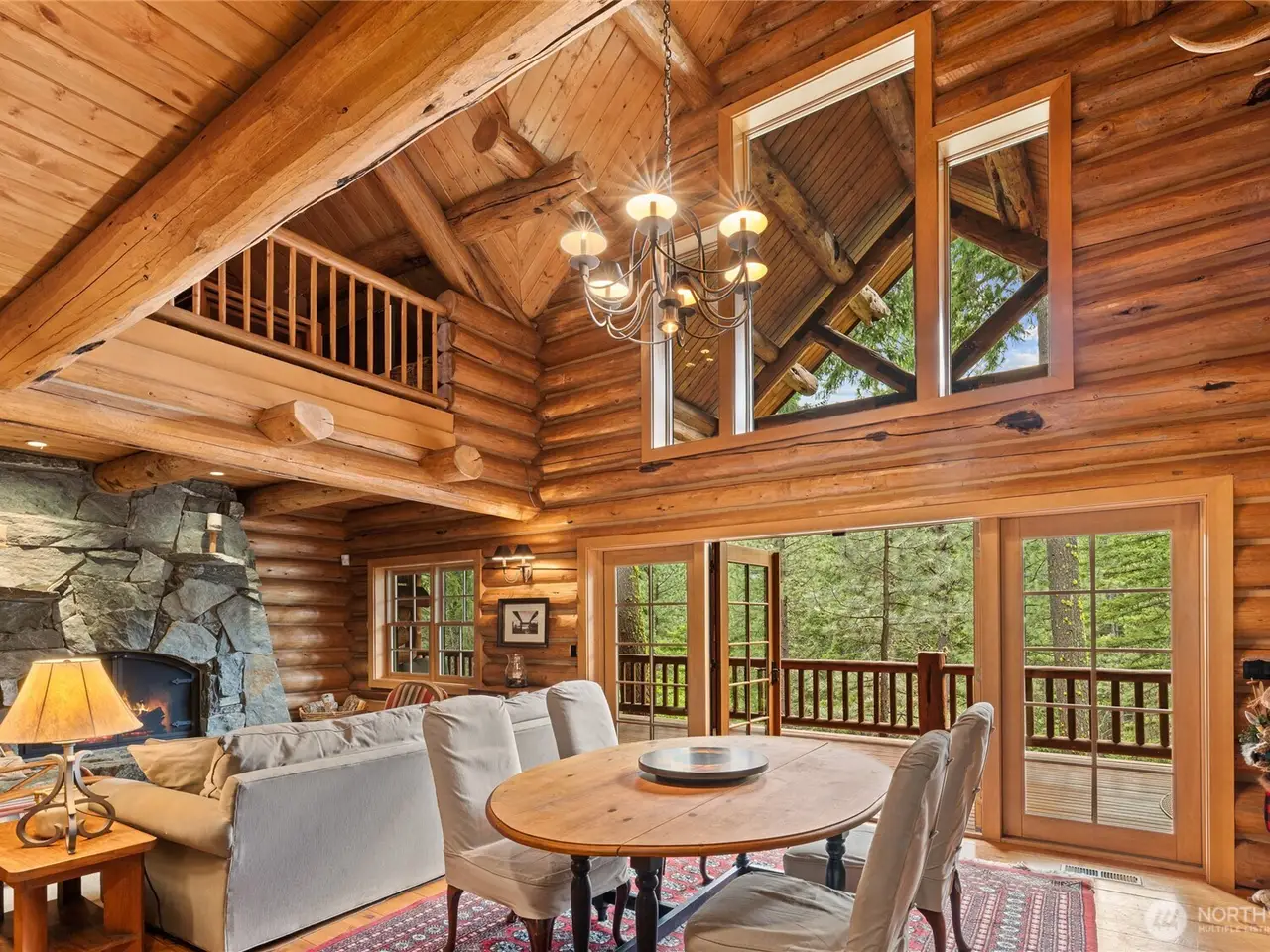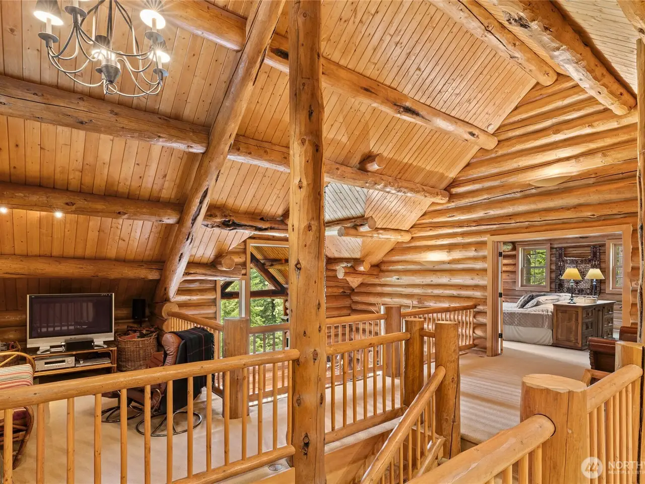 Custom log home with soaring vaulted ceilings and log beams