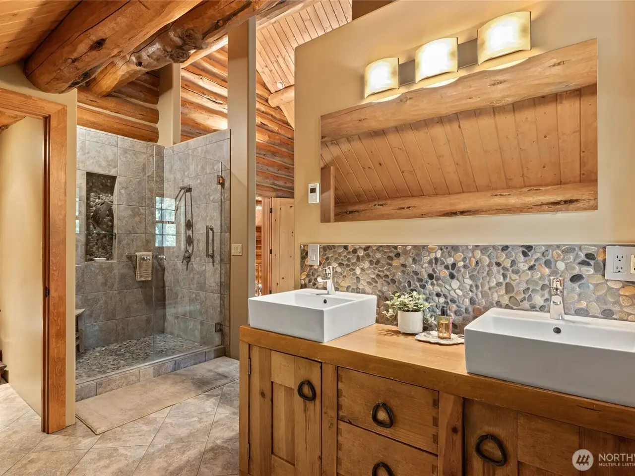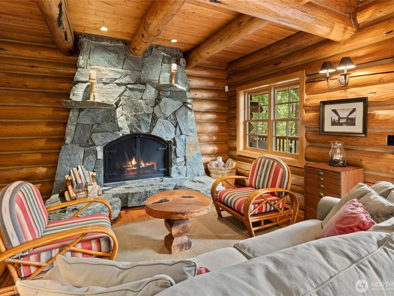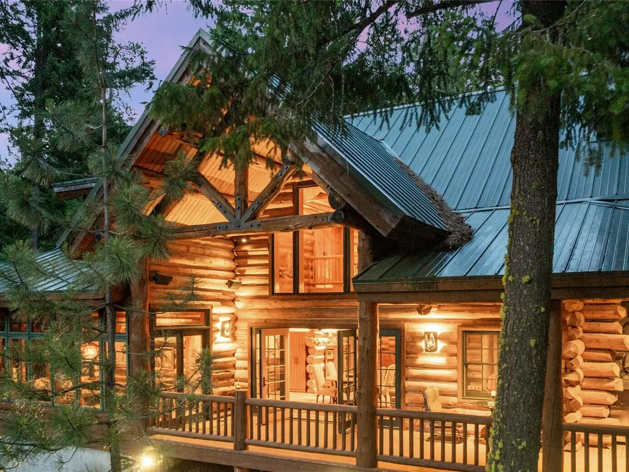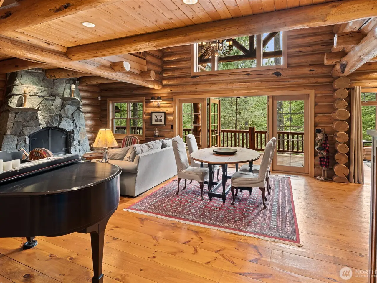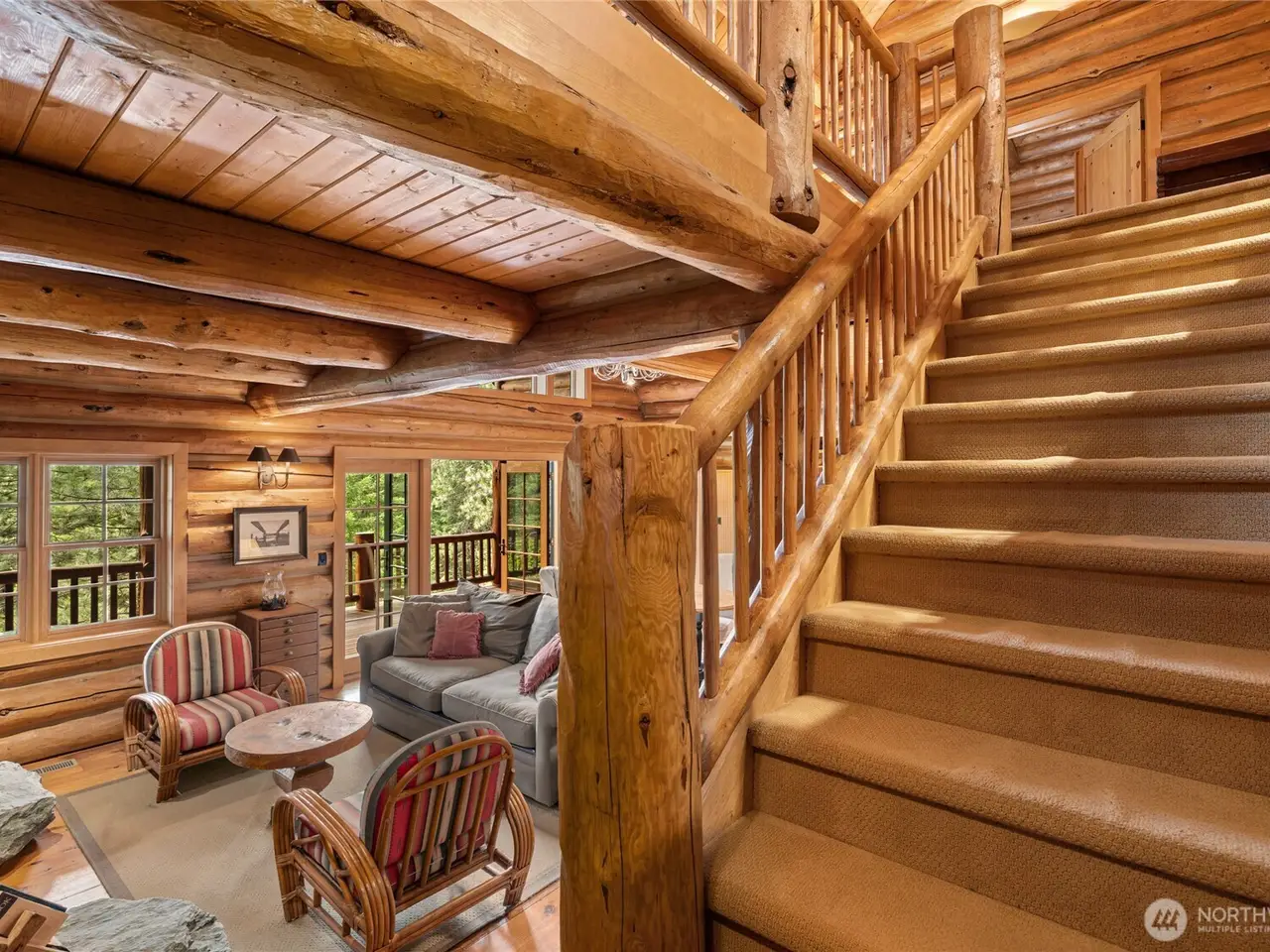Custom log home with soaring vaulted ceilings and log beams