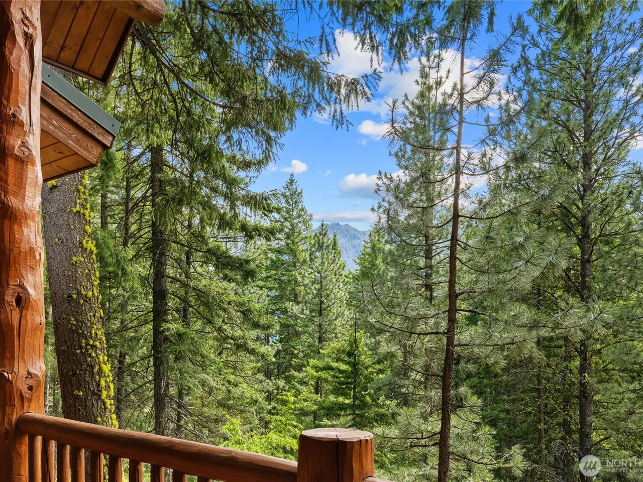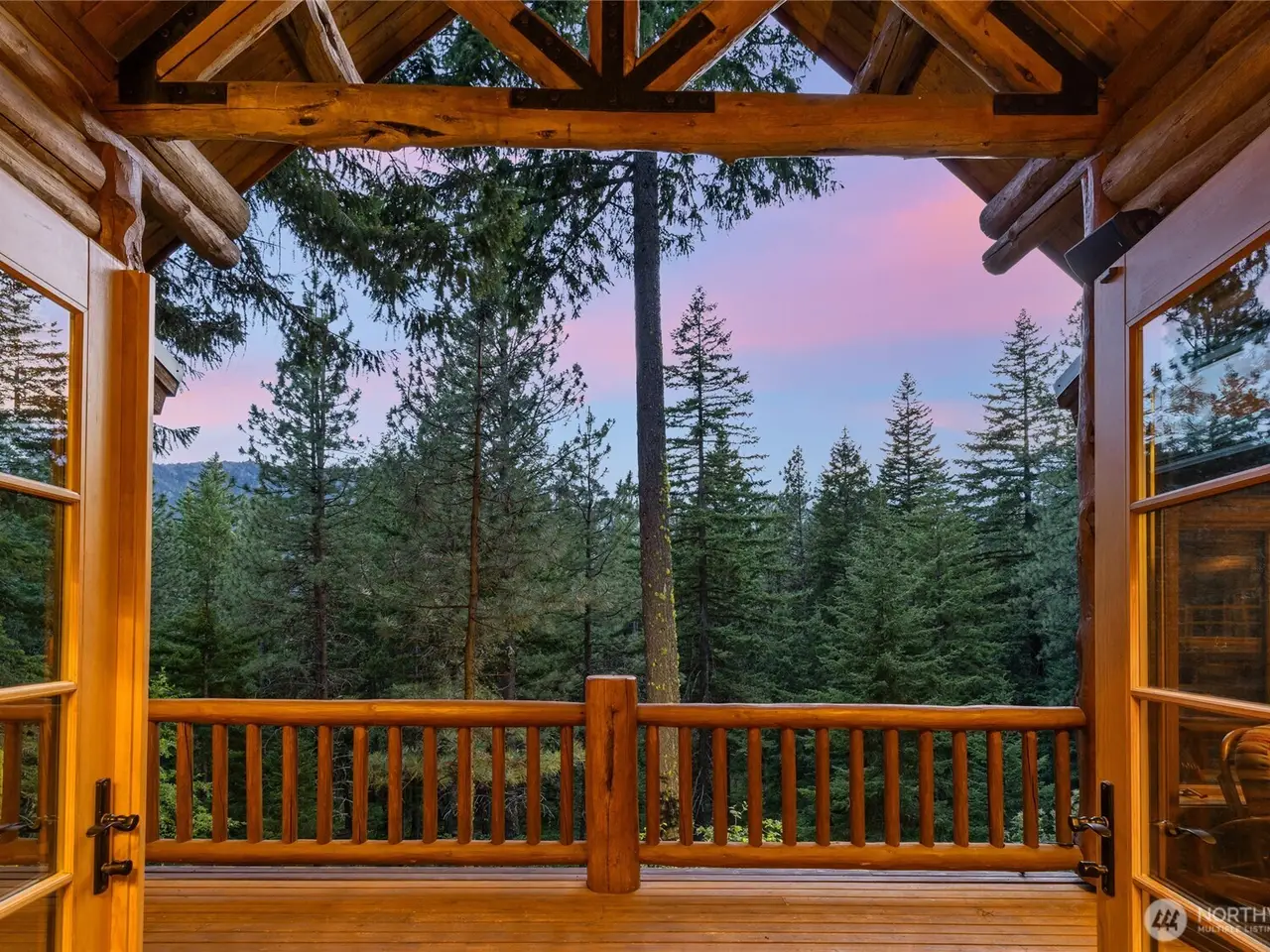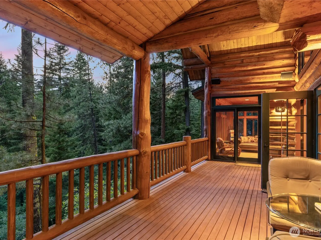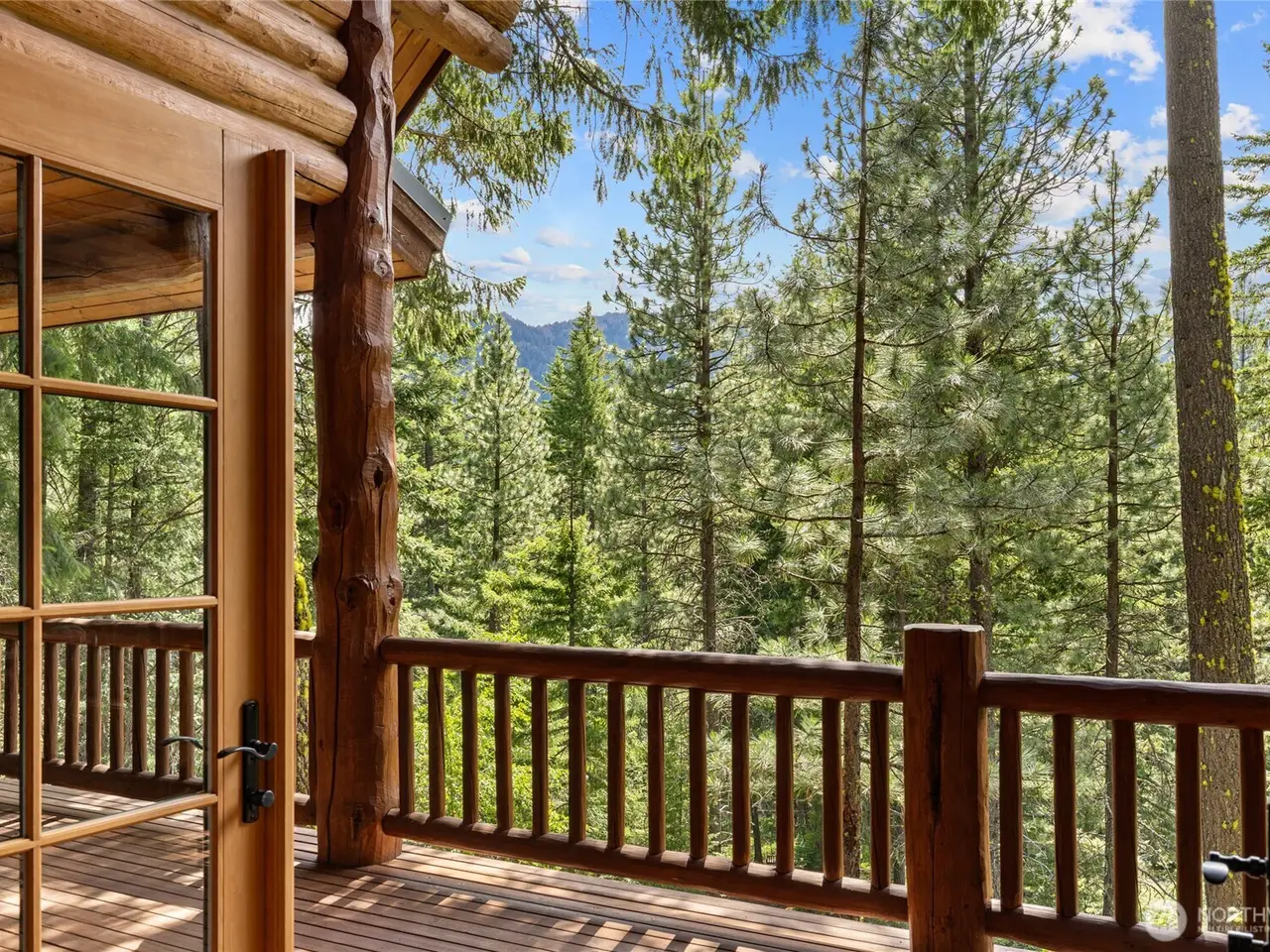 Covered wrap-around deck with mountain views