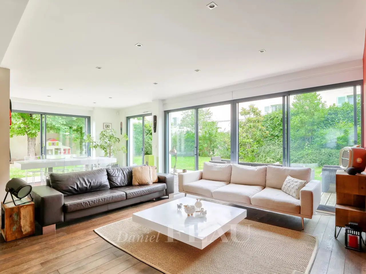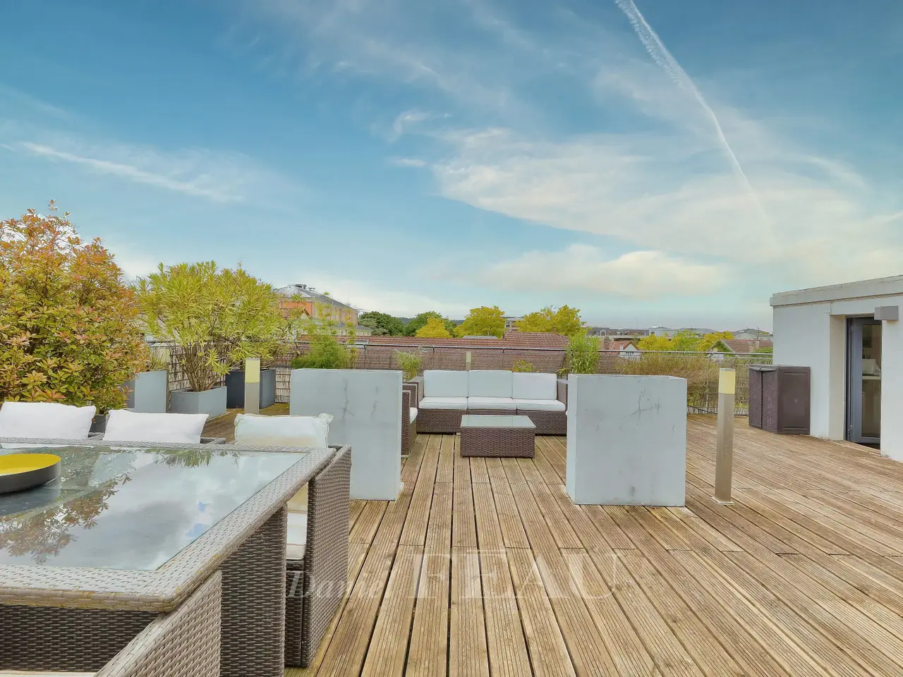 This magnificent apartment with the feel of a private house is located in the centre of Rueil-Malmaison a short distance west of the capital. Benefiting from private lift access to all floors, it includes a triple living/reception room with a gas-fired fireplace opening onto a 300 sqm south-east facing garden, and a separate kitchen with dining facilities opening onto a terrace. Upstairs a wide landing leads to four bedrooms (one with a shower room) and a bathroom. The second floor comprises a master suite with a bath/shower room and dressing room, and two further bedrooms with a shower room. A 93 sqm roof terrace with a hanging garden is on the top floor. The basement comprises a home cinema, a utility room and a two-car garage. The apartment also benefits from an outdoor parking space.