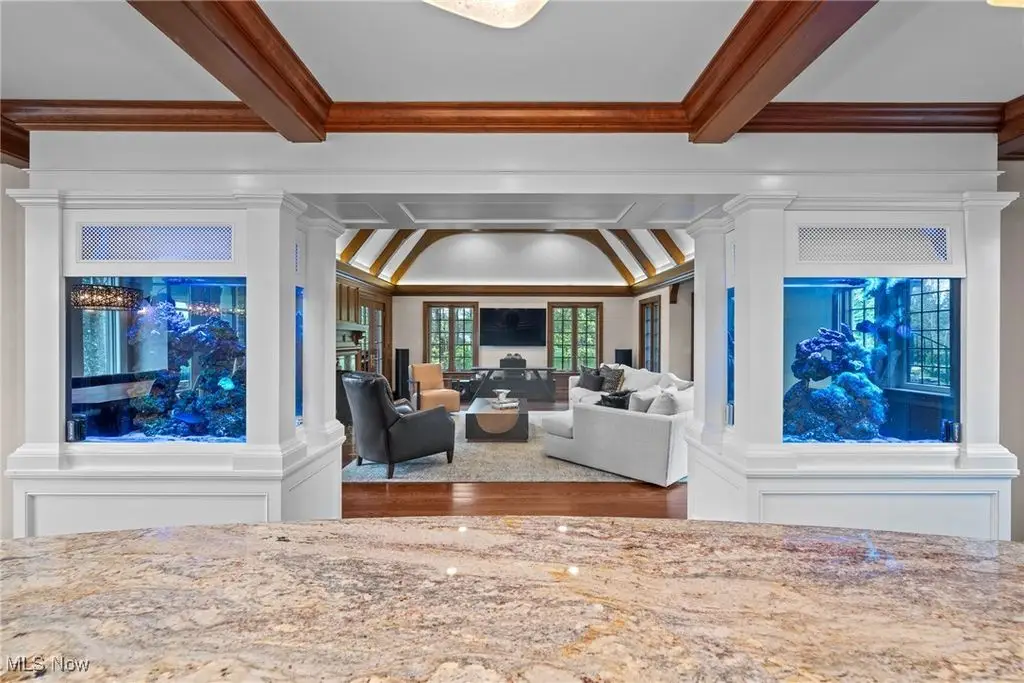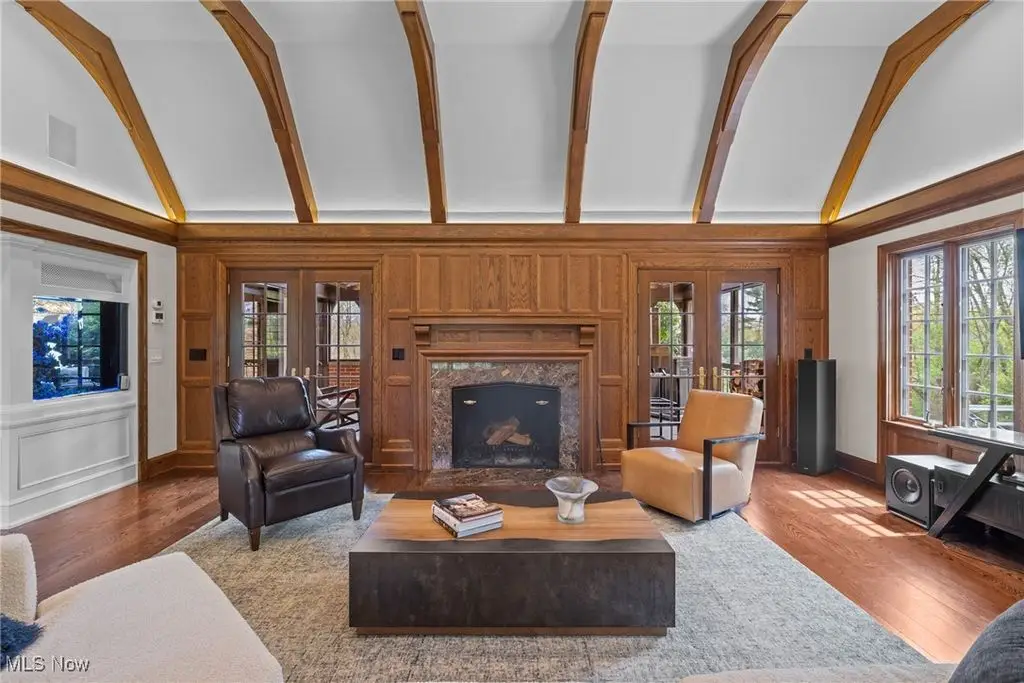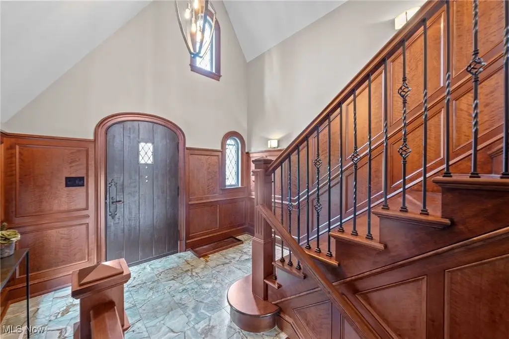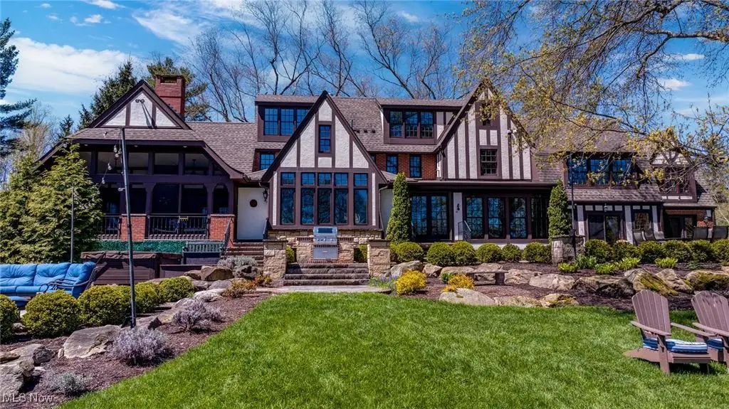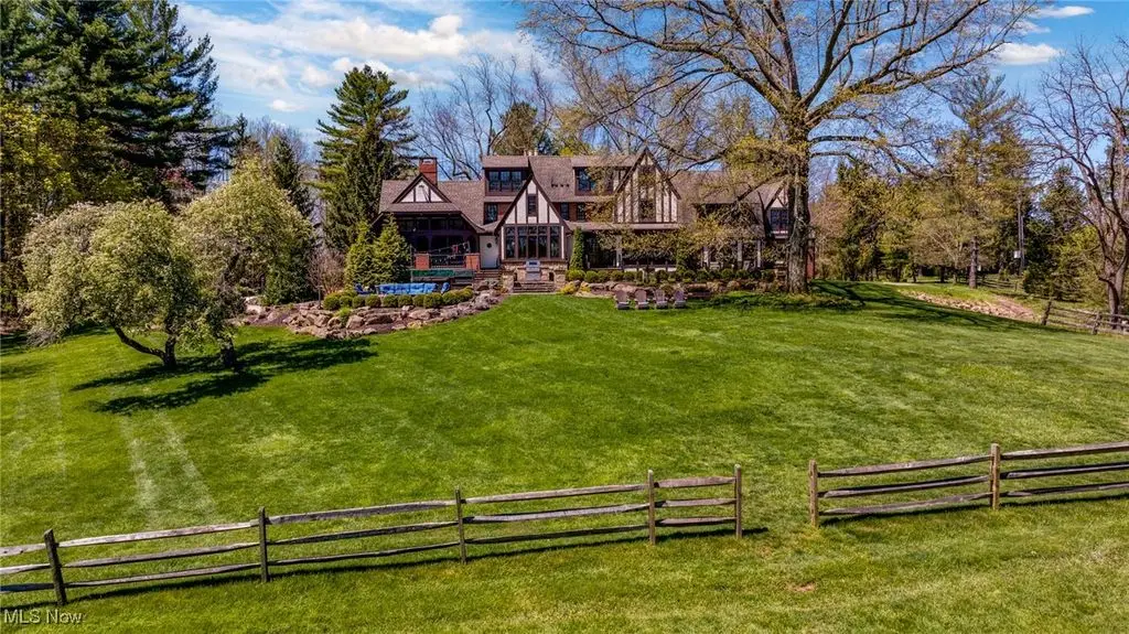 A magical home and property, this exquisite English Tudor manor circa 1917 is sited on 24+ breathtaking acres with Chagrin River frontage in the heart of the Chagrin Valley! The present owner has renovated this home to perfection while maintaining the homes original charm and character! A circular driveway and professional landscaping accentuate the handsome tudor facade and the gorgeous walkway that leads to the front door. As one enters through the front door, you will immediately notice the incredible architectural charm coupled with the modern amenities that make this home a staple of luxury living! At the heart of the home is the spectacular kitchen which features custom cabinetry, high end professional appliances, granite countertops, and two islands! This one of a kind kitchen opens into the grand dining area, incredible vaulted great room, and the charming screened porch. The great room is extraordinary featuring a beamed vaulted ceiling and magnificent fireplace. Off the main entrance foyer is the private library, a fabulous scullery(second kitchen), glass walled atrium, and the incredible billiard room. Also on the first floor is the 5th bedroom(guest suite) with private bathroom. The second and third floor offer 4 incredible bedroom suites including the most luxurious owners suite. There is an incredible bedroom(dramatic vaulted beamed ceiling and fireplace,) gorgeous bathroom, and two custom walk-in closets. A finished lower level has a mudroom, exercise room, and more! The setting and grounds are truly breathtaking with Chagrin River frontage, valley views, and a sweeping rolling lawn. You can entertain on the expansive stone terrace, relax in the hot tub, or entertain in the incredible outbuilding! This multi functional building has a fabulous game room/pub room as well as a functioning barn area. Car enthusiasts, hobbyists, or even horseback riders will love this one of a kind space! A truly one of kind jewel in the heart of the Chagrin Valley!