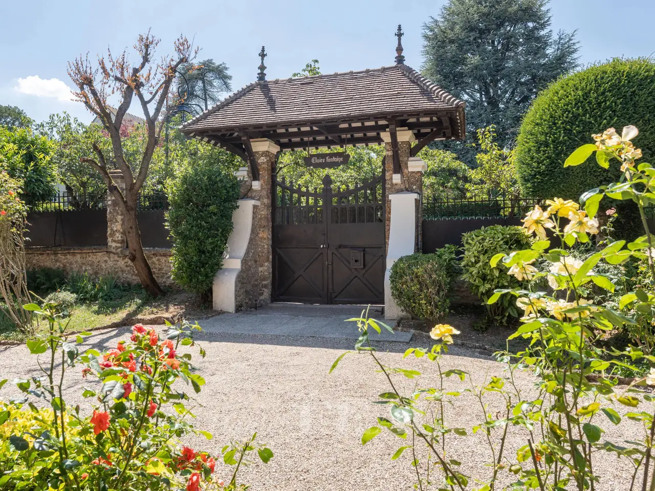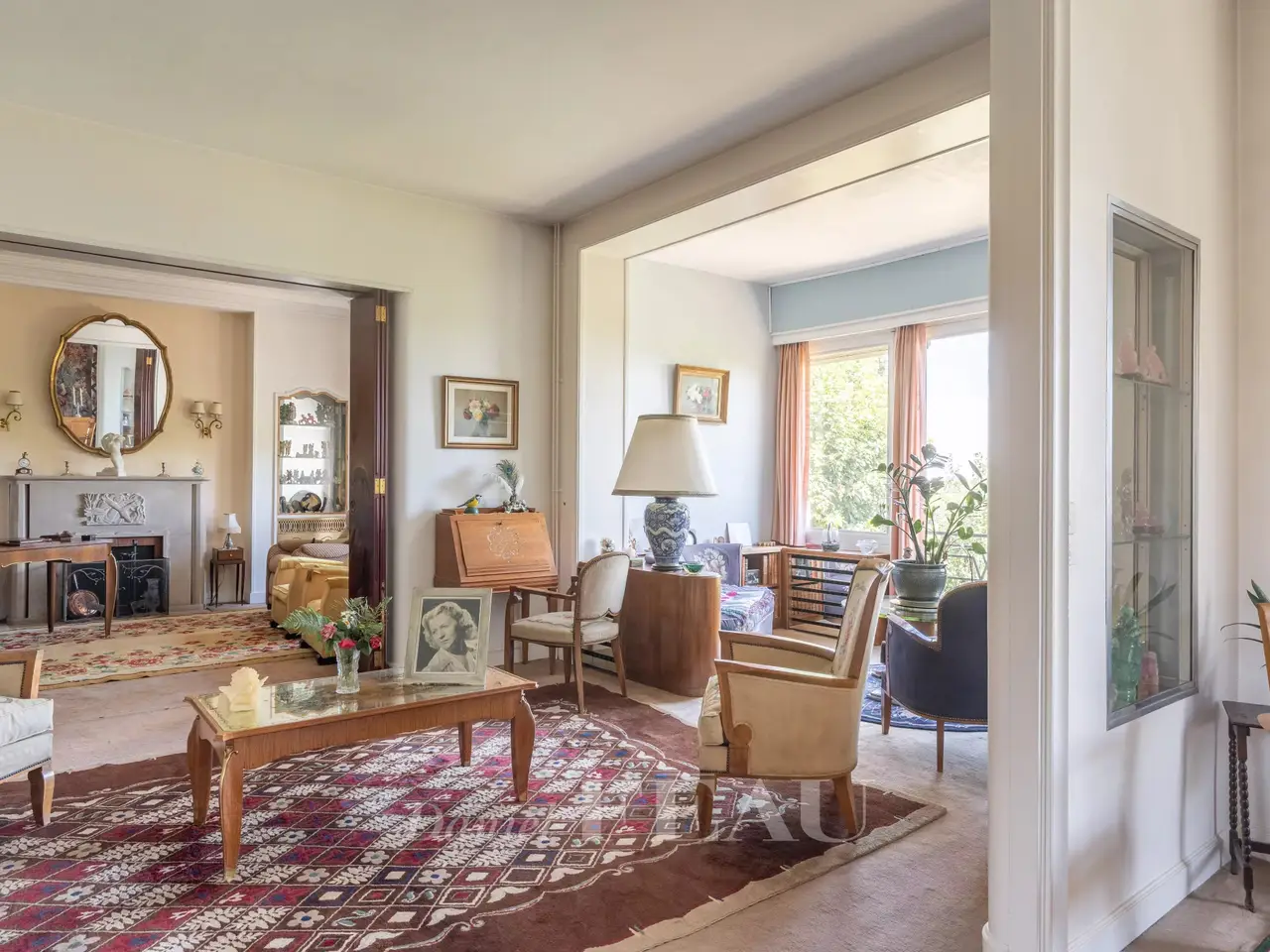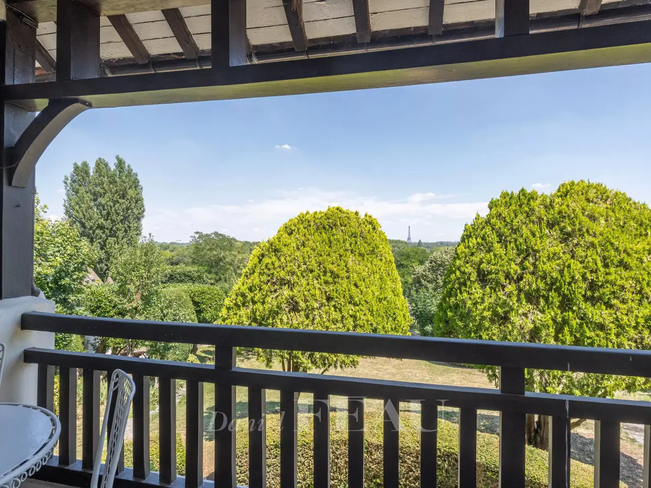 Val d’Or neighbourhood. This early 20th century Anglo-Norman style property is in one of Saint-Cloud’s most sought-after streets a stone’s throw from the station. Entirely decorated by renowned interior decorator Jules Leleu, it includes a spacious entrance hall, a triple living/reception room bathed in sunshine and overlooking the landscaped garden benefiting from an open view of the Bois de Boulogne and the Eiffel Tower, a spacious kitchen, a study, and a bedroom with a bathroom. Upstairs are three further bedrooms (two opening onto a balcony), and two bathrooms. On a basement with a self-contained 31 sqm studio apartment. With a near 100 sqm annex comprising a 3-room apartment, a 35 sqm recreation room and a double garage.