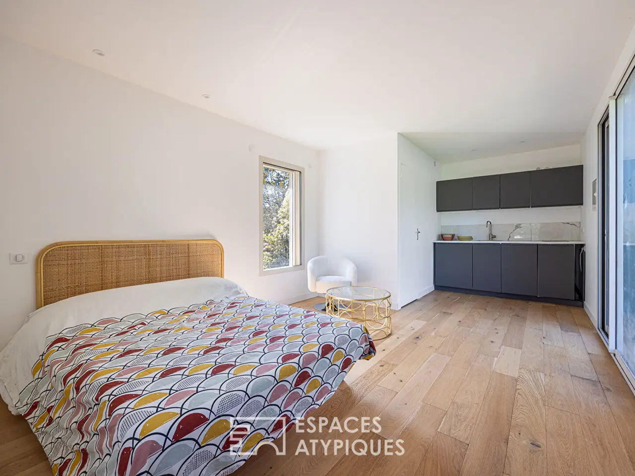 On the ground floor, the master suite benefits from its privacy. It benefits from its private bathroom with shower, bathtub and toilet as well as its dressing area and its terrace overlooking the swimming pool. A back kitchen serving as a pantry and laundry room provides daily comfort, while a workshop with independent entrance opens the way to a creative, sports or professional space. Upstairs, four bright bedrooms with varying orientations share a contemporary bathroom and a third separate toilet. A separate studio with a fitted kitchen, a bathroom with toilet, and a terrace completes the property. Ideal for hosting family or friends, or as a summer kitchen.