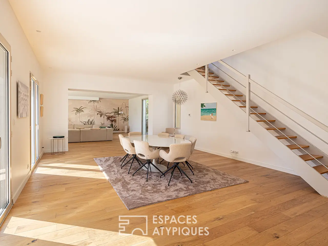 From the entrance, the tone is set: space, light and modernity. The vast living room, punctuated by large bay windows, offers a fluid connection between interior and exterior. Open and elegant kitchen, convivial dining room, double living room: each space invites relaxation and conviviality.