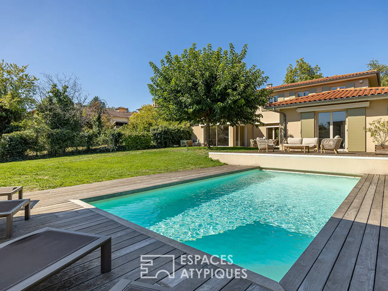 The exterior invites you to fully enjoy the beautiful season: multiple terraces, a private garden, and a sun-drenched swimming pool. Built to recent standards, the house boasts excellent energy performance, a guarantee of comfort and energy efficiency. A rare address where contemporary architecture blends with a relaxed lifestyle, in the heart of one of the most sought-after villages in the Monts d'Or.