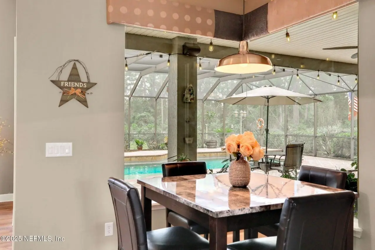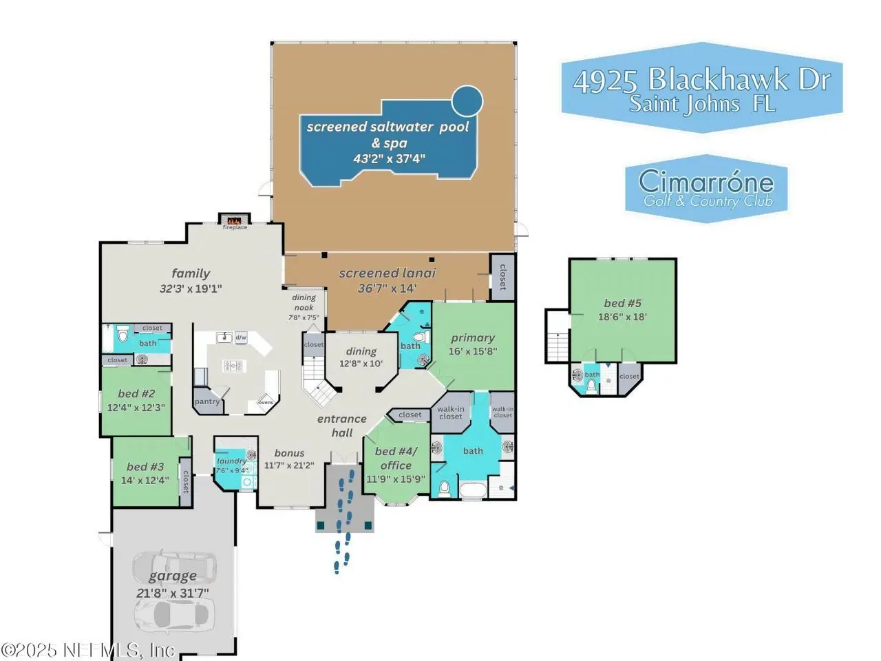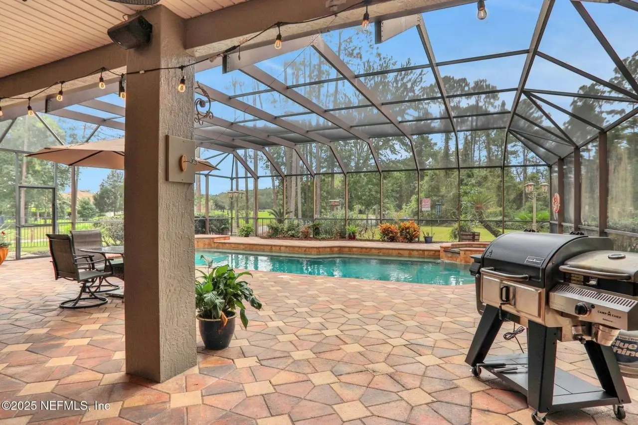 This stunning St. Johns County pool home is situated on nearly 3/4 of an acre in the desired estate-section of Cimarr?ne Golf & Country Club. This impressive residence offers a breathtaking long view of the 16th tee, lagoon and nature preserve.Leaded-glass double doors lead to the grand Entrance Hall that naturally guides you through this thoughtfully designed home. The magnificent Primary Suite commands the entire side of the home and is complete with tray ceilings, double walk-in closets, and atrium doors to the pool paradise. The oversized bath retreat has a shower, separate soaking tub, two large vanities and a water closet. Flanking the Primary is a cabana bath and one of the five bedrooms currently serving office-duty. The other side of the home has two generously sized bedrooms sharing a well-appointed 2-room bath. The grand central staircase is surrounded by two flexible bonus rooms that can easily transform into additional office or dining. The upper-level surprises with 350 sq ft of multi-generational living featuring cathedral ceilings & spectacular views. With its own bath and walk-in closet, this versatile area would also be perfect as a gym or homeschool headquarters.The heart of this home is the massive great room where soaring cathedral ceilings frame the dramatic wall of windows capturing the enchanting view. There's plenty of space to gather around the fire while others enjoy the attached Billiard Room that could be enclosed for a 6th bedroom.The open-concept flows seamlessly into the kitchen, bordered by an impressive wrap-around quartz breakfast bar with seating for six or more. The kitchen combines functionality with style, featuring natural wood cabinetry with 42-inch uppers, some with glass doors for displaying collectables. Chef's favor this kitchen with its stainless appliances, built-in ovens and an induction cooktop island. Keeping it tidy is easy with two pantry closets. The attached, glassed dining nook overlooking the pool is the perfect spot for breakfast. Speaking of the pool. The new favorite hangout awaits in the spectacular 2,100 sq ft of screened outdoor living. The heated saltwater pool features a tanning shelf and wrap-around in-pool bench. The pool and spa are surrounded by tropical landscaping and charming gas-look vintage street lanterns. The entire space is covered with unique, intricately designed multi-sized paver flooring. The major equipment including salt-cell, heater, filter, and main pump have all been updated within the past few years. The overhead screens were replaced last year. Additional highlights of this home include an oversized sunlit laundry room with convenient laundry sink, plentiful folding counters, and abundant storage. Luxury vinyl plank flooring flows through living areas and the second floor, while wood flooring graces the Primary Bedroom. Plantation shutters dress the front windows, complementing the twelve-foot ceilings and seven-foot interior doors. Double and triple crown molding, wainscoting and other unique wood trim found throughout the home. There is surround-sound both inside and out, a money-saving separate irrigation water meter, durable epoxy garage flooring, and an ongoing termite protection program. Cimarr?ne Golf & CC offers amenities that rival any resort. The spectacular Resident Clubhouse has a fitness center, double-sized pool with separate lap section along with a splash-park feature for the kiddos. Expansive recreation includes tennis, pickleball &