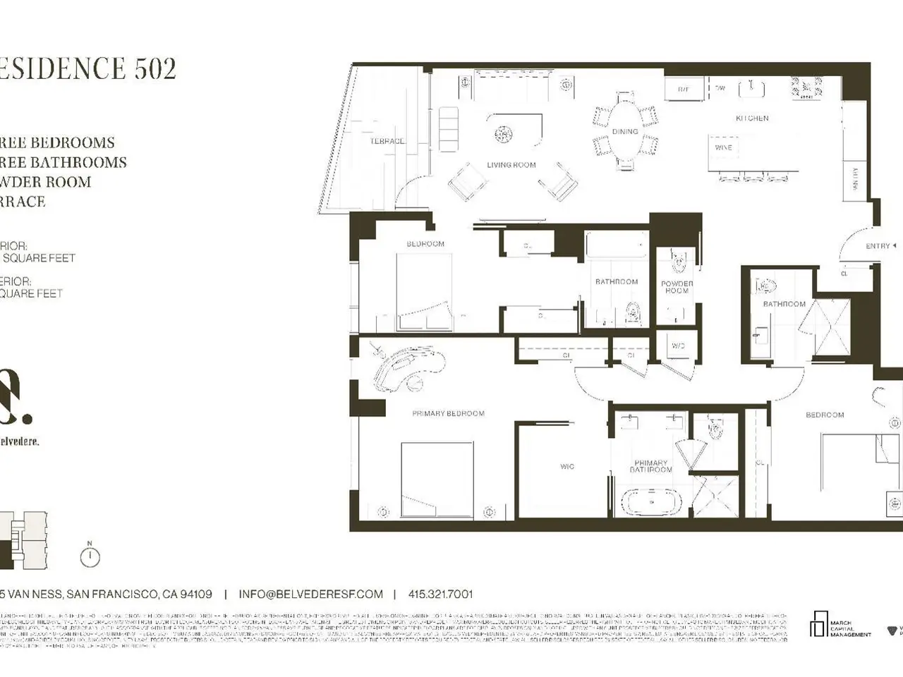 The Belvedere, designed by world-renowned Handel Architects, is a culmination of elevated architectural design, tailor-made shared spaces, and 28 brand-new refined homes gracing San Francisco's prestigious Cow Hollow neighborhood. A concrete and steel structure built in 2024, The Belvedere features an exquisite, attended lobby, and incredible views captured from the two and three-bedroom homes. Crowning The Belvedere is an expansive, 6,200 sqft resort-style roof terrace with picture perfect views of the Golden Gate Bridge and San Francisco's most notable hills. The elegant kitchens include Miele appliances and gorgeous Gabana Quartzite stone, while the spa-like bathrooms are equipped with Waterworks fixtures and adorned in imported Calacatta stone. Additional features include: air conditioning, add'l storage, and bicycle parking. Residence 502 is a Golden Gate Bridge VIEW home boasting 3 beds/3.5 baths and 1,951 sqft with a spacious great room that leads to a covered terrace. The Belvedere is in a fantastic walking area, with the bustling shops, restaurants, and cafes of Union St in Cow Hollow right outside your door. Russian Hill, Pacific Heights, and The Marina are all just minutes away.