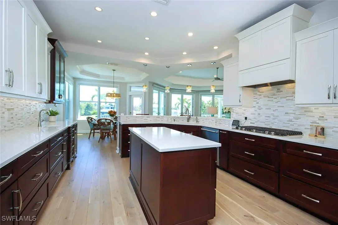 Nestled on a coveted deep-water canal basin on Sanibel Island, 877 Limpet Dr. is a boater's paradise with luxury throughout. This elevated 3,286 sq. ft. home, remodeled in 2019 by Kennedy Const., blends modern elegance with functionality. This home is on a concrete seawall and boasts a 45ft slip designed for a 30K lb. lift, an adjacent 10K lb. lift for a fishing boat, and a 3-car-sized boat trailer garage alongside a 3-car-plus garage, both with A/C storage. Enjoy direct, no-bridge Gulf access in just 5 min. and with the services of the Sanibel Marina only 500 yds away, adventures begin at your doorstep. Inside, a great room opens to a chef's kitchen with custom cabinetry and waterside dining area, perfect for entertaining. Other key features include European white oak floors, impact windows, powered storm shutters, a spacious rec area, pool, patio, and deeded beach parking and access a mile away. Additionally, this home has a 24KW Generac generator with two propane takes totaling 1250 gal. The 45 foot boat slip was designed for a 30K lift and has a pedestal with (2) 30amp and (2) 20amp outlets. The existing 10K lb. lift adjacent to slip has (2) 15amp outlets. Lower level has 3 mini-split units for A/C. Located on Sanibel's East end, this home is just 550 yards from Sanibel's Causeway Blvd and 1.5 miles from the Sanibel Lighthouse. Explore 25 miles of bike paths and J.N. "Ding" Darling Refuge. This waterfront gem offers unmatched design and boating amenities!
