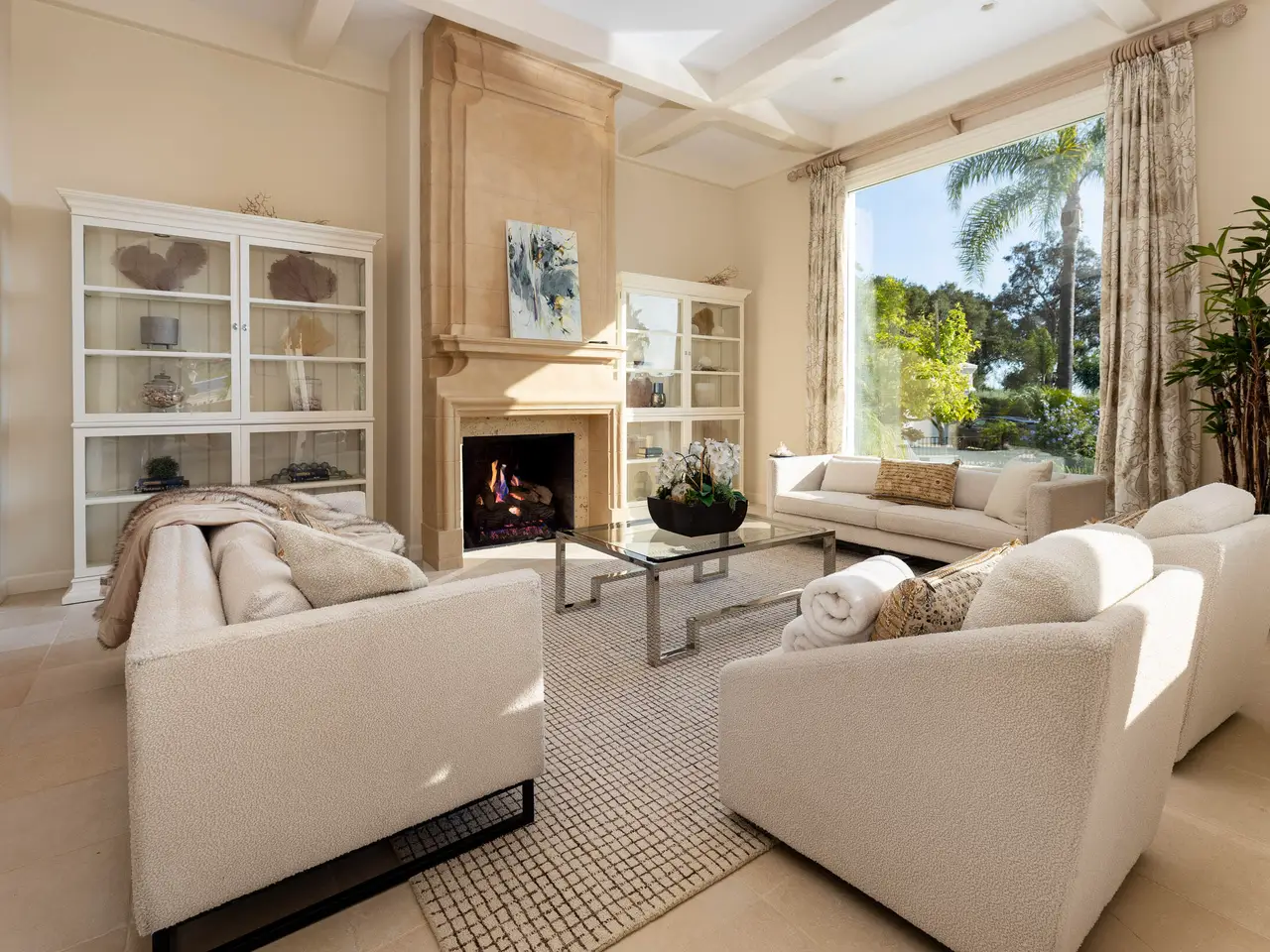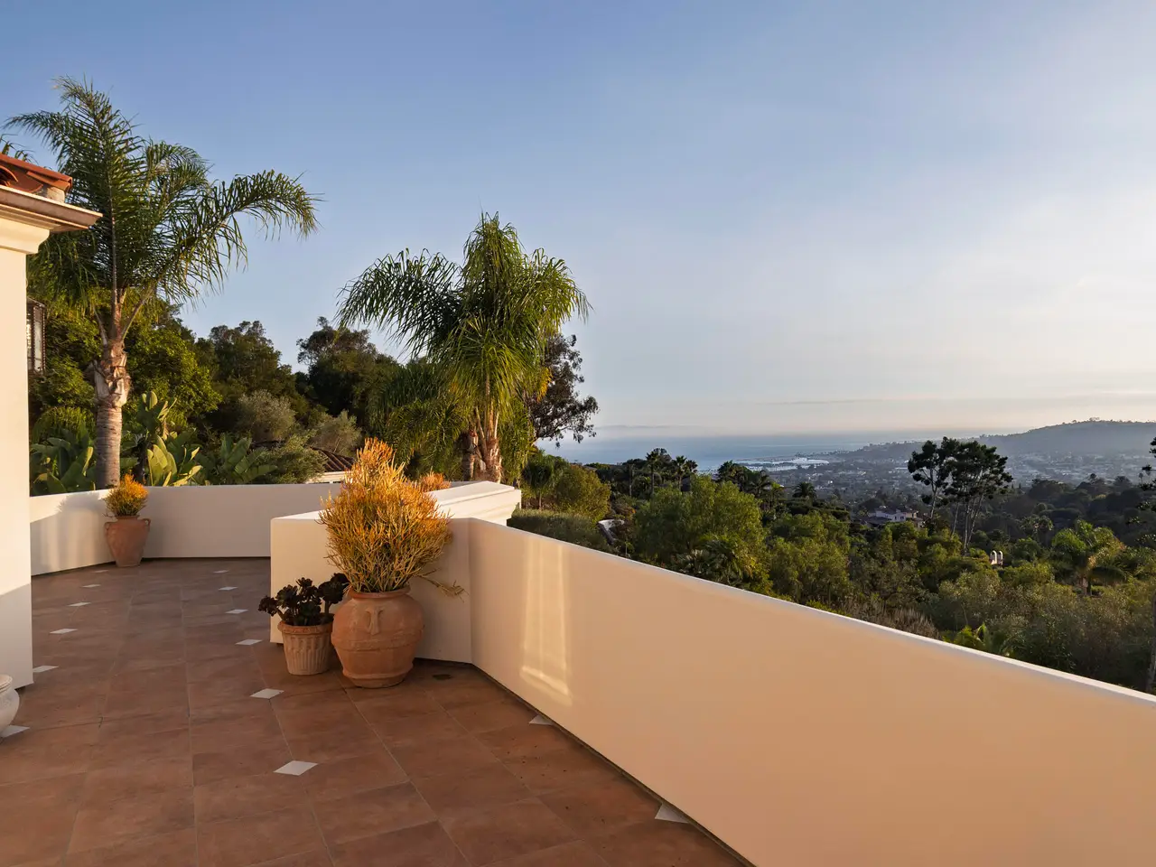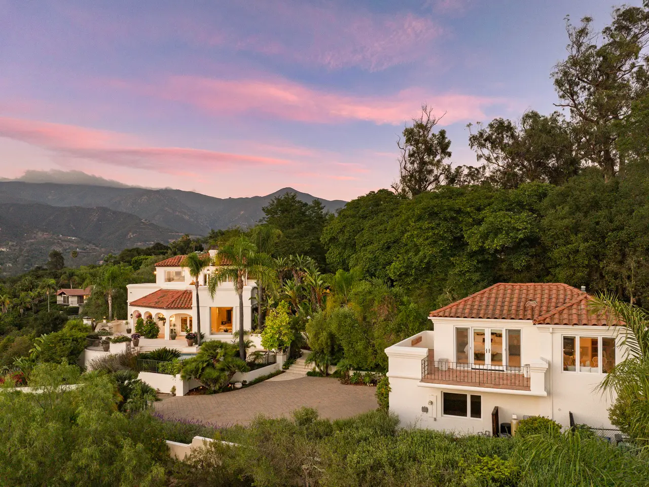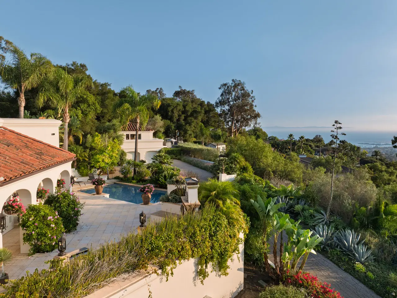Behind private gates on Calle Elegante, a world of serenity and beauty unfolds on 1.7 lush acres. The moment you step inside, walls of glass reveal sweeping views of the ocean, islands, harbor, and mountains--reminders that this is no ordinary home, but a sanctuary elevated by nature itself. The story begins in the heart of the house, where soaring ceilings, stone floors, and a fireplace anchor the formal living room. Light pours in, filling the space with warmth, while the dining and family rooms blend seamlessly with the kitchen, creating an open, effortless flow for gatherings both large and small. Upstairs, the primary suite continues the story of retreat and renewal. With its own sitting room, private fireplace, and adjoining office, it's a place to wake slowly to the sunrise or wind down as the evening light paints the horizon. Two additional en-suite bedrooms carry the story further: one with doors that open directly to a secret garden hideaway, and the other framing the drama of the mountains. Step outside, and the home transforms into a private resort carved into the hillside. Inspired by the love of the Bacara Resort, the current owner designed the pool terrace to rival the luxury of a five-star retreat without ever leaving home. A sparkling pool shimmers in the sunlight, anchored by a covered patio with outdoor fireplace, a fully equipped outdoor kitchen, and multiple lounge areas. Here, mornings begin with quiet coffee overlooking the coastline, and evenings end with golden sunsets shared among friends. For visitors, a private guest suite above the garage offers decks, views, and independence a retreat within a retreat. Surrounding it all are lovely gardens, a koi pond, and mature trees that have grown into characters of their own, wrapping the home in shade, color, and year-round beauty.This is a home designed not just to live in, but to live well. Located in the sought-after Cold Spring School District, it blends elegance with comfort, privacy with welcome, and luxury with nature an everyday escape on Calle Elegante.