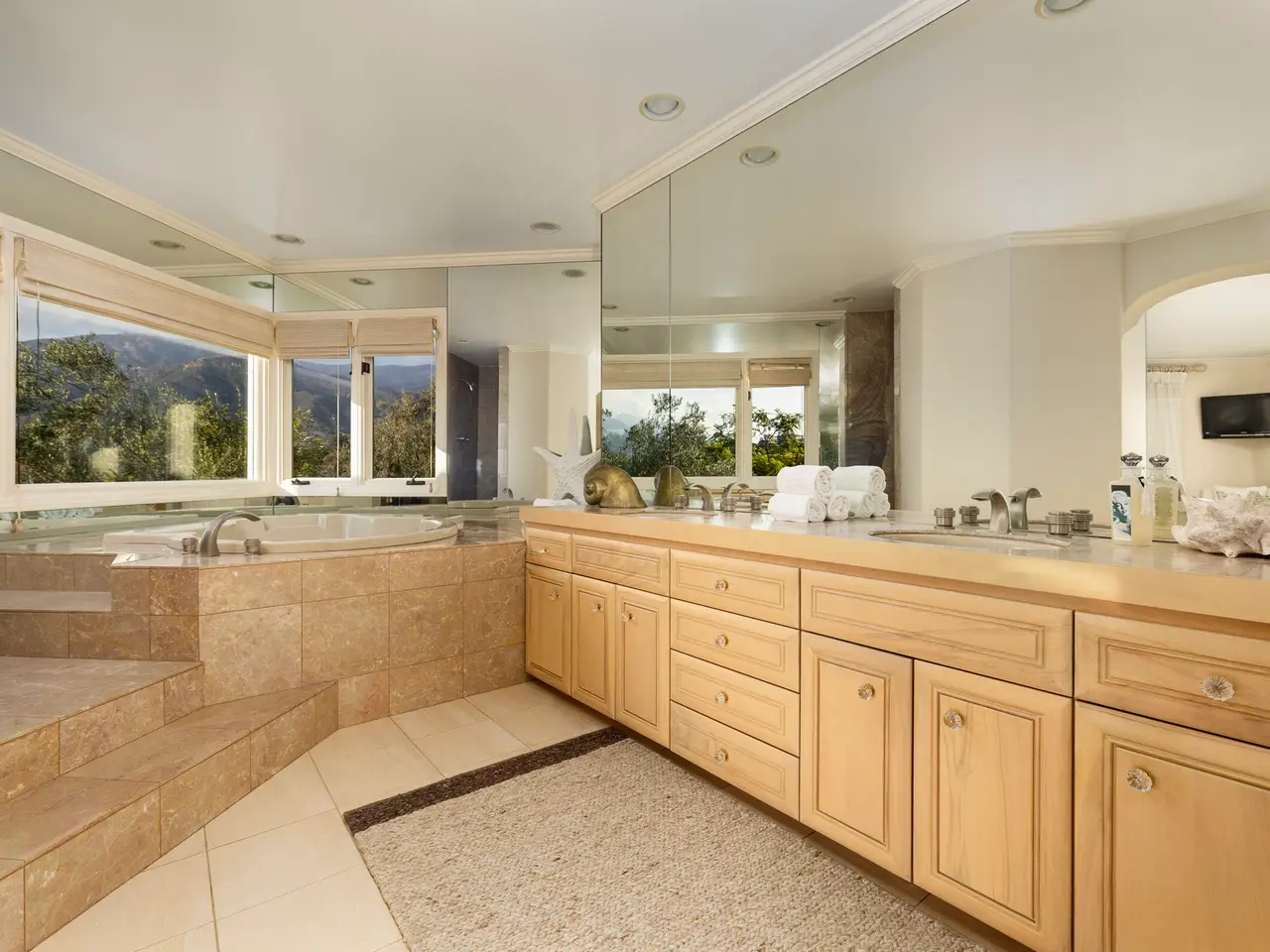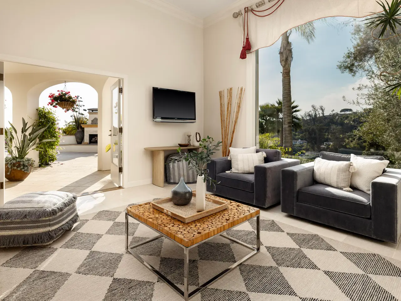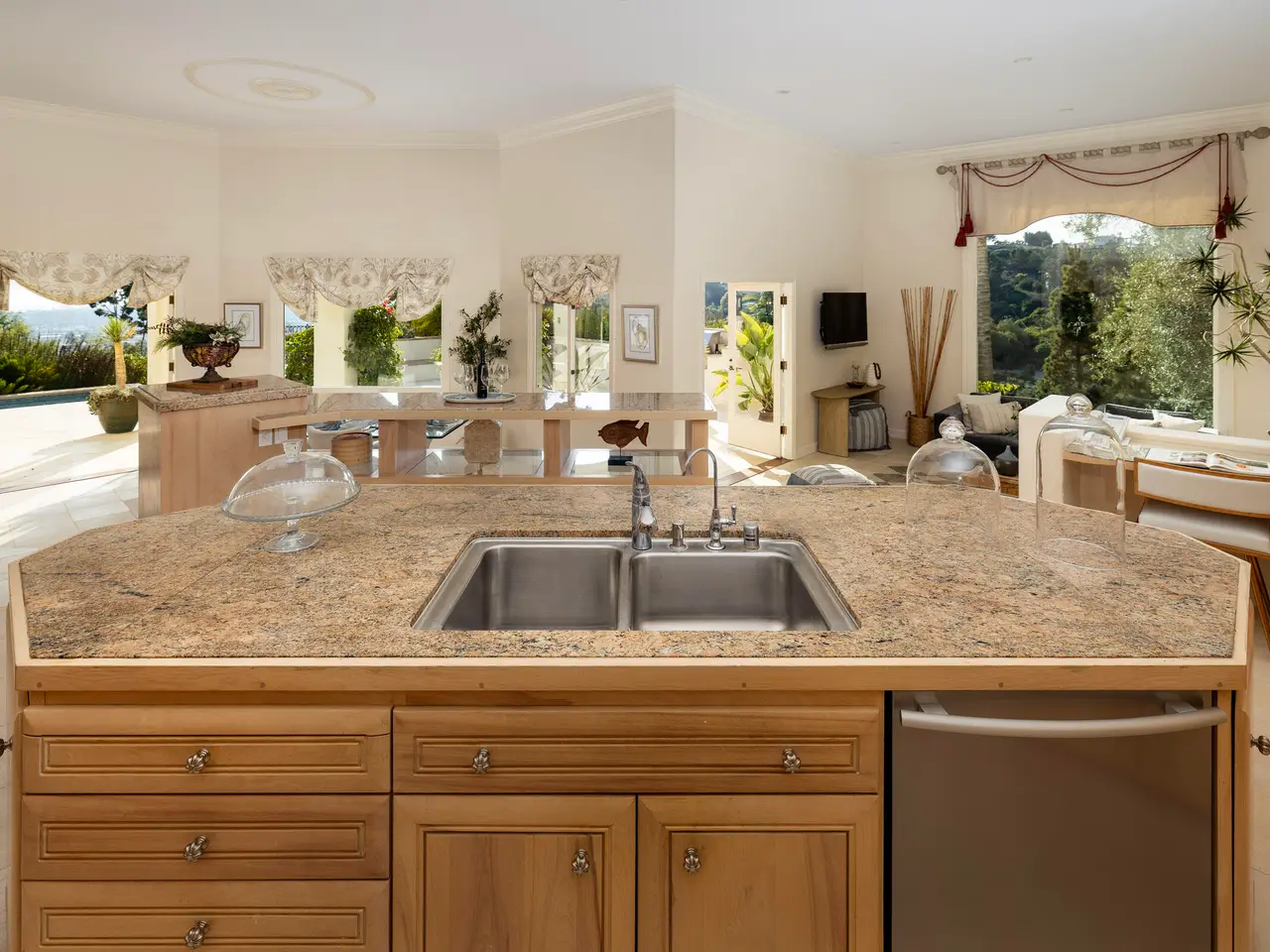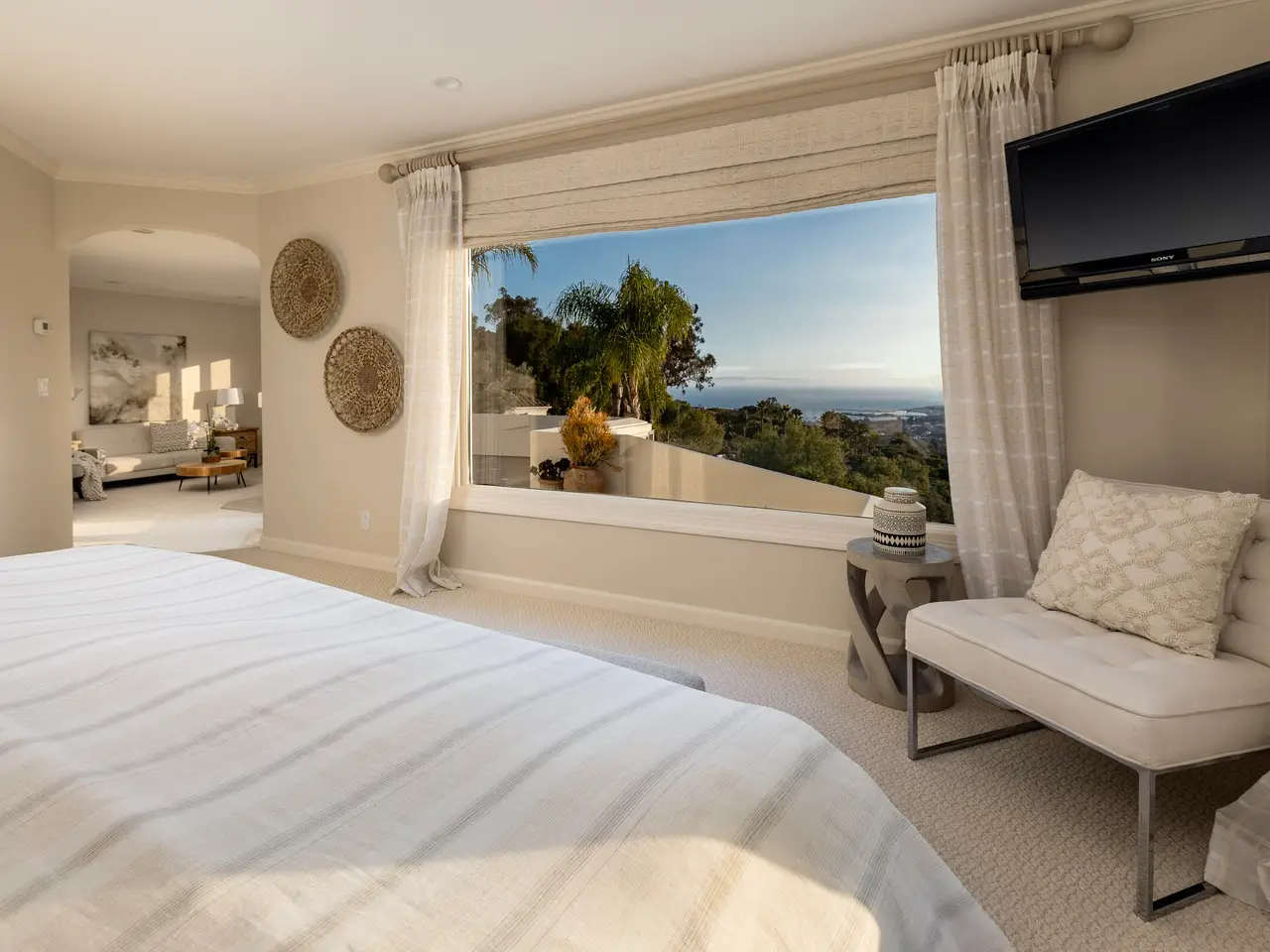 Behind private gates on Calle Elegante, a world of serenity and beauty unfolds on 1.7 lush acres. The moment you step inside, walls of glass reveal sweeping views of the ocean, islands, harbor, and mountains--reminders that this is no ordinary home, but a sanctuary elevated by nature itself. The story begins in the heart of the house, where soaring ceilings, stone floors, and a fireplace anchor the formal living room. Light pours in, filling the space with warmth, while the dining and family rooms blend seamlessly with the kitchen, creating an open, effortless flow for gatherings both large and small. Upstairs, the primary suite continues the story of retreat and renewal. With its own sitting room, private fireplace, and adjoining office, it's a place to wake slowly to the sunrise or wind down as the evening light paints the horizon. Two additional en-suite bedrooms carry the story further: one with doors that open directly to a secret garden hideaway, and the other framing the drama of the mountains. Step outside, and the home transforms into a private resort carved into the hillside. Inspired by the love of the Bacara Resort, the current owner designed the pool terrace to rival the luxury of a five-star retreat without ever leaving home. A sparkling pool shimmers in the sunlight, anchored by a covered patio with outdoor fireplace, a fully equipped outdoor kitchen, and multiple lounge areas. Here, mornings begin with quiet coffee overlooking the coastline, and evenings end with golden sunsets shared among friends. For visitors, a private guest suite above the garage offers decks, views, and independence a retreat within a retreat. Surrounding it all are lovely gardens, a koi pond, and mature trees that have grown into characters of their own, wrapping the home in shade, color, and year-round beauty.This is a home designed not just to live in, but to live well. Located in the sought-after Cold Spring School District, it blends elegance with comfort, privacy with welcome, and luxury with nature an everyday escape on Calle Elegante.