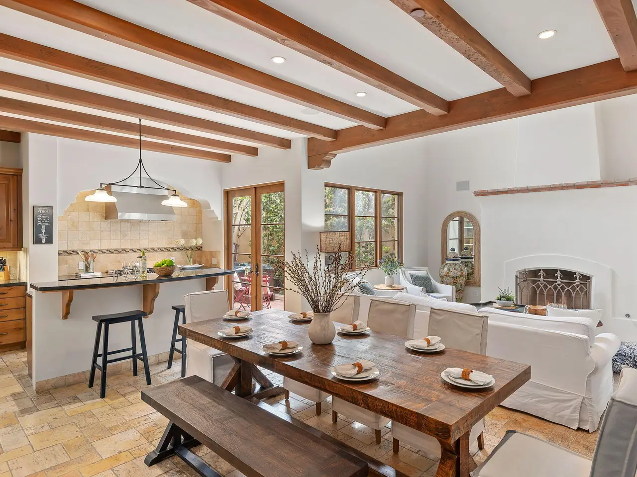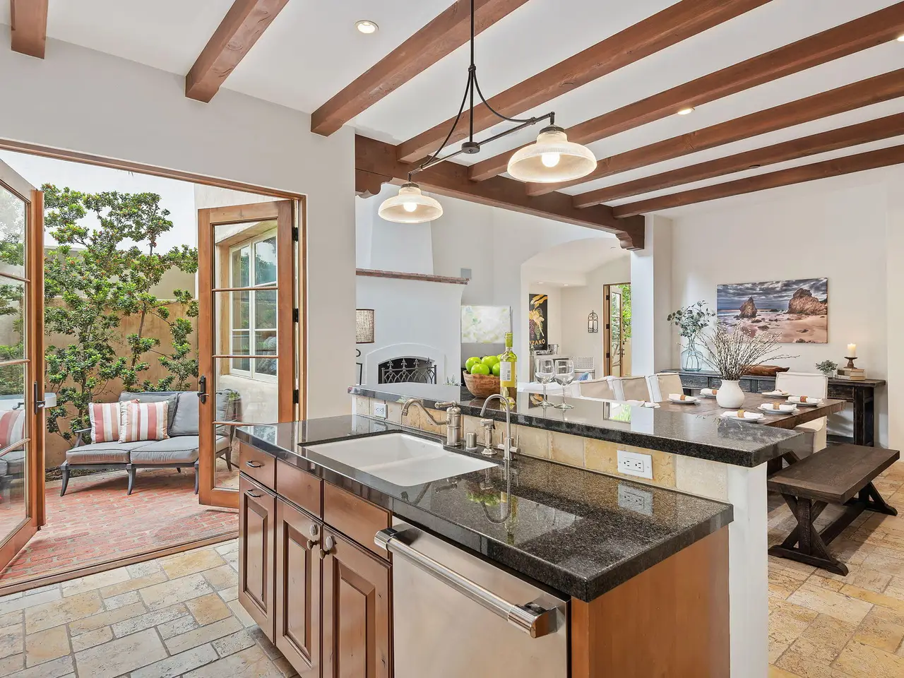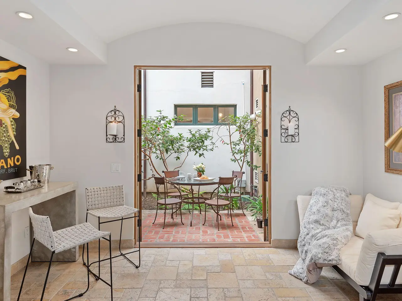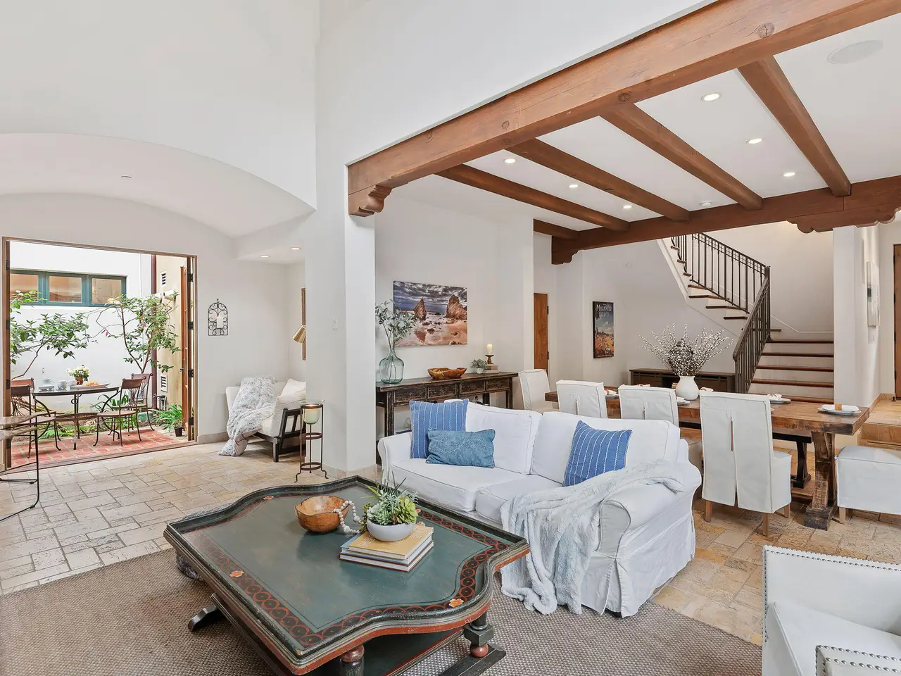 Luxury Living in Downtown Santa Barbara at Anacapa Villas, a gated enclave of 8 Tuscan-style homes just steps from State Street, the waterfront, and Funk Zone. Designed by renowned architect Barry Berkus and built in 2006, this approx. 2,900 sq. ft. home features 3 beds, 3.5 baths, a loft den, and an attached 2-car garage. Enjoy two private brick patios (one with a spa), natural stone floors, vaulted ceilings, solid wood doors, and custom iron fixtures. The gourmet kitchen boasts granite counters, stainless appliances, and a Thermador 6-burner range. The spacious primary suite offers a spa-like bath, walk-in closet, and balcony. A second-floor guest bedroom offers a private bathroom and walk-in closet. The oversized top floor ensuite bedroom enjoys wonderful mountain and Riviera views.