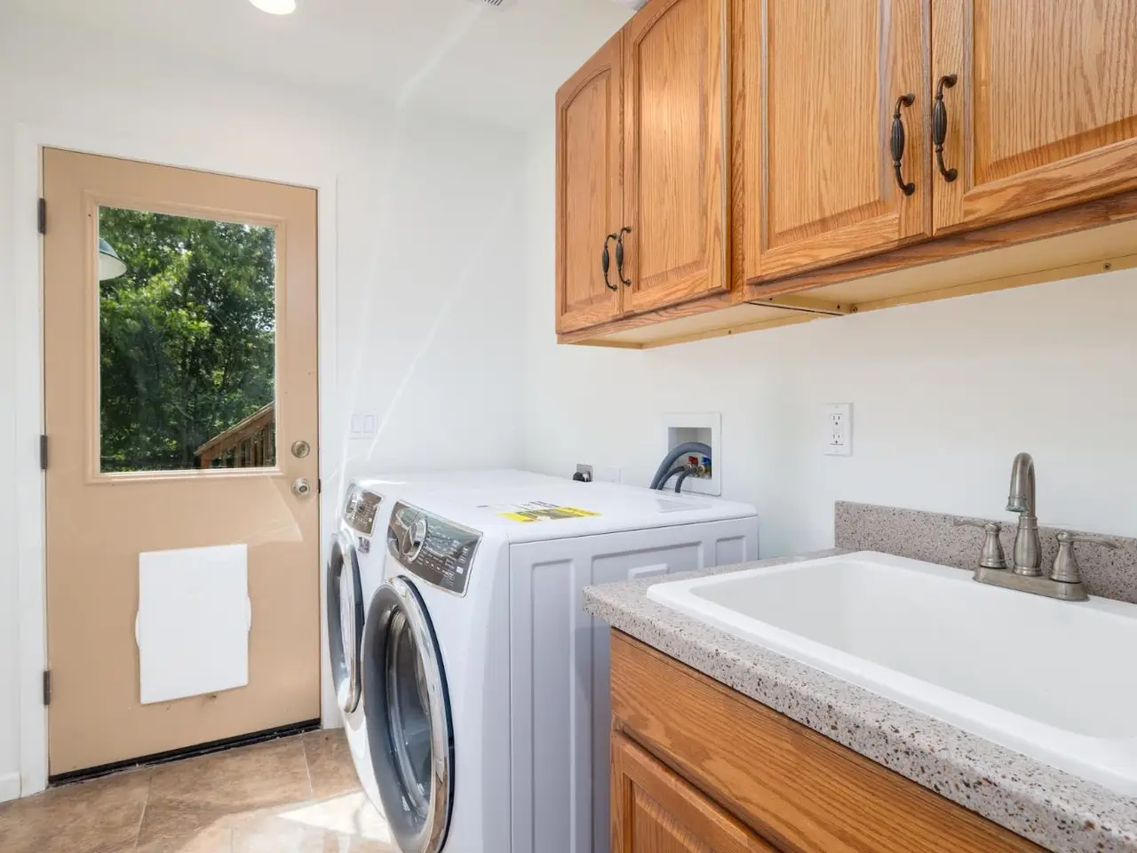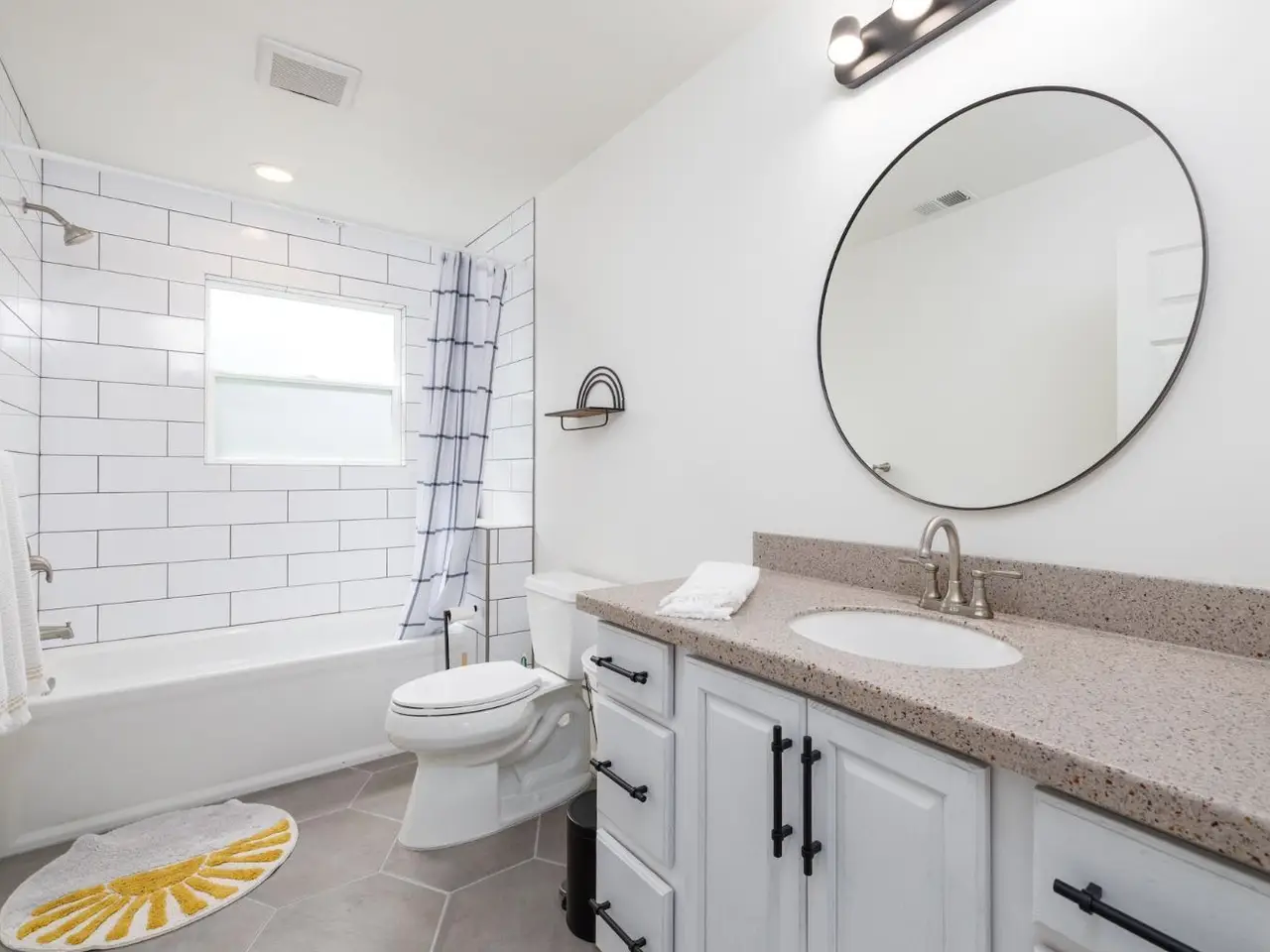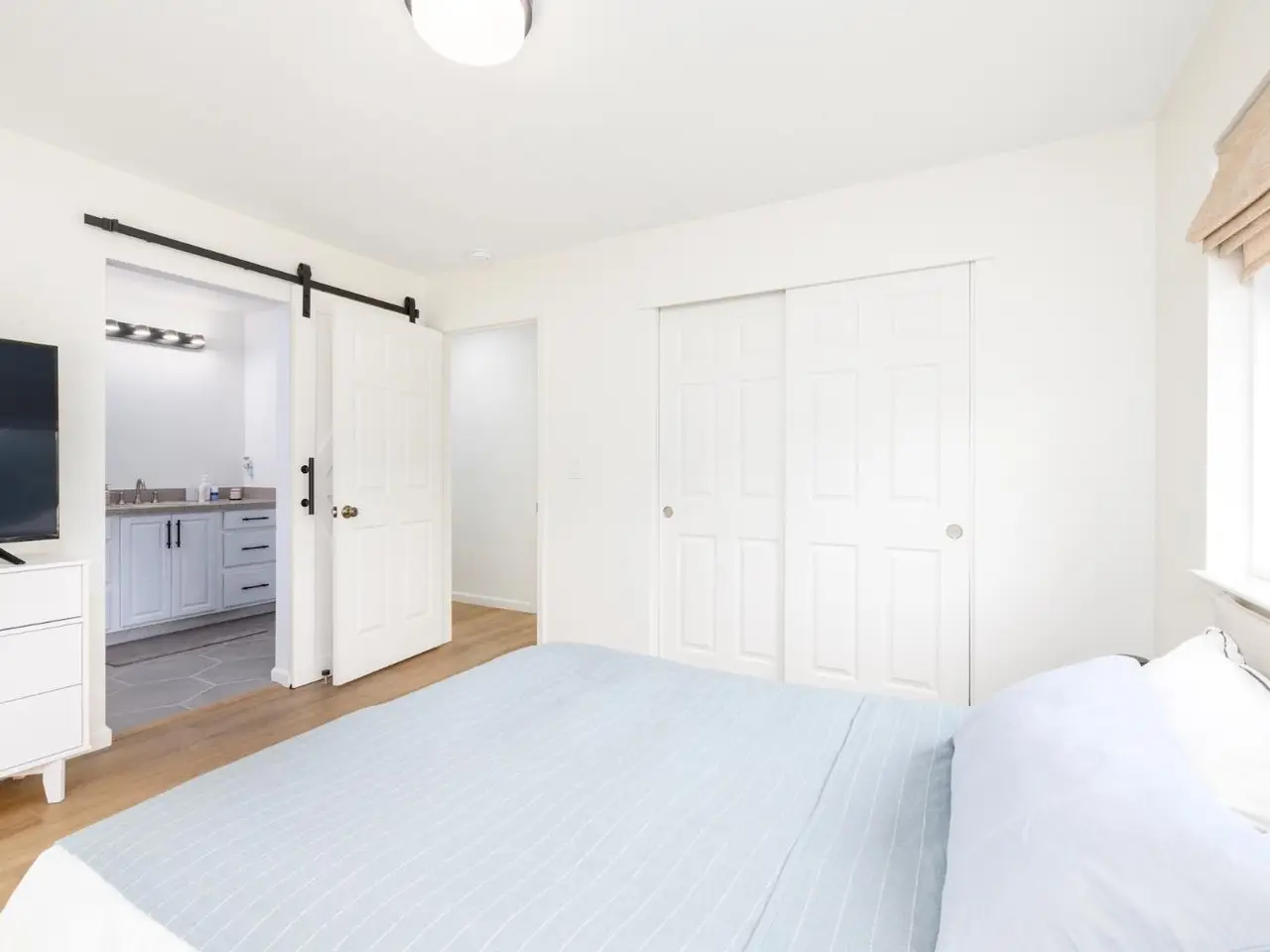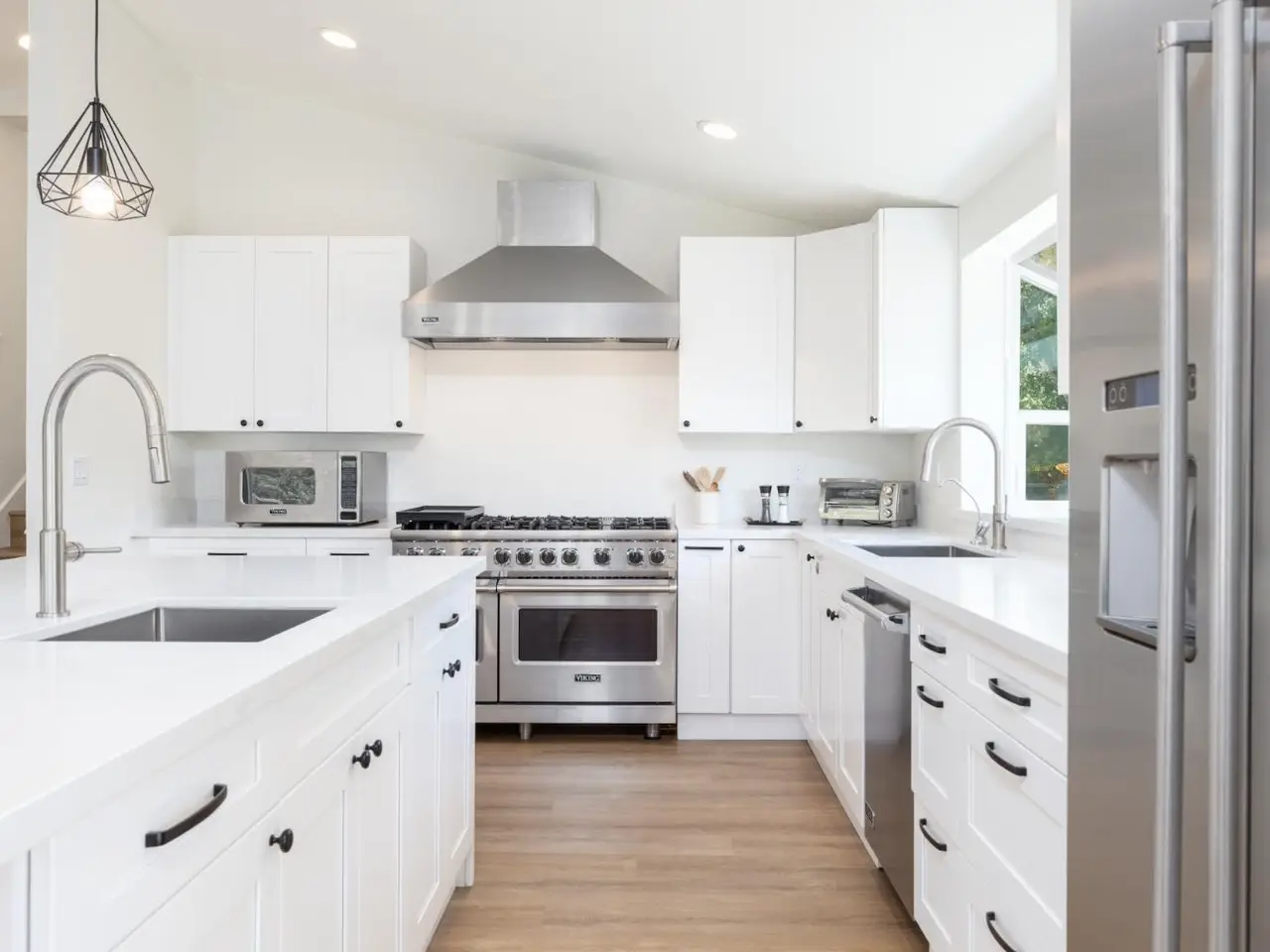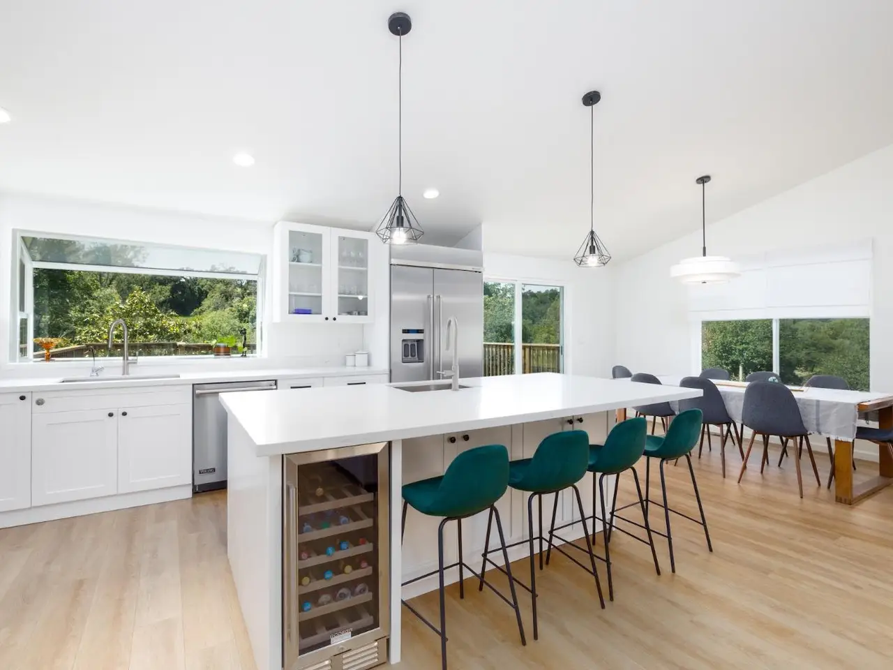 - Redesigned kitchen with new cabinets, countertops, island, and wine fridge
