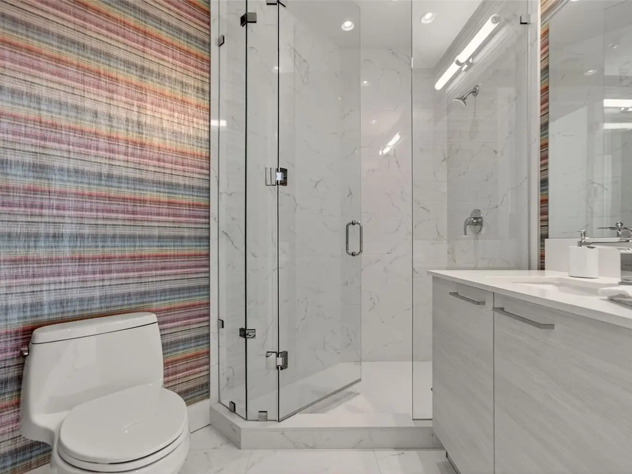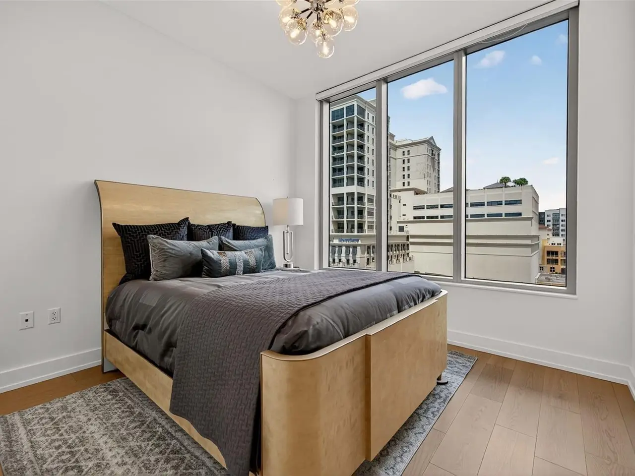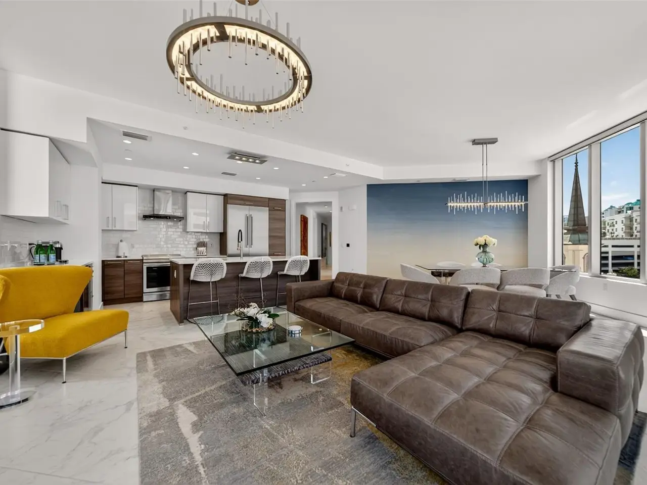 Design perfection at The Mark in this exquisitely designed and impeccably maintained three-bedroom residence with dramatic art gallery entrance. From the moment you step inside, walls of glass frame sweeping vistas of the sparkling city skyline and Sarasota Bay. The home features two private and spacious balconies inviting you to enjoy morning coffee or sunset cocktails. The open living, dining, and kitchen spaces are filled with natural light from full height sliding glass doors that open onto the terrace. Electronic window treatments add a refined touch, allowing you to balance privacy with soft daylight. The sophisticated den with custom shelving and its picturesque view creates the perfect home office or cozy reading nook. The primary suite is a peaceful sanctuary with its own private balcony, custom-designed closet, and spa-like bath featuring dual vanities, lighted mirrors, and a spacious frameless glass shower. Two additional en-suite bedrooms offer comfort and privacy for family and guests. Touches of sophisticated designer wall paper and custom lighting throughout the home. The chef’s kitchen is both stylish and functional, featuring Nolte Premium European cabinets, quartz countertops, Euro Dark/High Gloss soft-close doors, sliding shelves, subway tile backsplash, and Italian-honed porcelain floors. This home is like a brand-new residence with every detail perfectly executed. For convenience and peace of mind, the condo includes a temperature-controlled storage unit on the same floor as residence, two side-by-side gated parking spaces, and access to two electric vehicle charging stations. World class amenities include the 5th floor amenity deck sporting a 65-foot resort style heated saltwater pool and spa, lounge area, fire pit, outdoor grills, high tech fitness center, spin room and a club room with fire place, bar, billiards, catering kitchen and newsroom. The concierge service provides convenience and security. Experience the epitome of urban living in Sarasota. Indulge in the vibrant arts and culture scene, fine dining and upscale shopping, all within walking distance.