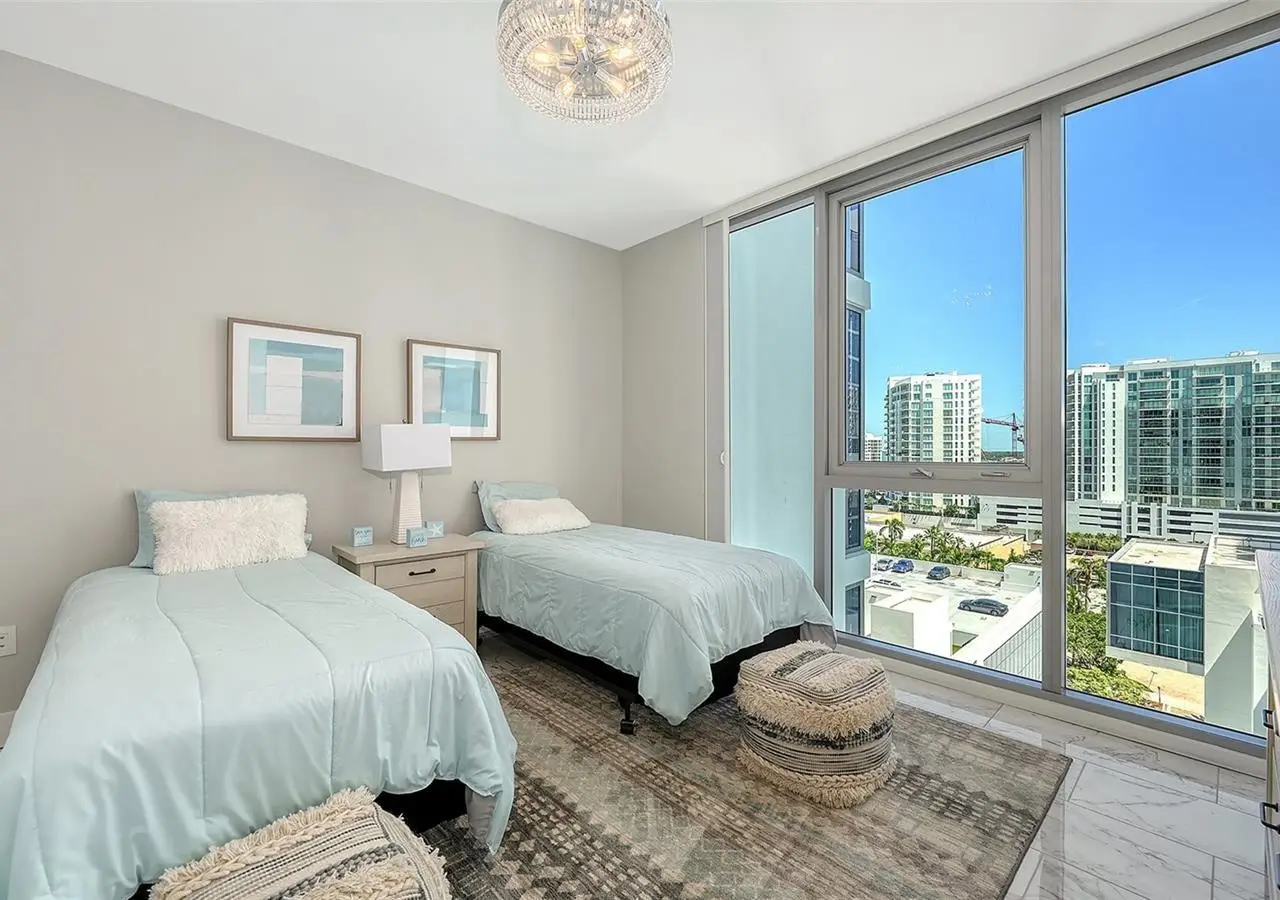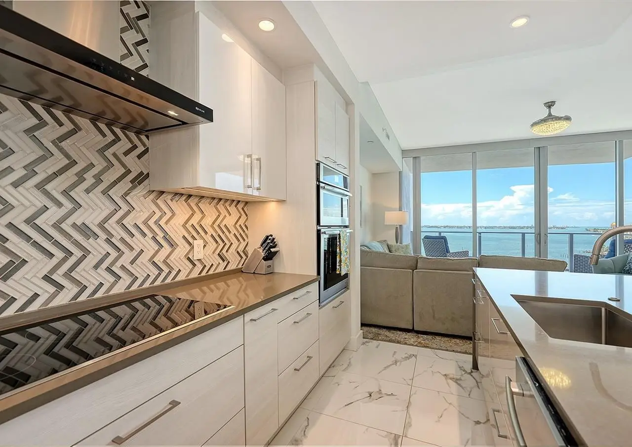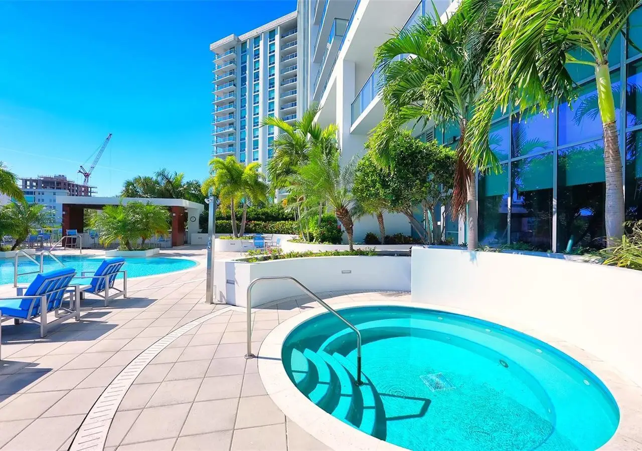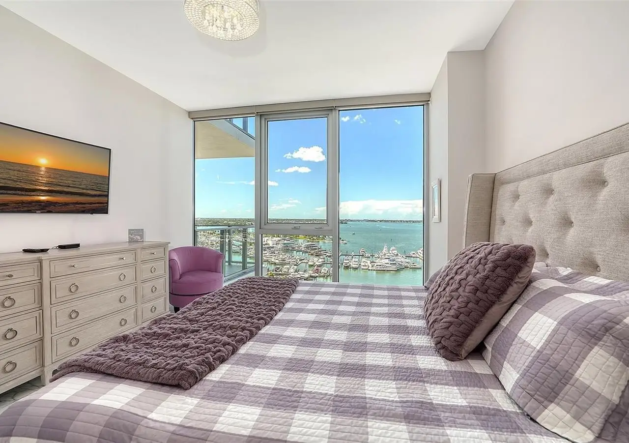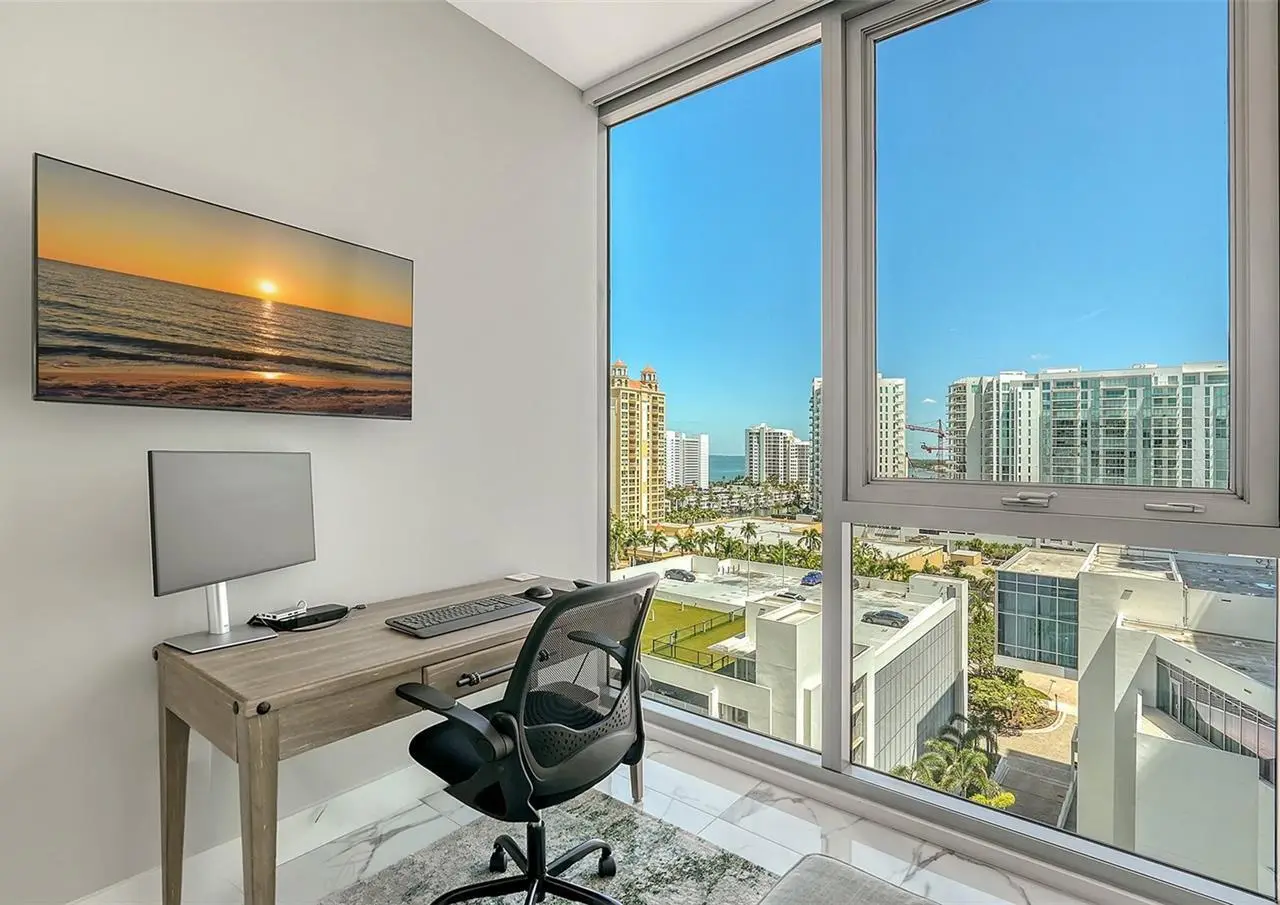 Elevated living at The Vue, one of Sarasota's premier downtown condominiums. This elegant 11th-floor residence offers breathtaking, unobstructed views of Sarasota Bay, the marina, and through Big Pass to the Gulf of Mexico. The coveted 06 stack is a floor plan featuring a dedicated office/den and a fully private, south-facing balcony that is shaded all day and ideal for enjoying vivid sunsets and bay breezes. Ten-foot floor-to-ceiling windows in the living room and primary bedroom bring in abundant light and stunning water views. The sleek, open layout is complemented by high-end finishes and a gourmet kitchen with premium appliances, designer cabinetry, and a spacious island for entertaining. The Vue offers resort-style amenities including 24/7 concierge, heated pool and spa, rooftop dog park, fitness center, club lounge, board room, and elegant spaces to host guests. Residents also enjoy a complimentary city shuttle to Lido Beach and downtown's Main Street. Ideally located in the heart of Sarasota, you're just steps from fine dining, art galleries, live music, the performing arts, and waterfront parks. Sophisticated design, luxury amenities, and unmatched views. This is downtown living at its finest.