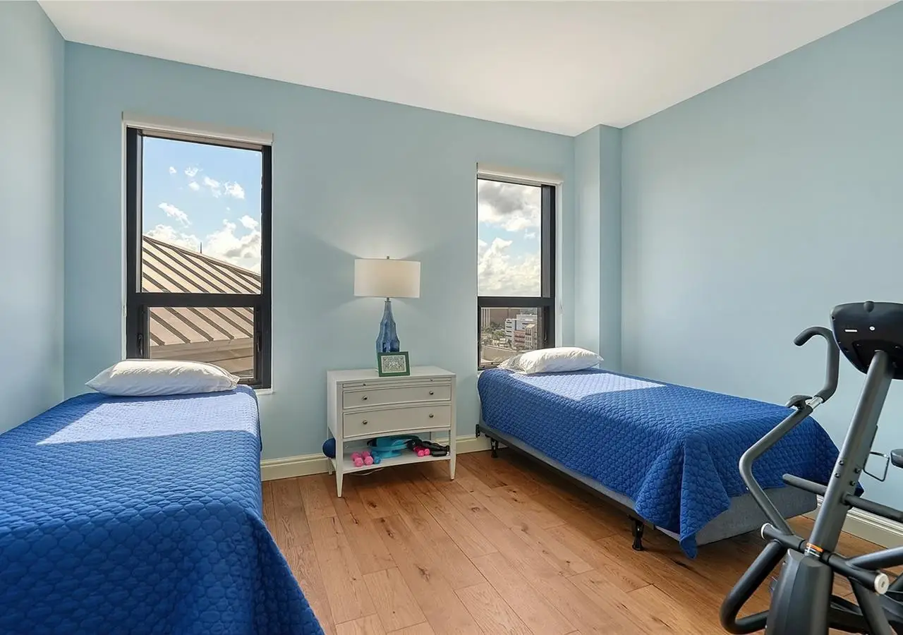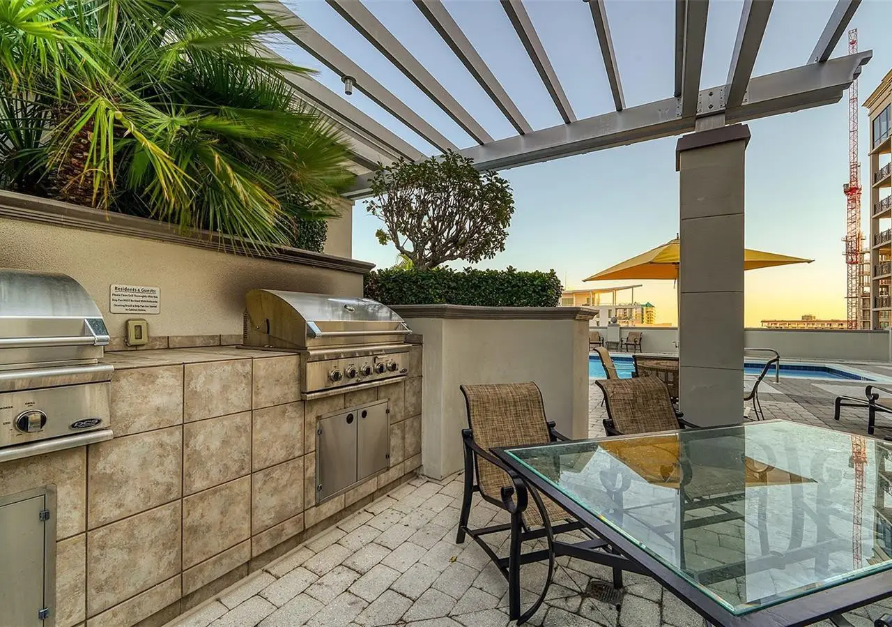 Lavish boutique living in the heart of Downtown Sarasota awaits at the Plaza at Five Points. This tastefully updated, turnkey 2-bedroom, 2-bath condo residence, offers city living with refined style and comfort. A spacious entry foyer with a dedicated office nook provides a practical and welcoming first impression ideal for year-round living or an stress-free seasonal retreat. The kitchen features sleek quartz countertops and newer, high-quality appliances. The primary en-suite bedroom showcases beautiful city views, a California-style walk-in closet, and access to the private lanai. The guest bedroom is generously sized and offers equally charming downtown vistas. The lanai is accessible from both the living room and the primary bedroom, providing a seamless indoor-outdoor flow. Additional features include two deeded garage parking spaces conveniently located near the lobby, and a private storage room. Building security includes controlled access at all entry points and elevators, ensuring peace of mind. Enjoy an elevated lifestyle with luxurious amenities including front desk concierge service, front desk steward, valet parking, rooftop heated pool and spa, outdoor grilling area, cabana with gazebo, a well-equipped fitness center, community room with catering kitchen and fireplace, conference room, and a guest suite available for weekly reservations. Step out of your lobby into Sarasota's vibrant arts and entertainment district. Just a short stroll to the Sarasota Opera House, theaters, live music venues, art galleries, eclectic shopping, and top-rated dining. Whole Foods is around the corner for added convenience. The Bayfront and Marina Jack are just minutes away, offering a variety of boating and waterfront activities. Easy access St. Armands Circle, Lido Beach, Longboat Key, and world-renowned Siesta Key Beach. The Sarasota-Bradenton International Airport, Selby Botanical Gardens, Van Wezel Performing Arts Center, and the Asolo Repertory Theatre are all within a short drive. The building performs like a champ during hurricanes and storms. Residences with this floor plan in 'The Plaza at Five Points' are rarely available schedule your private or virtual showing today. Vacant and easy to show.