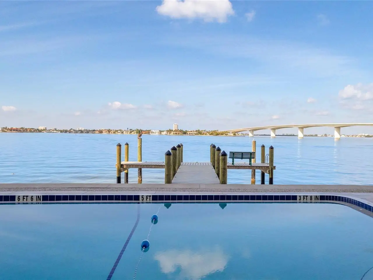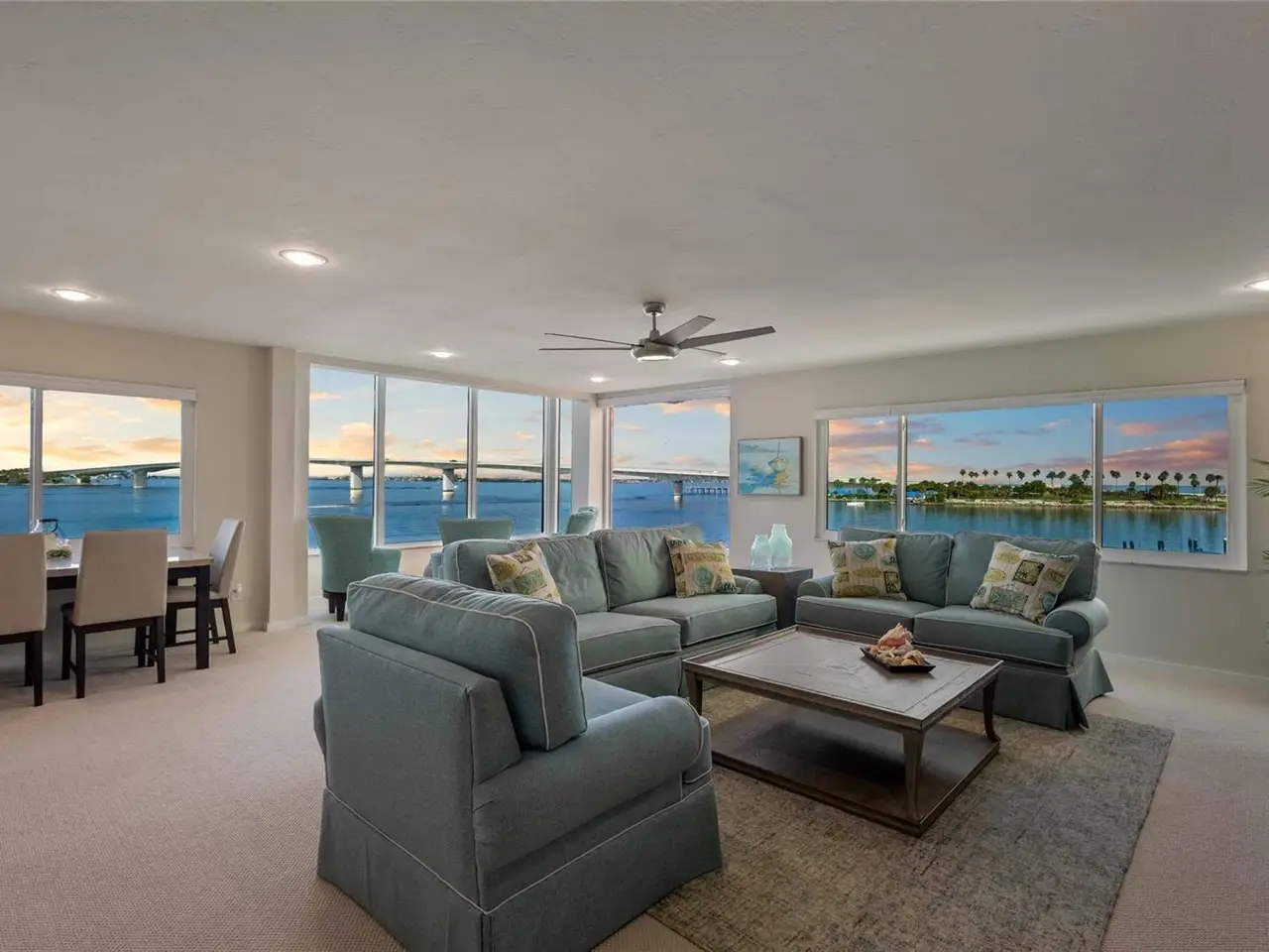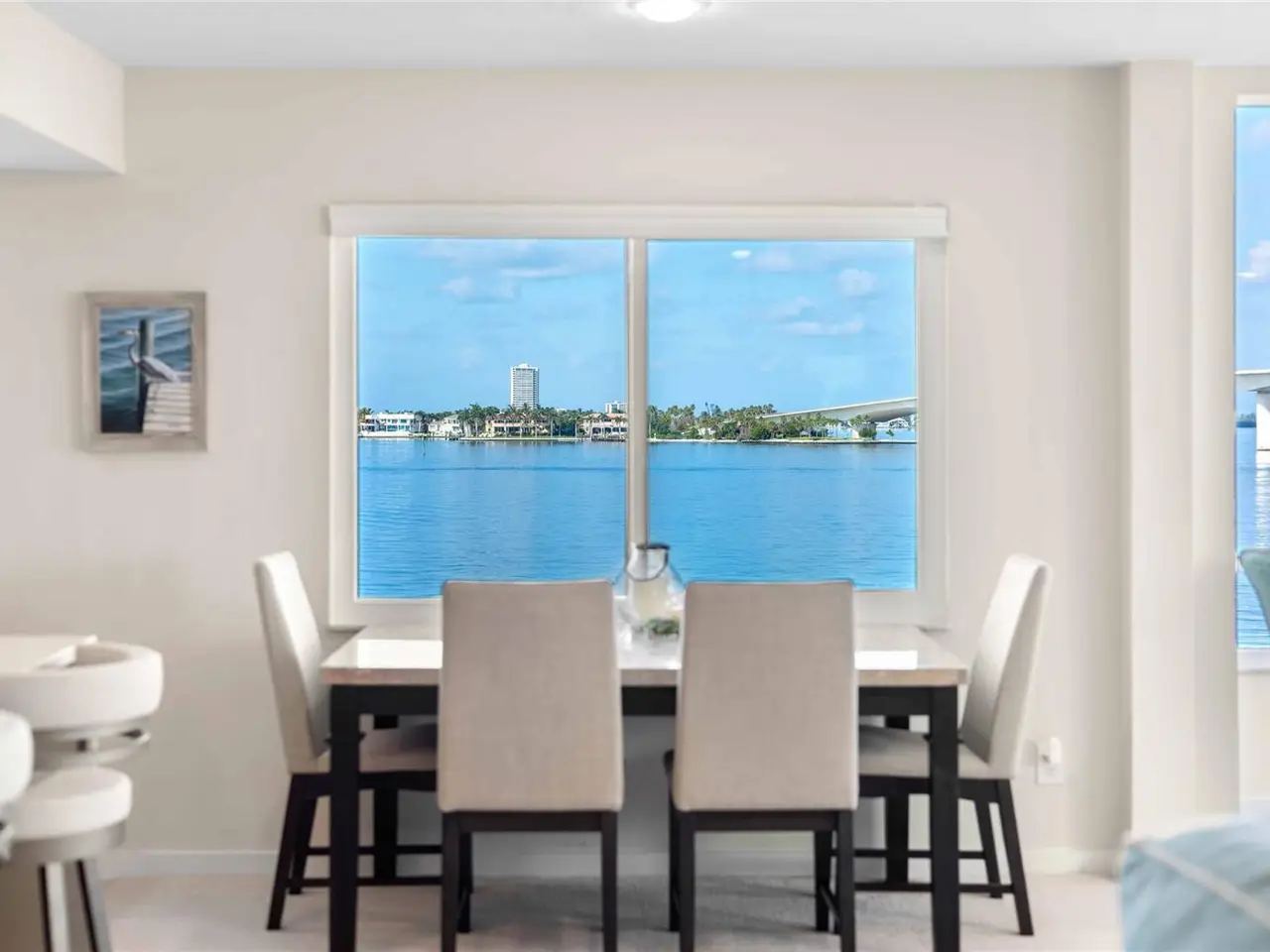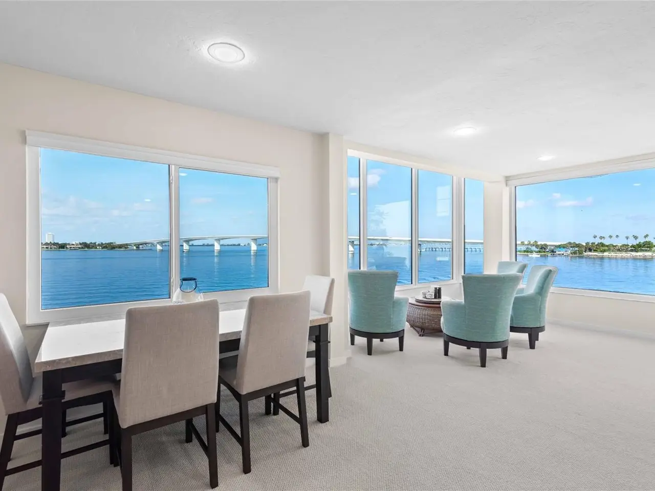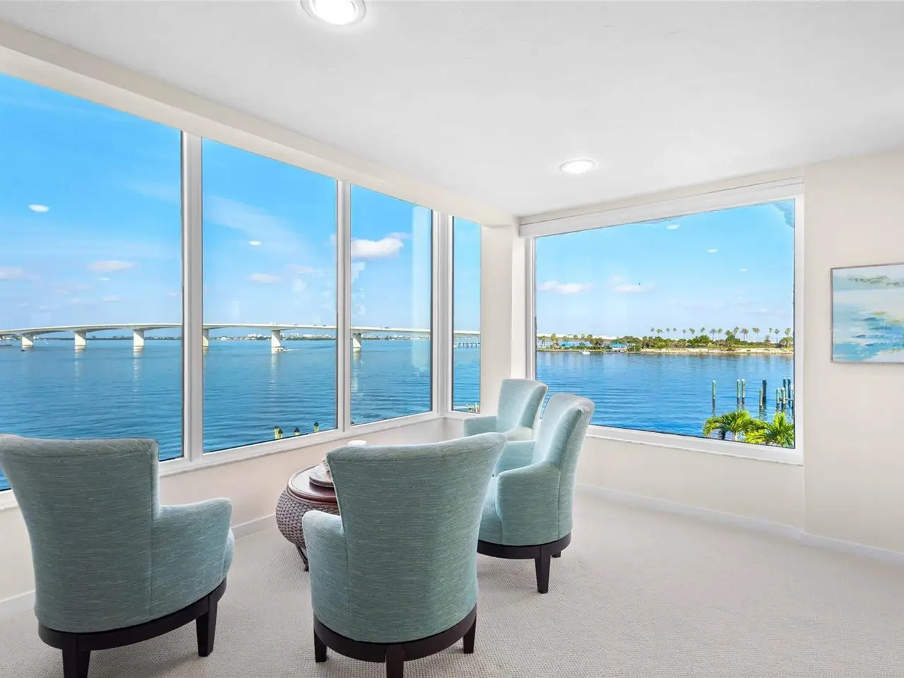 Coastal living at its finest, the panoramic and breathtaking views from this Golden Gate Point residence offer an unparalleled yet attainable opportunity to live the sought-after waterfront lifestyle. This elegantly renovated corner unit boasts walls of impact-rated PGT windows (2024) that perfectly frame sweeping views of Sarasota Bay, Bird Key, and the iconic John Ringling Bridge, offering a front-row seat to jaw-dropping sunsets and endless natural beauty. The open-concept kitchen has been thoughtfully redesigned with a quartz waterfall island, soft-close cabinetry, built-in desk, and a seamless flow into the living and dining areas - ideal for both entertaining and everyday living. The spacious great room enjoys phenomenal north and west-facing vistas, with the unit uniquely set in front of the neighboring building to maximize natural light and privacy. Throughout the residence, you'll find custom interior doors, a neutral color palette, thoughtfully renovated bathrooms, and elevated finishes that reflect refined taste. Both bedrooms feature serene bay vistas, and the expansive 18' x 12' primary suite allows space for a sitting area or workspace plus separate reach-in and walk-in closets in the vestibule leading to the primary bathroom. Storage is abundant, with a large entry closet, full-size hallway closet, a generous 8' x 7' laundry/utility room, and a 6' x 5' private storage room conveniently located just outside the front door. Residents of this boutique community enjoy exceptional amenities, including a heated bayfront pool (34' x 17'), day dock, outdoor shower, and renovated poolside bath. Assigned covered parking and ample guest parking provide convenience. Set on the prestigious Golden Gate Point peninsula with its tree-lined and brick-pavered street, this residence is minutes from downtown Sarasota's dining, arts, and cultural attractions, as well as the shops and restaurants of St. Armands Circle and the world-famous beaches of Lido Key. This is a rare opportunity to live the waterfront lifestyle in one of Sarasota's most exclusive neighborhoods.