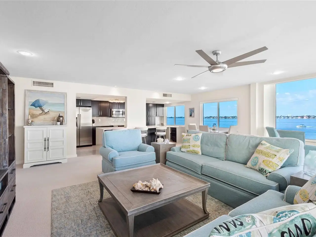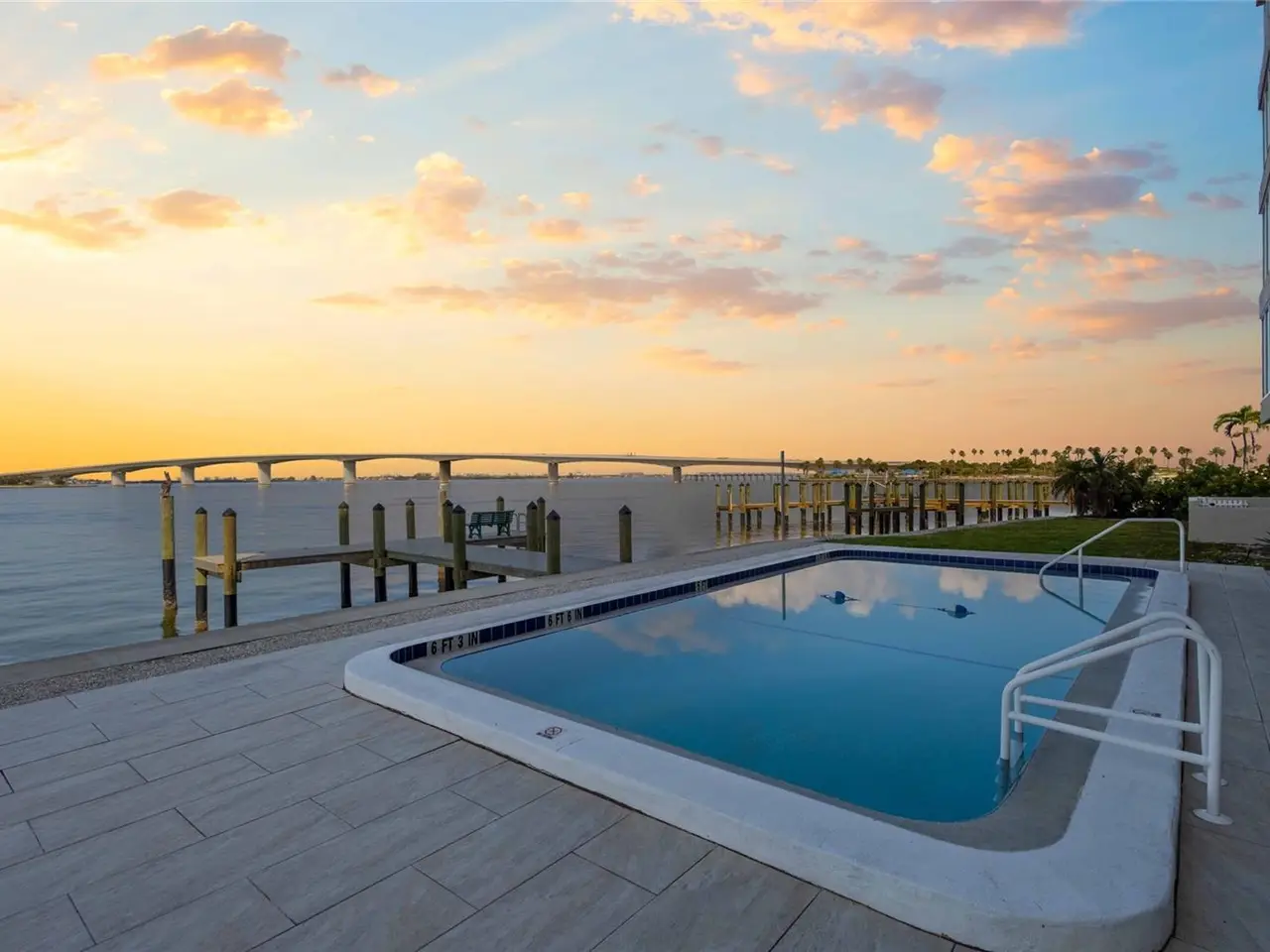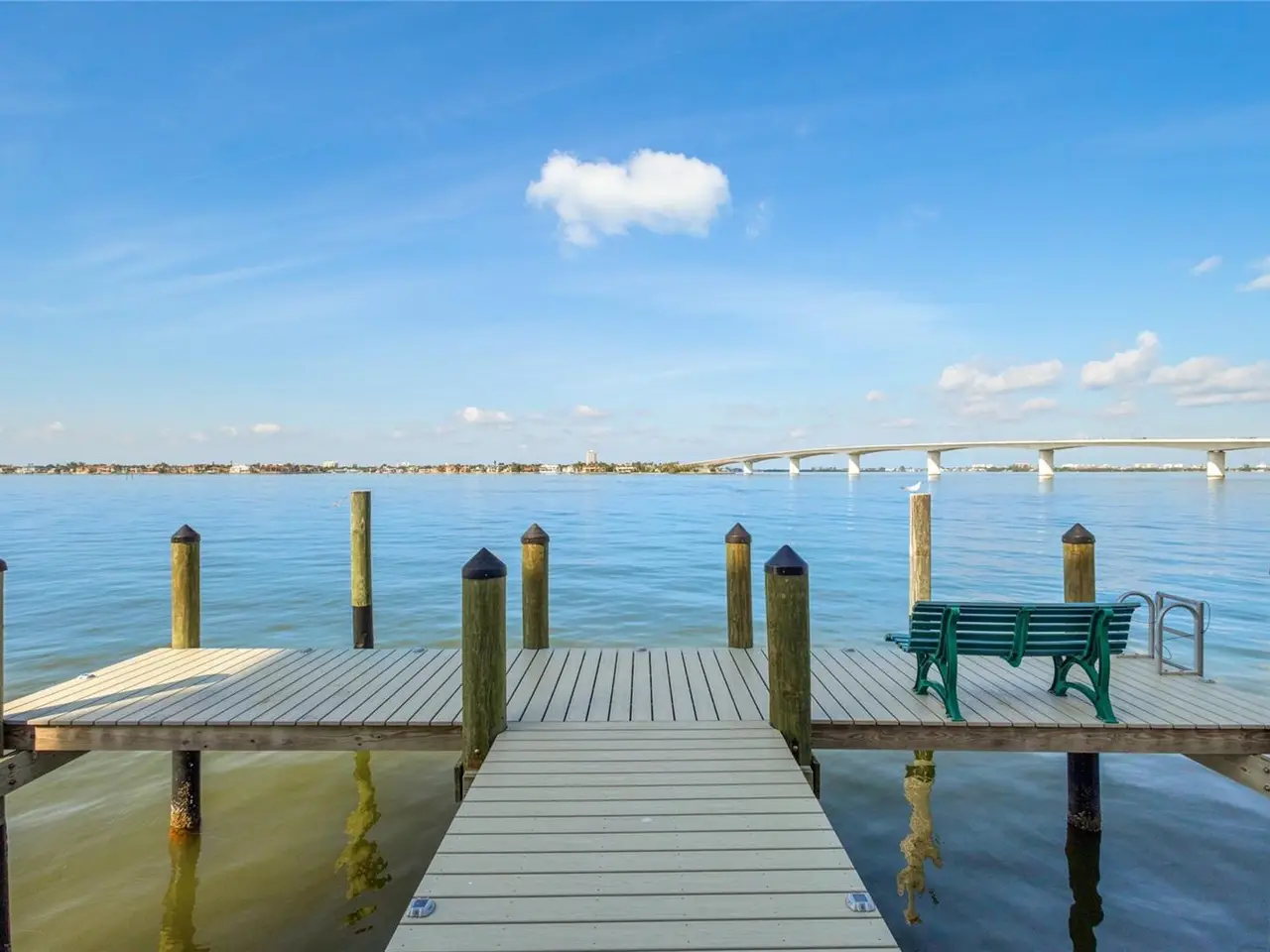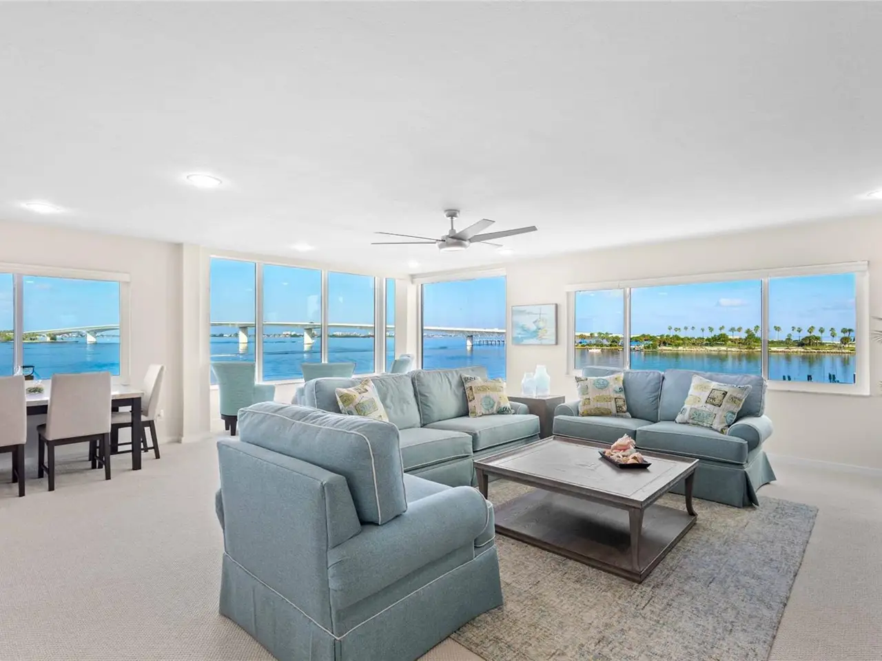 Coastal living at its finest, the panoramic and breathtaking views from this Golden Gate Point residence offer an unparalleled yet attainable opportunity to live the sought-after waterfront lifestyle. This elegantly renovated corner unit boasts walls of impact-rated PGT windows (2024) that perfectly frame sweeping views of Sarasota Bay, Bird Key, and the iconic John Ringling Bridge, offering a front-row seat to jaw-dropping sunsets and endless natural beauty. The open-concept kitchen has been thoughtfully redesigned with a quartz waterfall island, soft-close cabinetry, built-in desk, and a seamless flow into the living and dining areas - ideal for both entertaining and everyday living. The spacious great room enjoys phenomenal north and west-facing vistas, with the unit uniquely set in front of the neighboring building to maximize natural light and privacy. Throughout the residence, you'll find custom interior doors, a neutral color palette, thoughtfully renovated bathrooms, and elevated finishes that reflect refined taste. Both bedrooms feature serene bay vistas, and the expansive 18' x 12' primary suite allows space for a sitting area or workspace plus separate reach-in and walk-in closets in the vestibule leading to the primary bathroom. Storage is abundant, with a large entry closet, full-size hallway closet, a generous 8' x 7' laundry/utility room, and a 6' x 5' private storage room conveniently located just outside the front door. Residents of this boutique community enjoy exceptional amenities, including a heated bayfront pool (34' x 17'), day dock, outdoor shower, and renovated poolside bath. Assigned covered parking and ample guest parking provide convenience. Set on the prestigious Golden Gate Point peninsula with its tree-lined and brick-pavered street, this residence is minutes from downtown Sarasota's dining, arts, and cultural attractions, as well as the shops and restaurants of St. Armands Circle and the world-famous beaches of Lido Key. This is a rare opportunity to live the waterfront lifestyle in one of Sarasota's most exclusive neighborhoods.