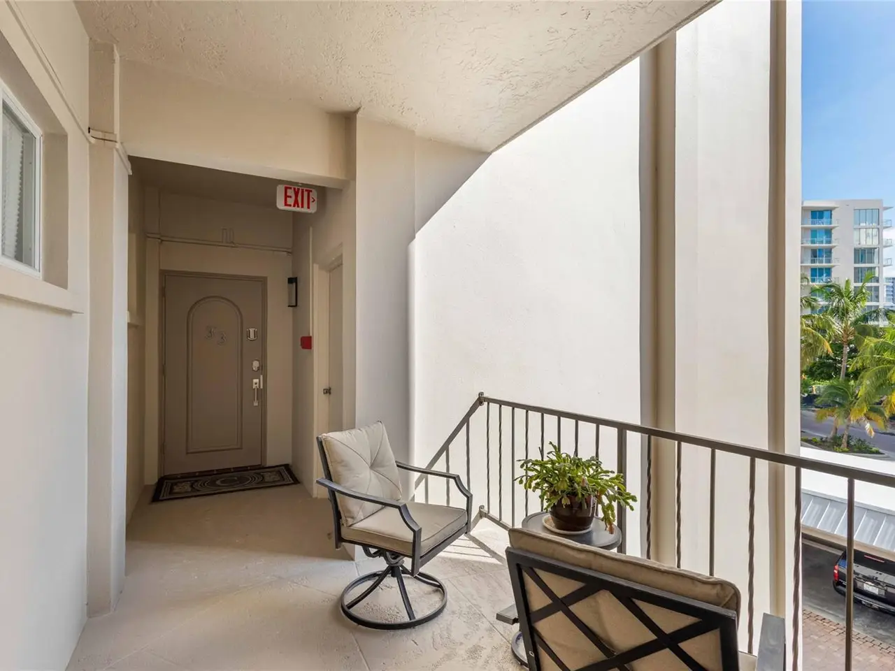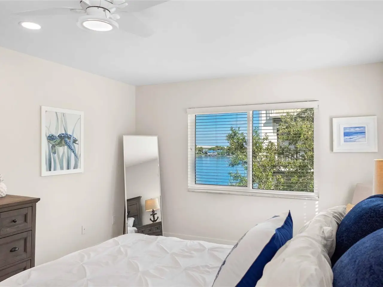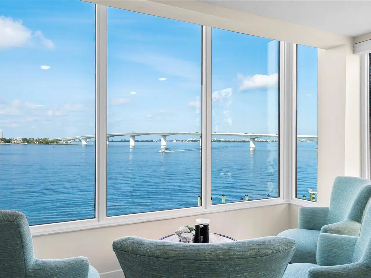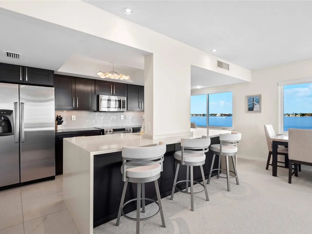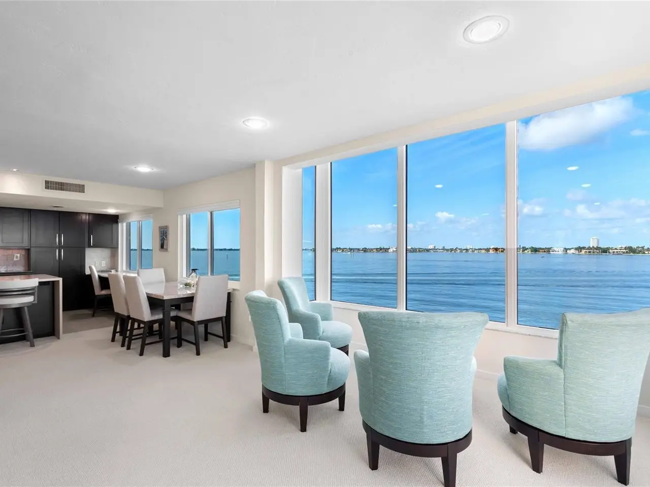 Coastal living at its finest, the panoramic and breathtaking views from this Golden Gate Point residence offer an unparalleled yet attainable opportunity to live the sought-after waterfront lifestyle. This elegantly renovated corner unit boasts walls of impact-rated PGT windows (2024) that perfectly frame sweeping views of Sarasota Bay, Bird Key, and the iconic John Ringling Bridge, offering a front-row seat to jaw-dropping sunsets and endless natural beauty. The open-concept kitchen has been thoughtfully redesigned with a quartz waterfall island, soft-close cabinetry, built-in desk, and a seamless flow into the living and dining areas - ideal for both entertaining and everyday living. The spacious great room enjoys phenomenal north and west-facing vistas, with the unit uniquely set in front of the neighboring building to maximize natural light and privacy. Throughout the residence, you'll find custom interior doors, a neutral color palette, thoughtfully renovated bathrooms, and elevated finishes that reflect refined taste. Both bedrooms feature serene bay vistas, and the expansive 18' x 12' primary suite allows space for a sitting area or workspace plus separate reach-in and walk-in closets in the vestibule leading to the primary bathroom. Storage is abundant, with a large entry closet, full-size hallway closet, a generous 8' x 7' laundry/utility room, and a 6' x 5' private storage room conveniently located just outside the front door. Residents of this boutique community enjoy exceptional amenities, including a heated bayfront pool (34' x 17'), day dock, outdoor shower, and renovated poolside bath. Assigned covered parking and ample guest parking provide convenience. Set on the prestigious Golden Gate Point peninsula with its tree-lined and brick-pavered street, this residence is minutes from downtown Sarasota's dining, arts, and cultural attractions, as well as the shops and restaurants of St. Armands Circle and the world-famous beaches of Lido Key. This is a rare opportunity to live the waterfront lifestyle in one of Sarasota's most exclusive neighborhoods.