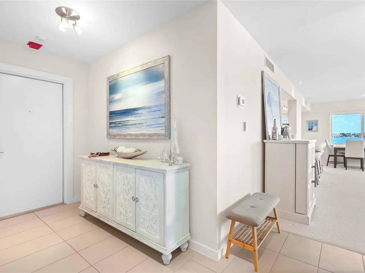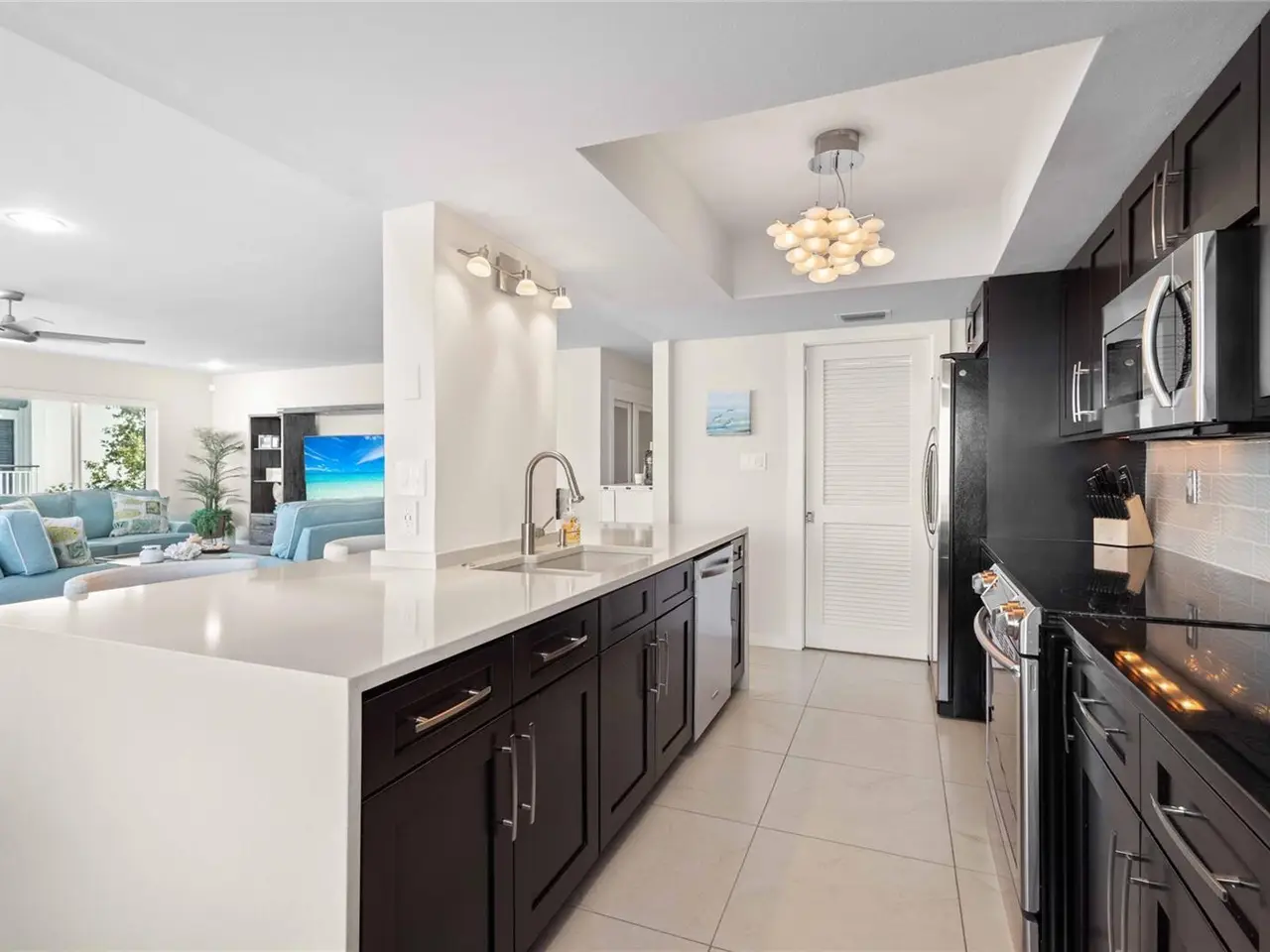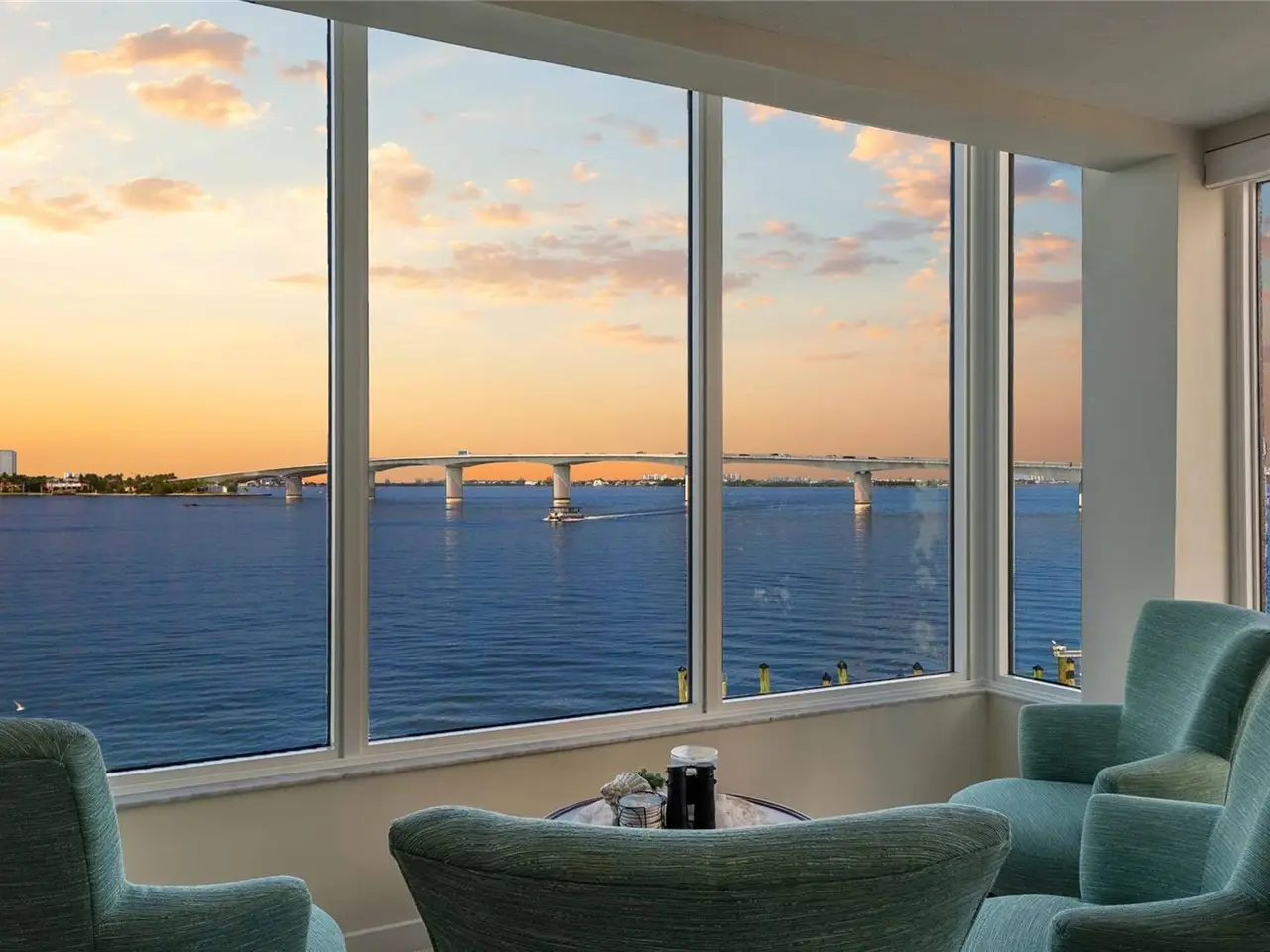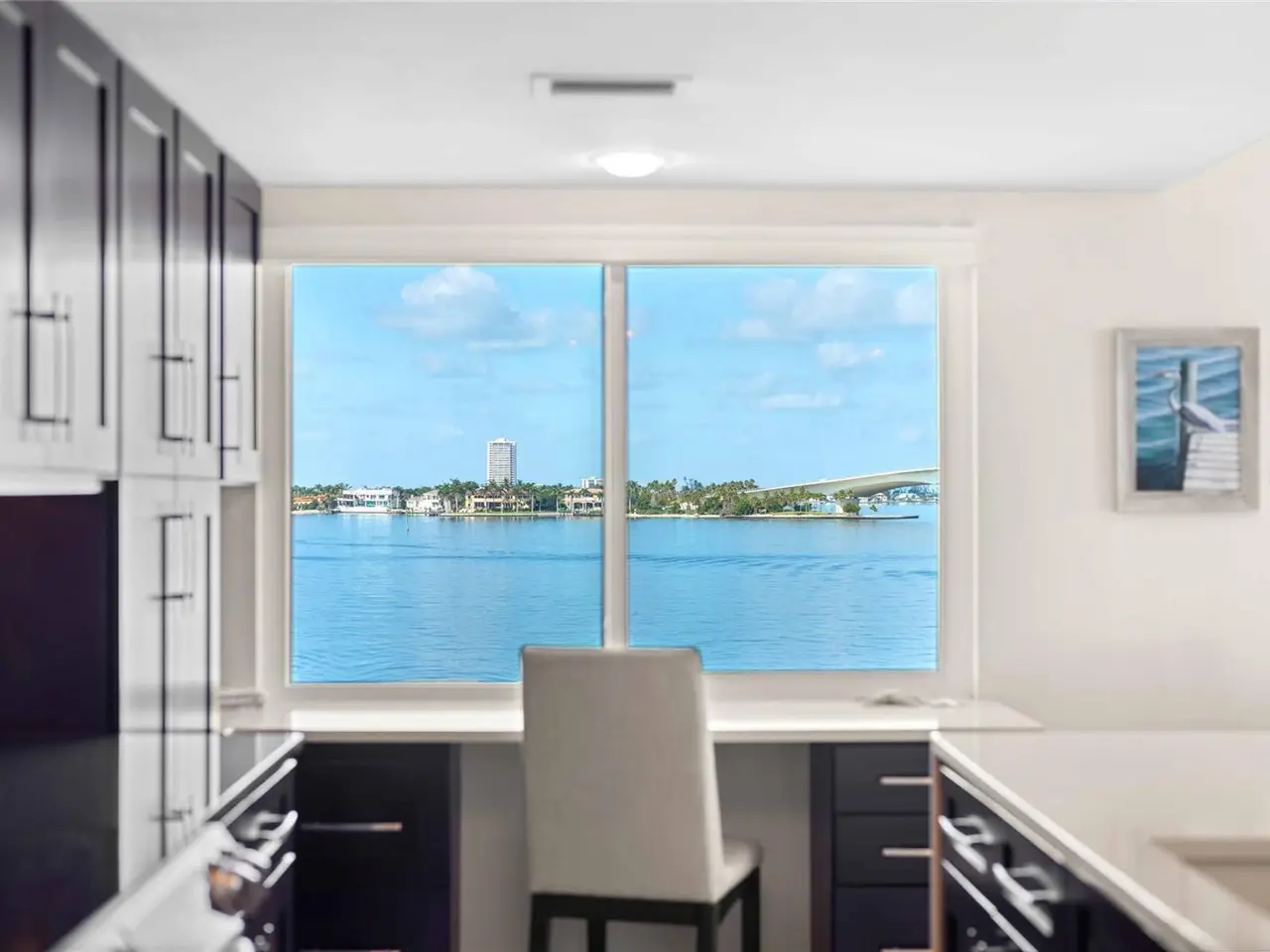 Coastal living at its finest, the panoramic and breathtaking views from this Golden Gate Point residence offer an unparalleled yet attainable opportunity to live the sought-after waterfront lifestyle. This elegantly renovated corner unit boasts walls of impact-rated PGT windows (2024) that perfectly frame sweeping views of Sarasota Bay, Bird Key, and the iconic John Ringling Bridge, offering a front-row seat to jaw-dropping sunsets and endless natural beauty. The open-concept kitchen has been thoughtfully redesigned with a quartz waterfall island, soft-close cabinetry, built-in desk, and a seamless flow into the living and dining areas - ideal for both entertaining and everyday living. The spacious great room enjoys phenomenal north and west-facing vistas, with the unit uniquely set in front of the neighboring building to maximize natural light and privacy. Throughout the residence, you'll find custom interior doors, a neutral color palette, thoughtfully renovated bathrooms, and elevated finishes that reflect refined taste. Both bedrooms feature serene bay vistas, and the expansive 18' x 12' primary suite allows space for a sitting area or workspace plus separate reach-in and walk-in closets in the vestibule leading to the primary bathroom. Storage is abundant, with a large entry closet, full-size hallway closet, a generous 8' x 7' laundry/utility room, and a 6' x 5' private storage room conveniently located just outside the front door. Residents of this boutique community enjoy exceptional amenities, including a heated bayfront pool (34' x 17'), day dock, outdoor shower, and renovated poolside bath. Assigned covered parking and ample guest parking provide convenience. Set on the prestigious Golden Gate Point peninsula with its tree-lined and brick-pavered street, this residence is minutes from downtown Sarasota's dining, arts, and cultural attractions, as well as the shops and restaurants of St. Armands Circle and the world-famous beaches of Lido Key. This is a rare opportunity to live the waterfront lifestyle in one of Sarasota's most exclusive neighborhoods.
