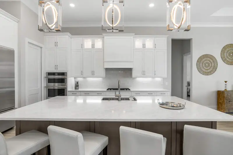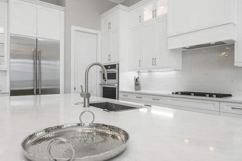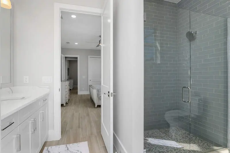 Ceramic tile flooring and quartz countertops