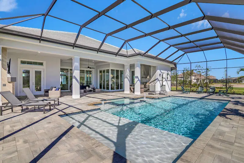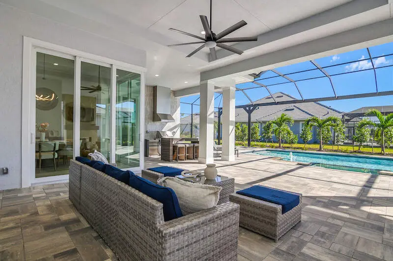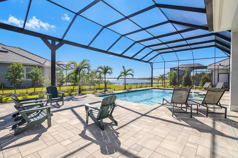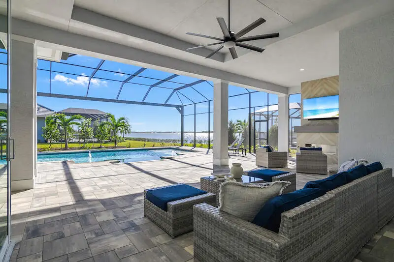 Expansive patio and screened lanai with serene lake views