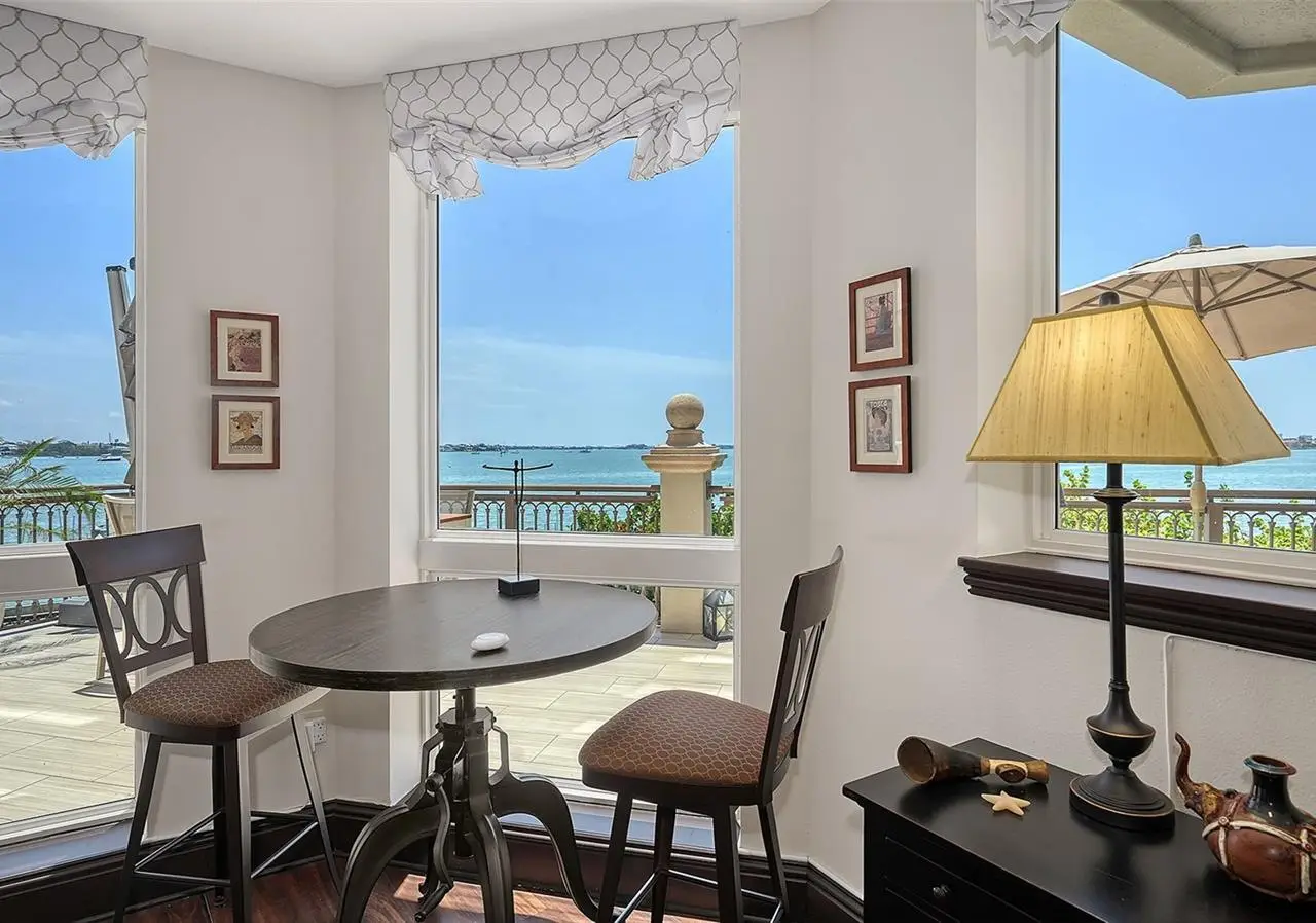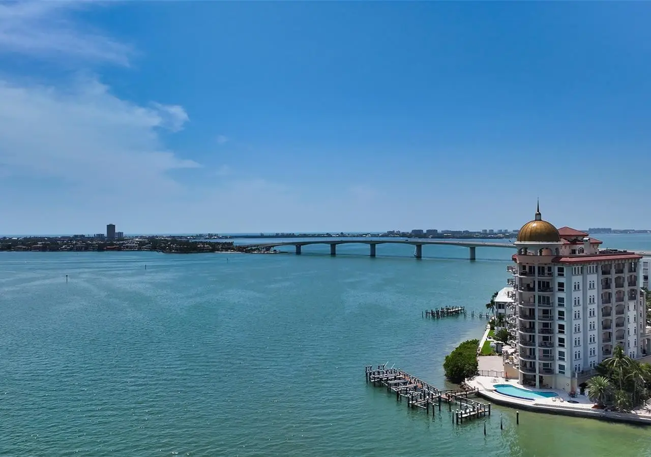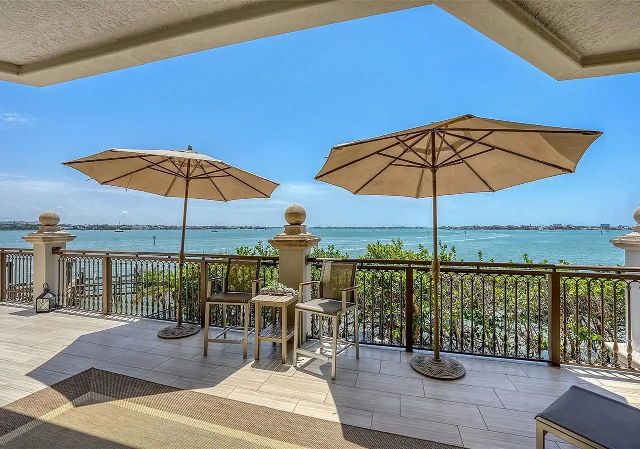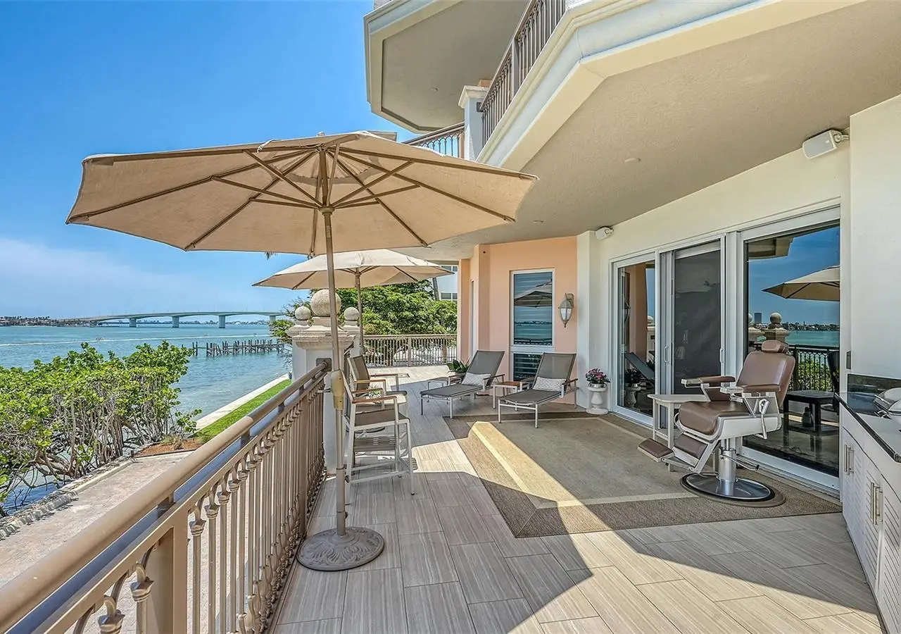 Experience the epitome of elegance and timeless sophistication in this exquisitely appointed residence at the exclusive Grande Riviera, a breathtaking architectural gem nestled in the prestigious Golden Gate Point neighborhood. Meticulously maintained, this classic condominium offers panoramic views of Sarasota Bay and the sparkling downtown skyline, setting a new standard for luxury waterfront living. This residence boasts the largest terrace in Grande Riviera, approximately 2300 square feet, providing the ultimate setting for sunsets and entertaining friends and family. One of only 13 exclusive residences, this home offers an intimate and private lifestyle, with a private elevator entrance leading directly to the elegant foyer. Designed for both comfort and grandeur, the residence features arched walkways, rich crown molding, and expansive living spaces ideal for entertaining or quiet reflection. The heart of the home is a remodeled chef’s kitchen, outfitted with a large center island, solid wood cabinetry adorned with sleek black hardware, a quartz backsplash, granite countertops, and a Sub-Zero refrigerator and freezer, as well as a Wolf gas range and double wall oven. Deluxe Laundry room with custom cabinetry and workspace conveniently located near the kitchen. A wet bar with a Sub-Zero wine fridge seamlessly connects the open living space to the elegant dining and living areas, creating a perfect flow for gatherings. Step outside onto the largest private wraparound terrace in the building, where you’ll enjoy breathtaking, unobstructed views of the bay. This is truly one of the most distinguished outdoor living spaces in the complex. The owners’ suite is a serene retreat, featuring dual walk-in closets with custom built-ins, and a spa-like bathroom with marble floors, a dual quartz vanity, walk-in shower with dual showerheads, and a private water closet. The suite also offers direct access to the terrace, allowing for peaceful mornings with stunning bay views. The guest suite boasts a private terrace entry, en suite bath, and walk-in closet, while a versatile den with double glass doors can serve as an office, sitting room, or additional guest space. Additional features include a private, deeded two-car garage with storage, resort-style pool, rooftop terrace, boat docks, on-site management, and private secured access. This is a rare opportunity to own a distinguished waterfront home in one of Sarasota’s most coveted locations, a residence that masterfully blends classic design, modern comforts, and breathtaking surroundings.