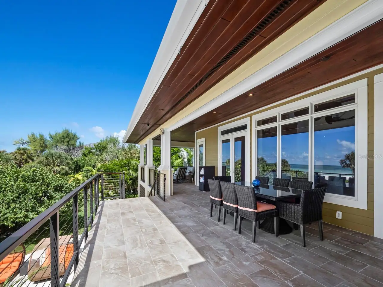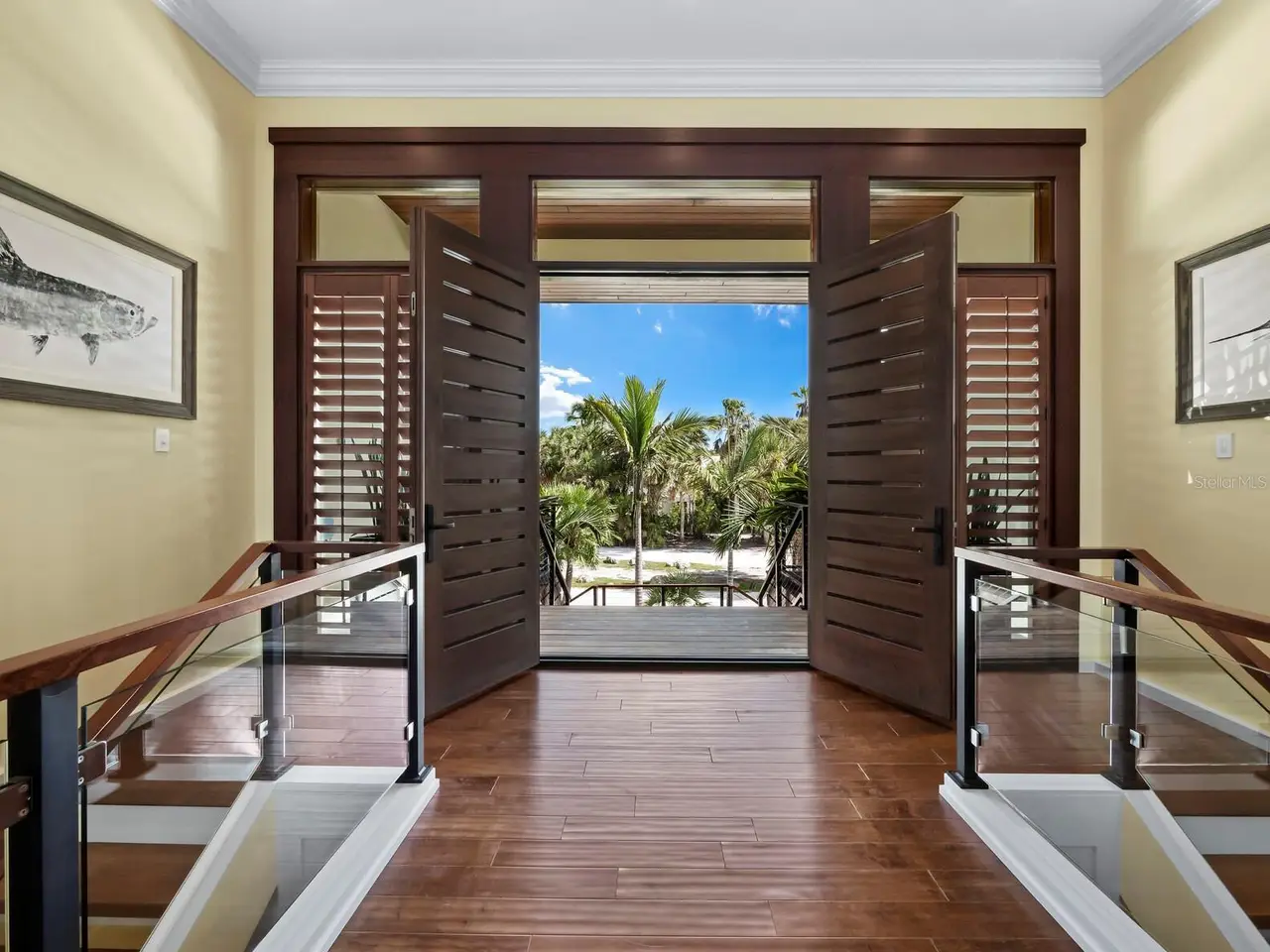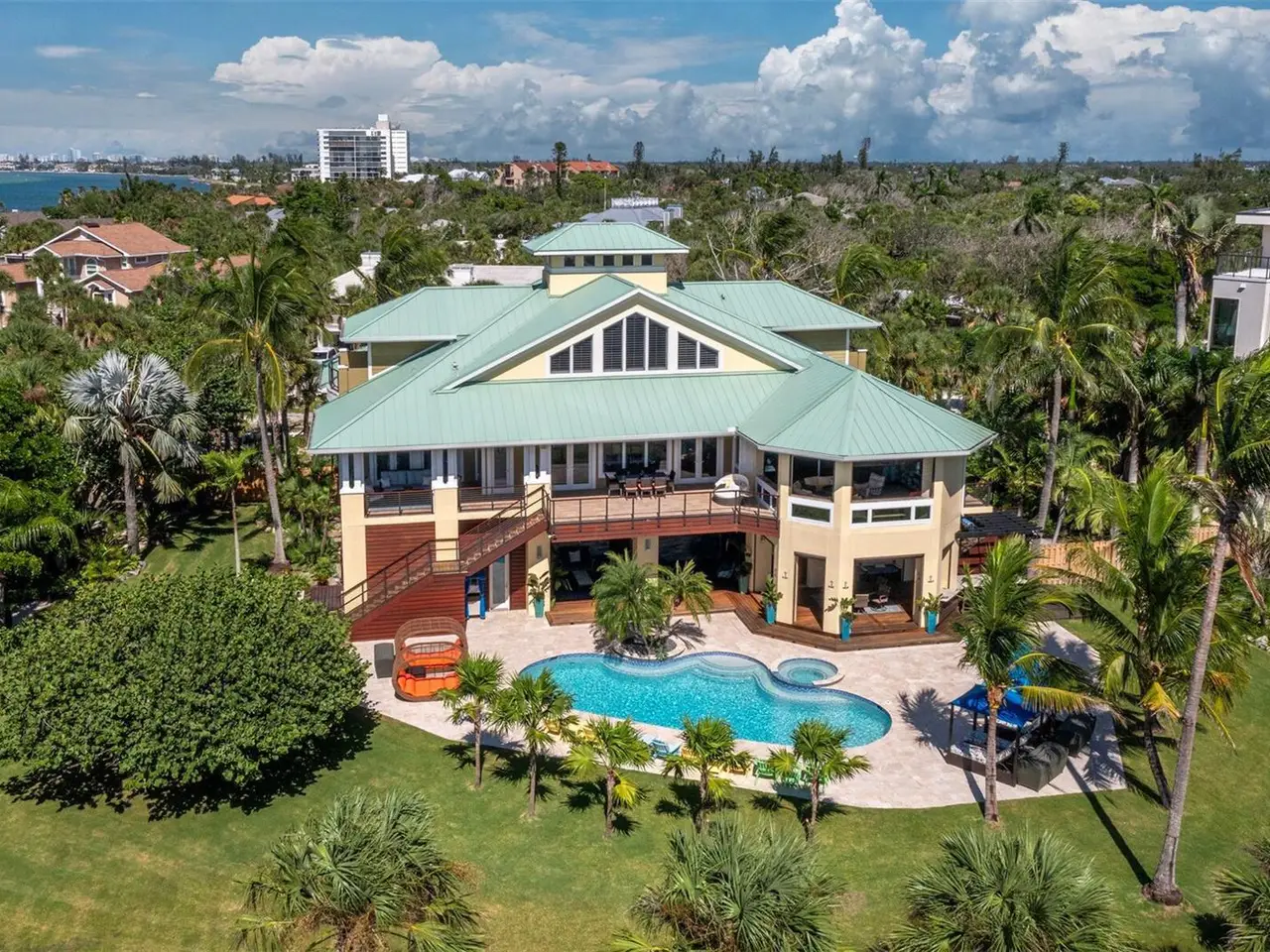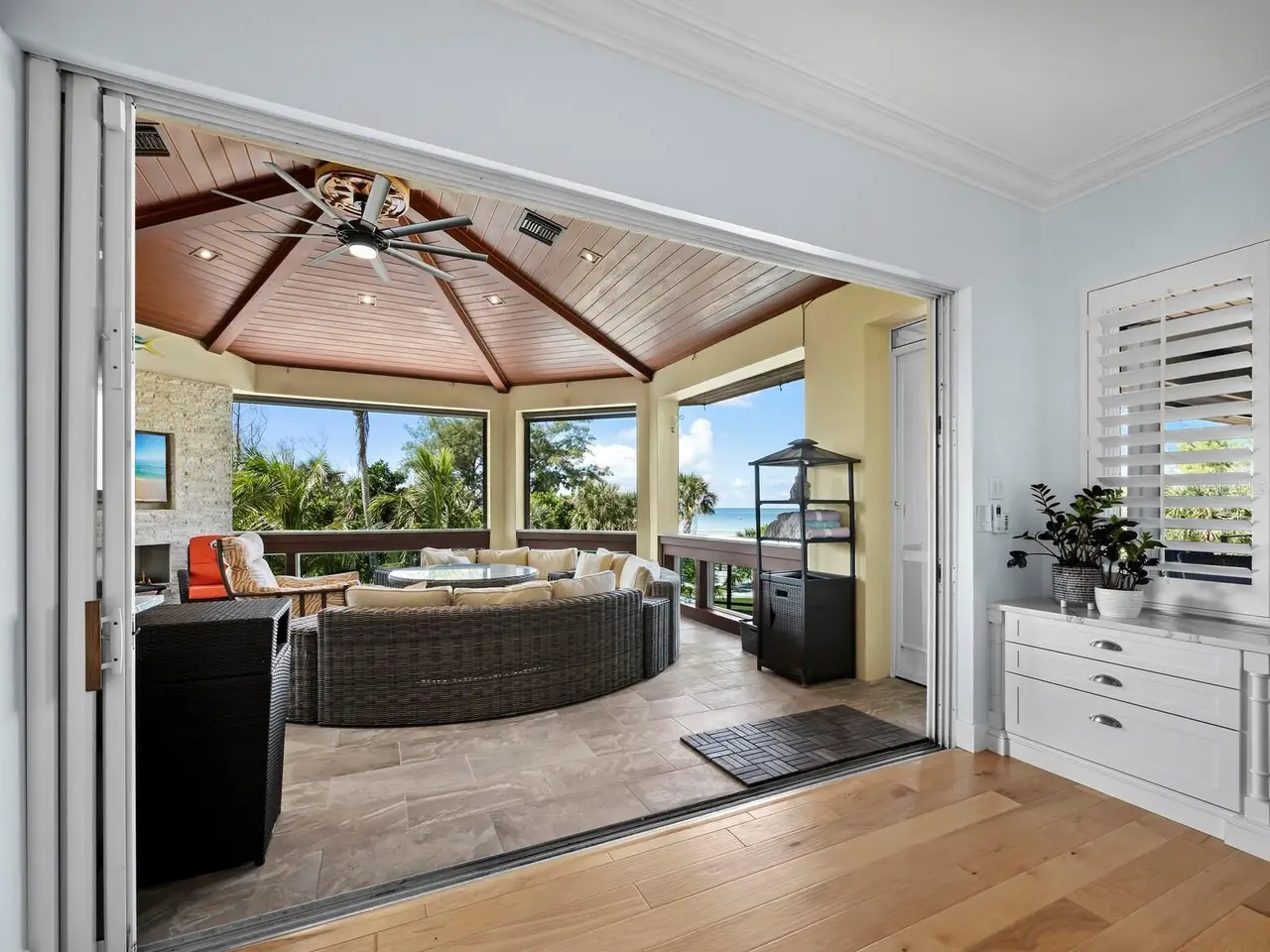 Welcome to this extraordinary Gulf-front estate located in one of Siesta Key’s most exclusive enclaves. Situated on a full acre in the private Sandy Hook community, this fully renovated, turnkey residence offers over 5,000 square feet of refined living space and more than 3,000 square feet of covered outdoor areas, all just a short stroll from Siesta Key Village and with direct access to a private community beach. Inside, the layout features five en-suite bedrooms, two powder baths, a dedicated office, and a three-car garage with beach cruisers and kayaks included. Floor-to-ceiling Andersen impact windows frame panoramic Gulf views, while rich finishes like Sapele mahogany siding, IPE hardwood decking, and a custom Pecky Cypress entertainment system reflect the home’s elevated craftsmanship. The chef’s kitchen is a showpiece, centered around a Labradorite Lumarian Blue granite island imported from Brazil, with Wolf, Miele, and Sub-Zero appliances throughout. The spa-inspired primary suite includes a waterfall feature wall, dual curbless shower, lighted soaking tub, and Toto smart toilets. A private elevator and full smart-home system ensure ease and efficiency. Outdoor living is exceptional, with a heated saltwater pool and Jacuzzi, a fully equipped summer kitchen, a covered outdoor living room with fireplace and TV, a poolside theater with dual fireplaces and TVs, and a sunset-facing gas fire pit. The professionally designed $1M+ tropical landscape includes advanced mosquito-misting and irrigation systems for effortless maintenance. With direct access to a private, resident-only beach and an ideal location just minutes from restaurants, shopping, and entertainment, this one-of-a-kind estate offers a rare opportunity to experience the best of coastal living on Siesta Key. Designed for elevated living and effortless enjoyment, 26 Sandy Hook Road S is more than a home—it is a fully realized Gulf-front sanctuary.