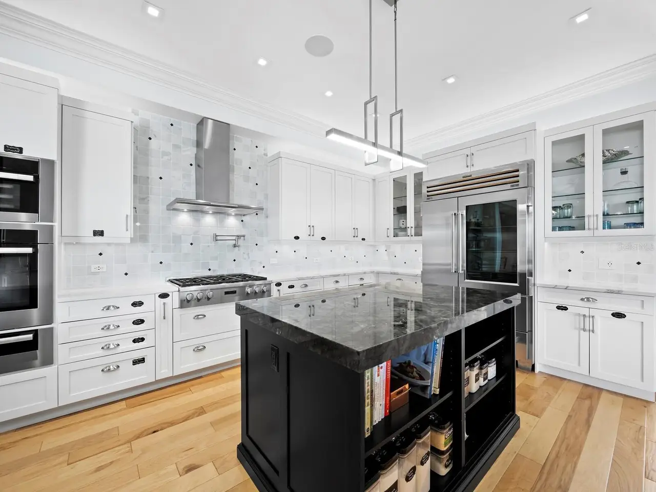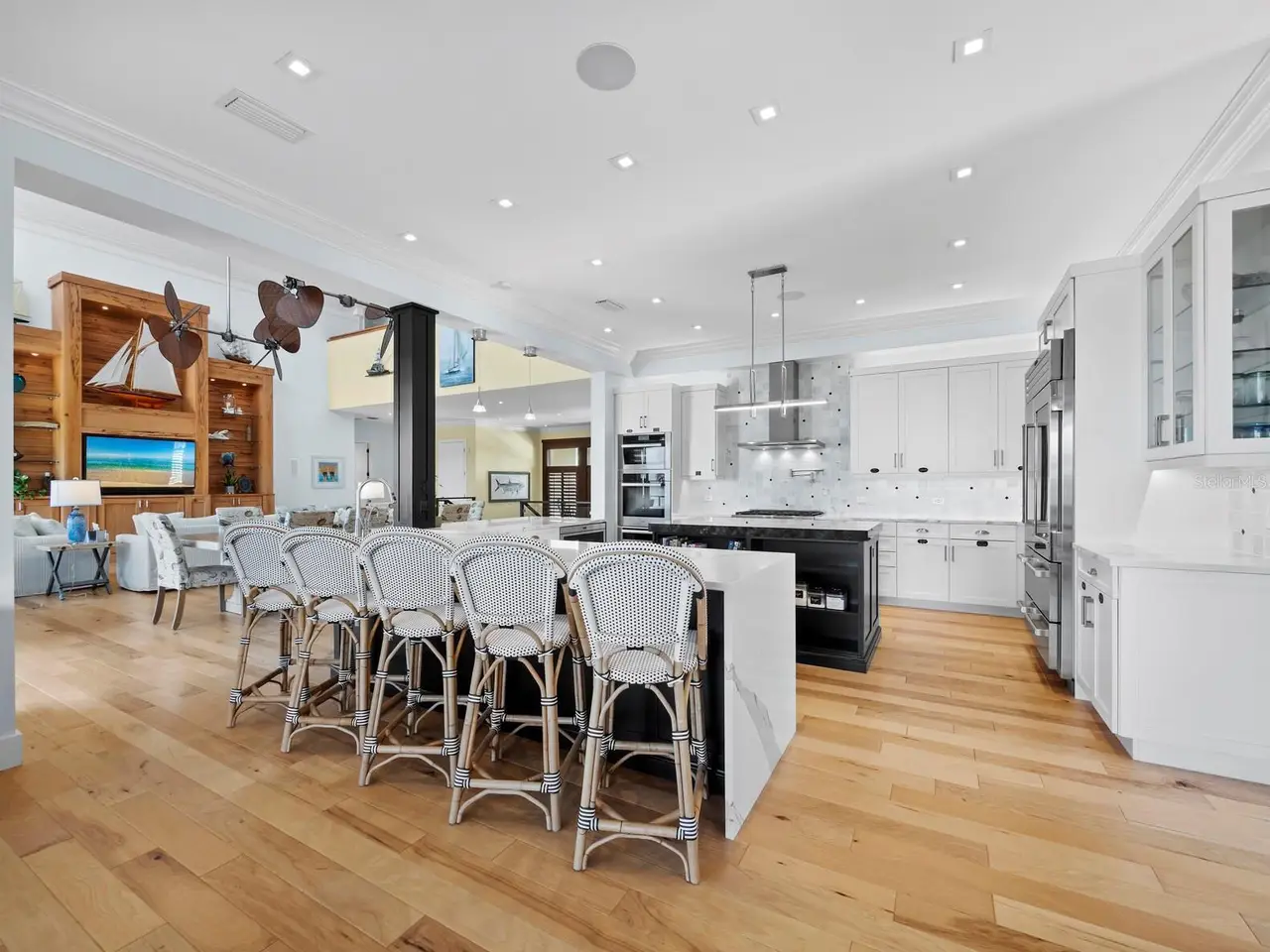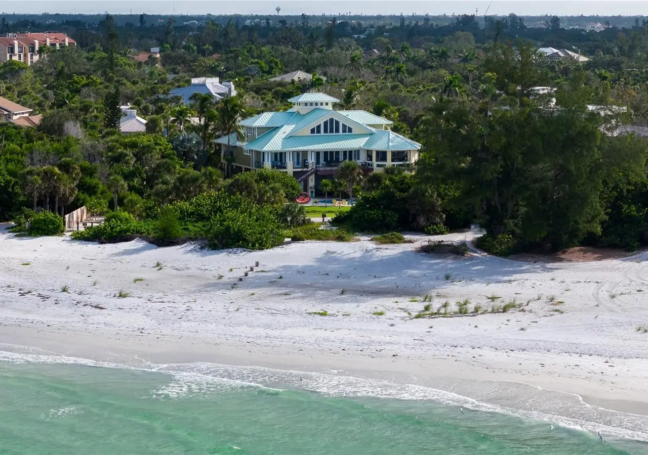 Welcome to this extraordinary Gulf-front estate located in one of Siesta Key’s most exclusive enclaves. Situated on a full acre in the private Sandy Hook community, this fully renovated, turnkey residence offers over 5,000 square feet of refined living space and more than 3,000 square feet of covered outdoor areas, all just a short stroll from Siesta Key Village and with direct access to a private community beach. Inside, the layout features five en-suite bedrooms, two powder baths, a dedicated office, and a three-car garage with beach cruisers and kayaks included. Floor-to-ceiling Andersen impact windows frame panoramic Gulf views, while rich finishes like Sapele mahogany siding, IPE hardwood decking, and a custom Pecky Cypress entertainment system reflect the home’s elevated craftsmanship. The chef’s kitchen is a showpiece, centered around a Labradorite Lumarian Blue granite island imported from Brazil, with Wolf, Miele, and Sub-Zero appliances throughout. The spa-inspired primary suite includes a waterfall feature wall, dual curbless shower, lighted soaking tub, and Toto smart toilets. A private elevator and full smart-home system ensure ease and efficiency. Outdoor living is exceptional, with a heated saltwater pool and Jacuzzi, a fully equipped summer kitchen, a covered outdoor living room with fireplace and TV, a poolside theater with dual fireplaces and TVs, and a sunset-facing gas fire pit. The professionally designed $1M+ tropical landscape includes advanced mosquito-misting and irrigation systems for effortless maintenance. With direct access to a private, resident-only beach and an ideal location just minutes from restaurants, shopping, and entertainment, this one-of-a-kind estate offers a rare opportunity to experience the best of coastal living on Siesta Key. Designed for elevated living and effortless enjoyment, 26 Sandy Hook Road S is more than a home—it is a fully realized Gulf-front sanctuary.